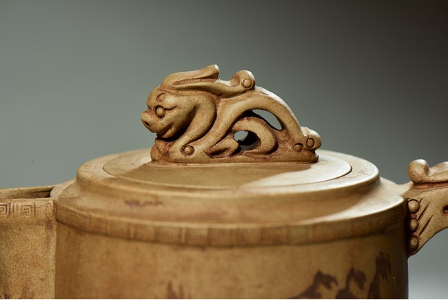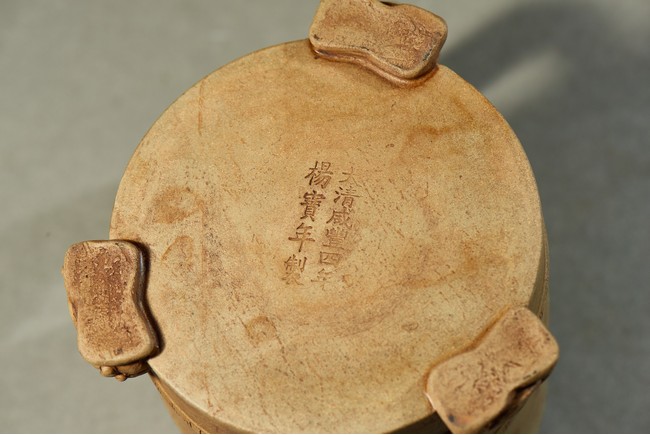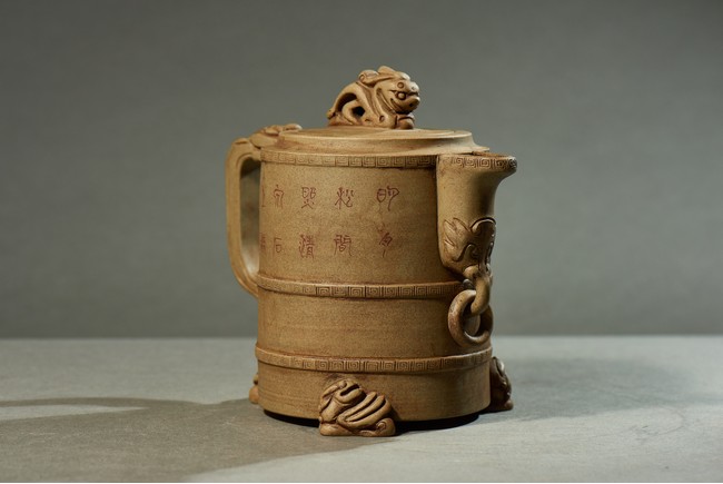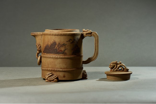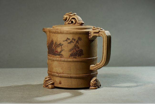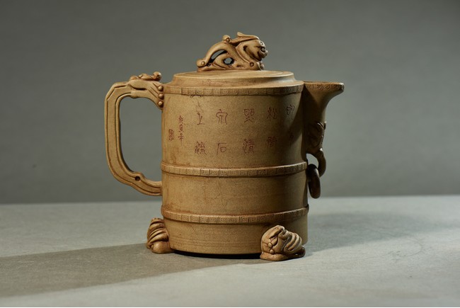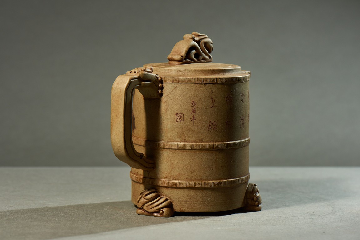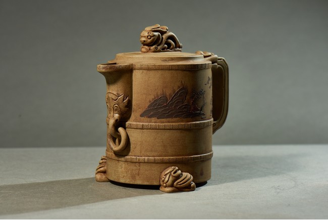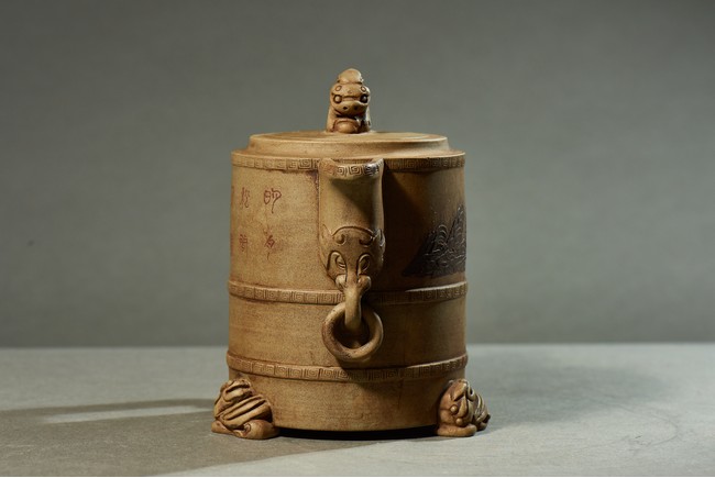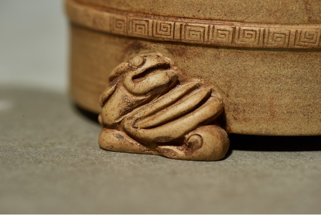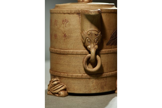 Of cylindrical form, the exterior decorated in shallow relief with landscape scenes and inscription within raised key-fret borders, supported with three mythical beast feet, base with mark.