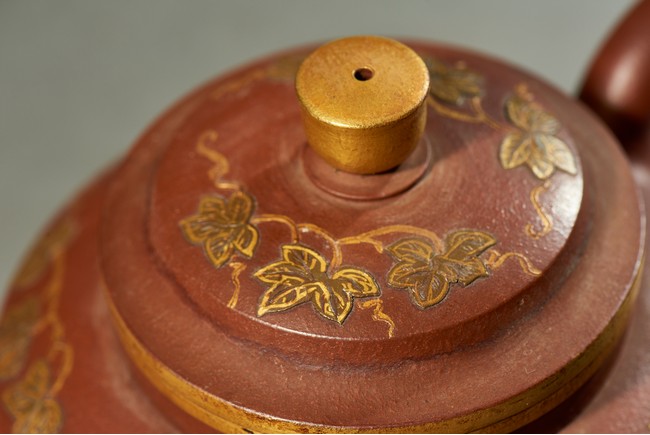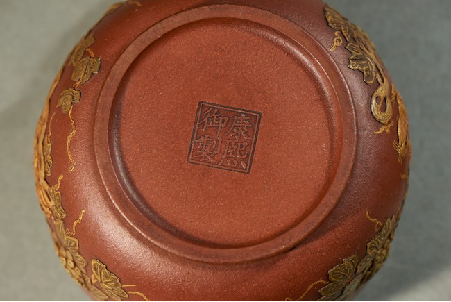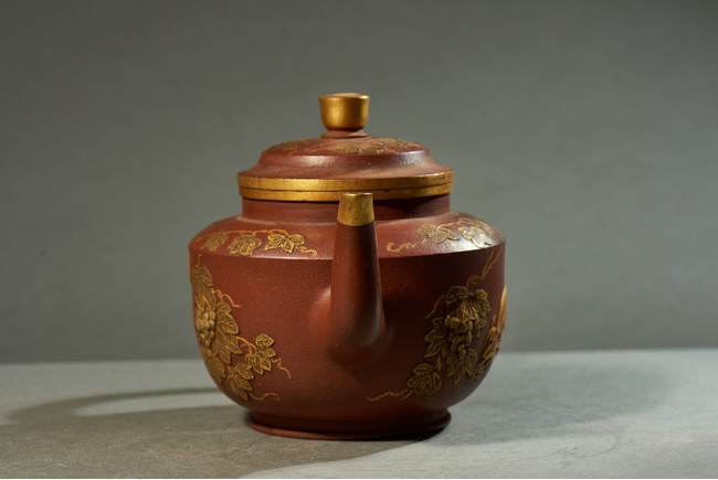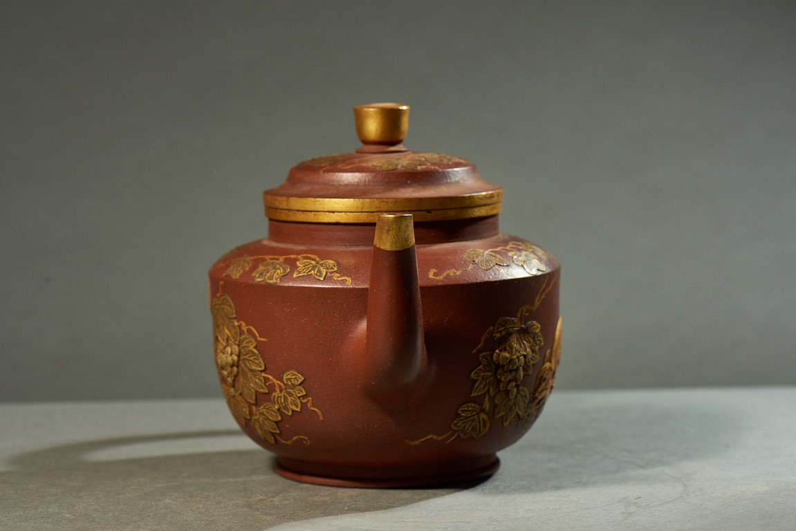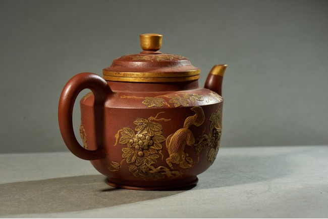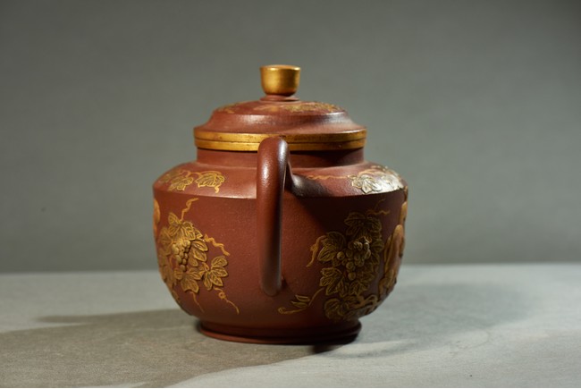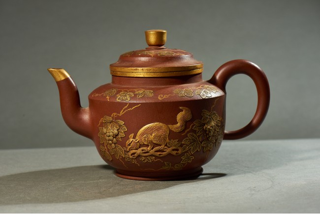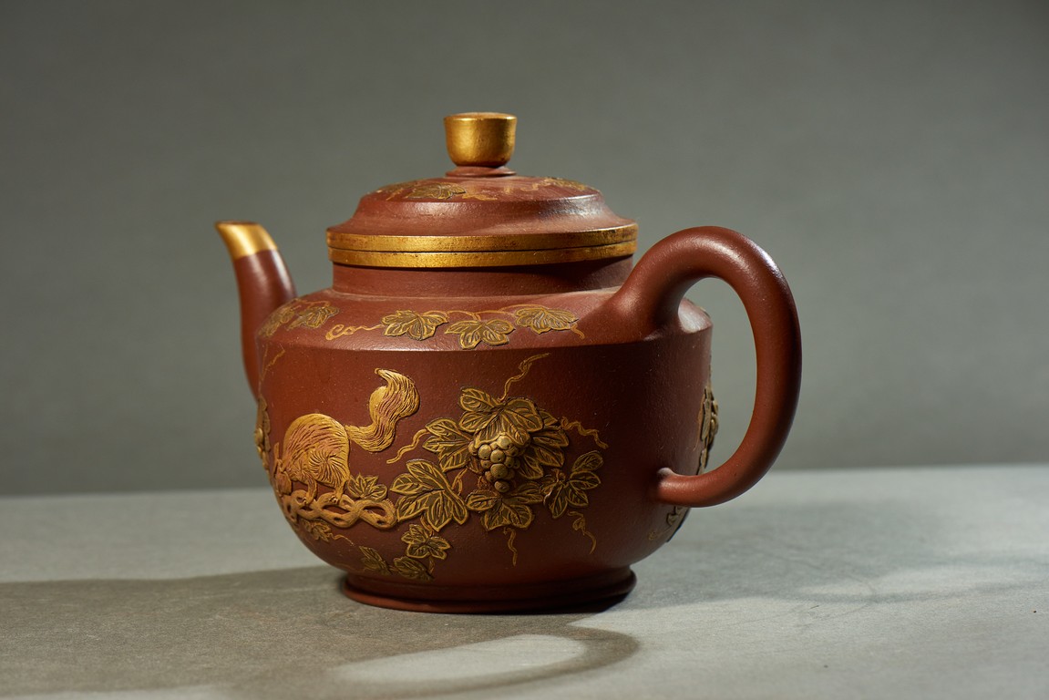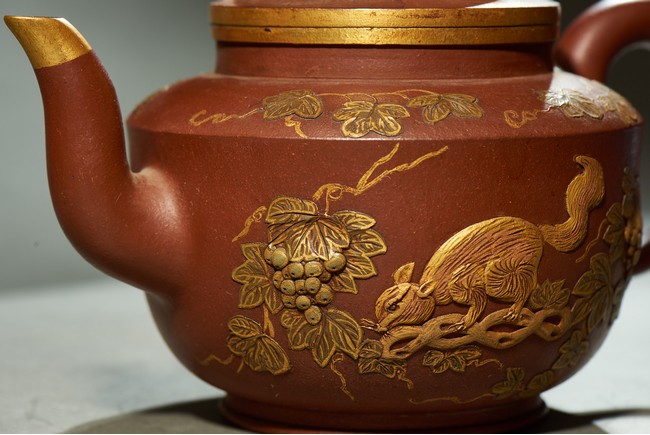 The body moulded with squirrels clambering on grape vines in relief, flanked by arched handle and curved spout, the cover decorated with similar grape vine pattern, finial gilt-painted, base with apocryphal mark.