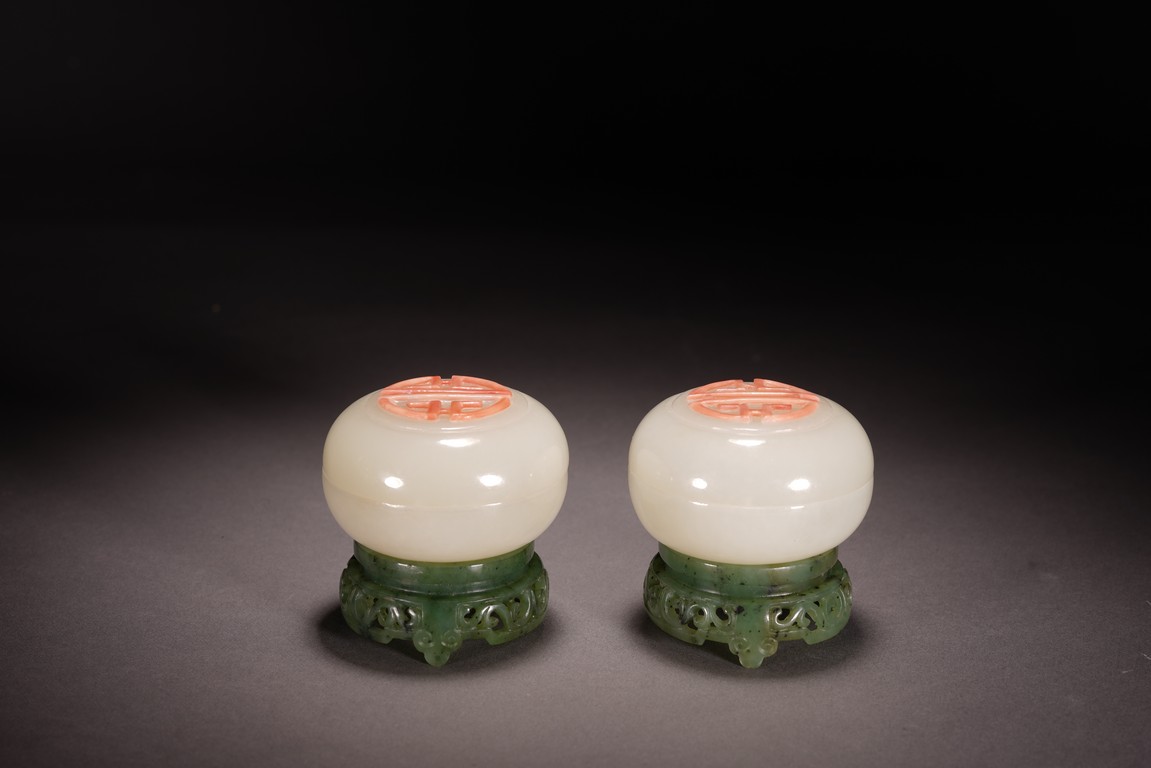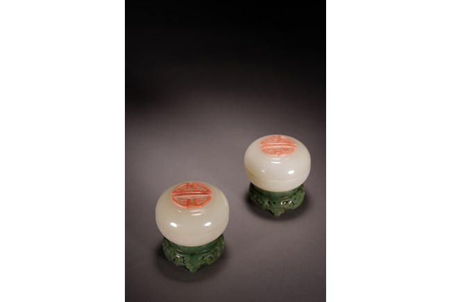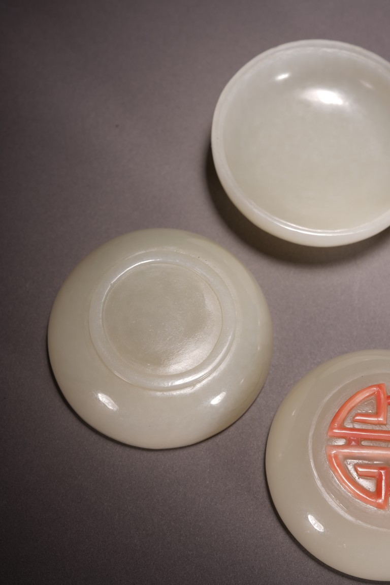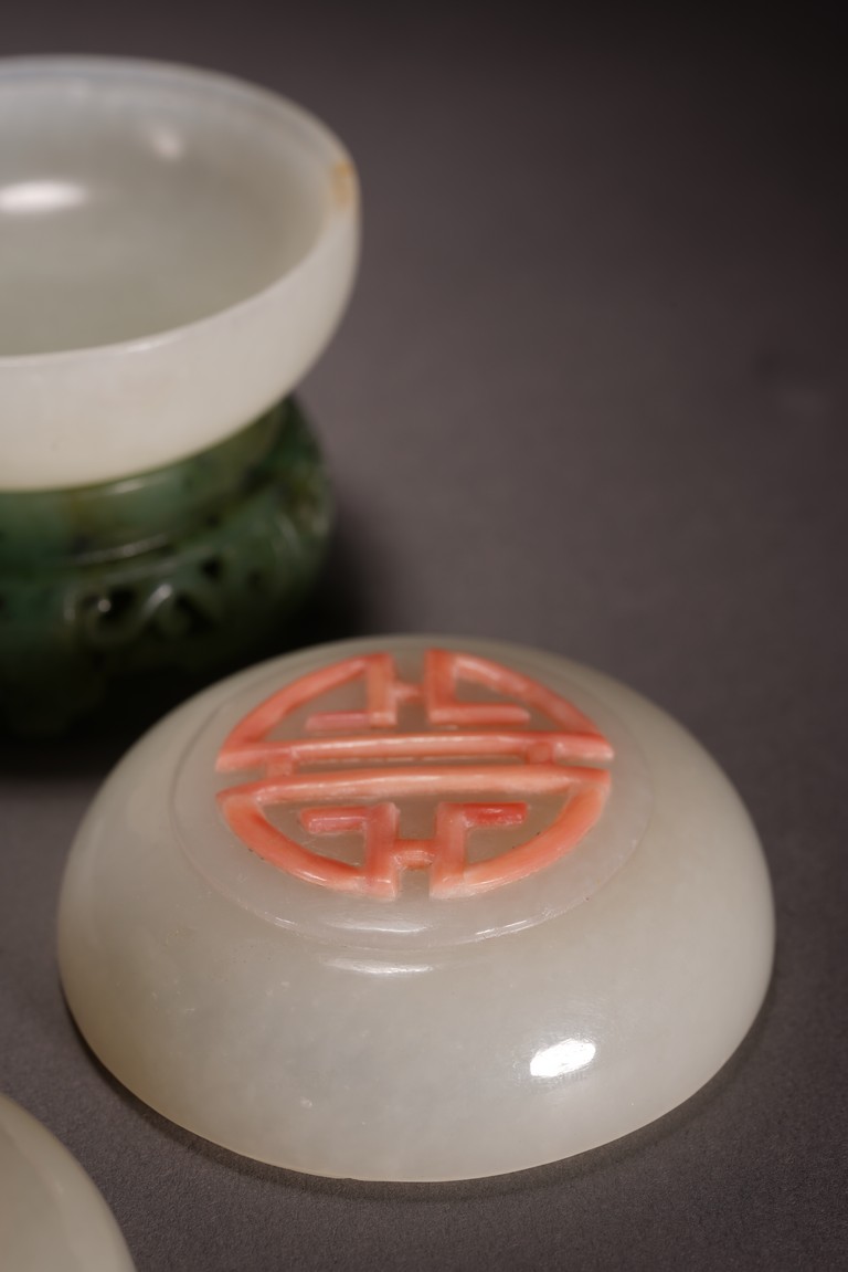 Of circular form, the polished white jade cover carved in relief on the top with stylized shou character, all supported on carved and pierced spinach green jade stand. Qing Dynasty period.