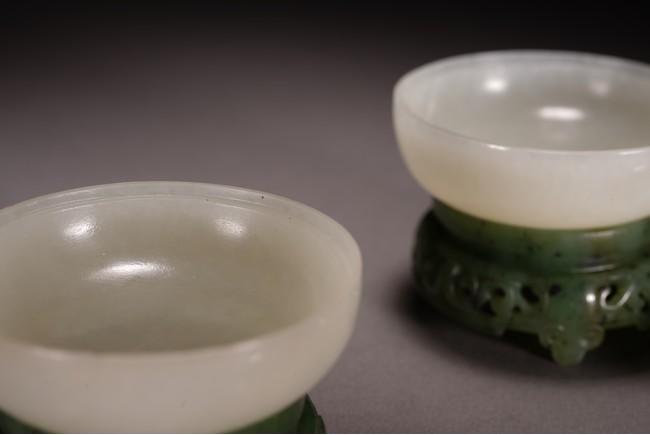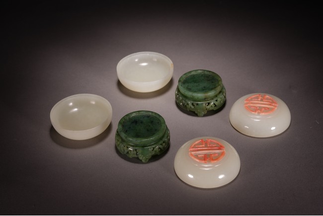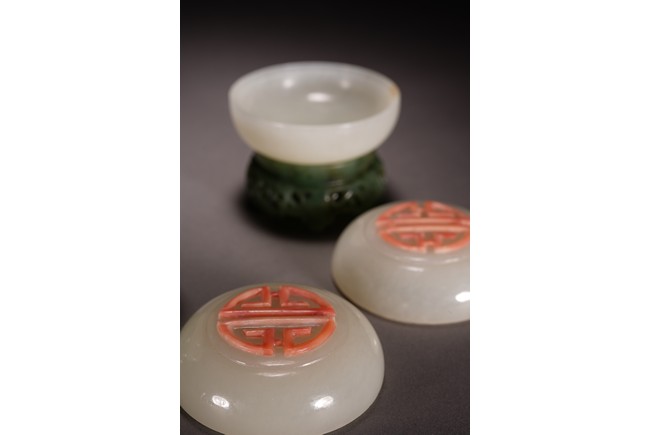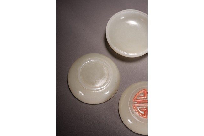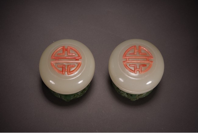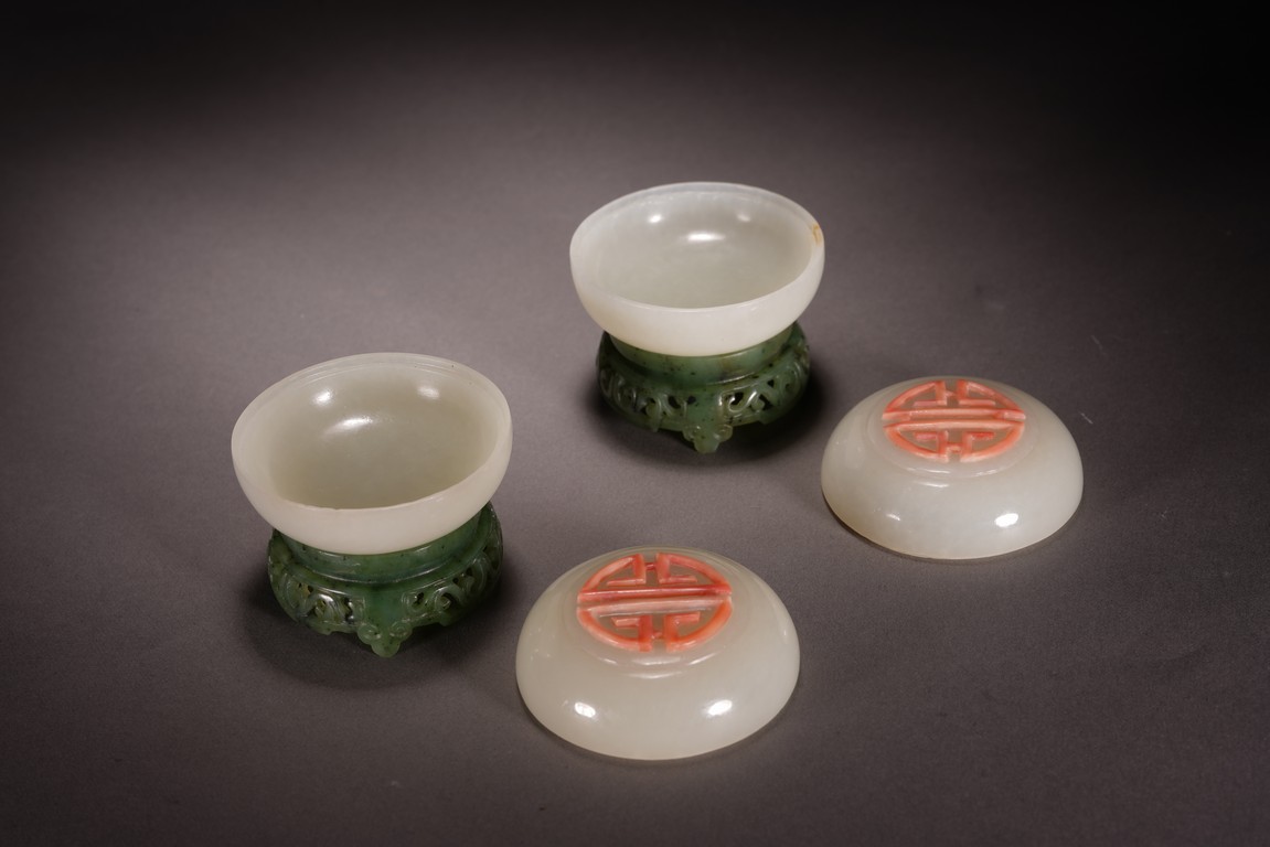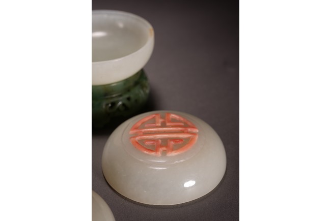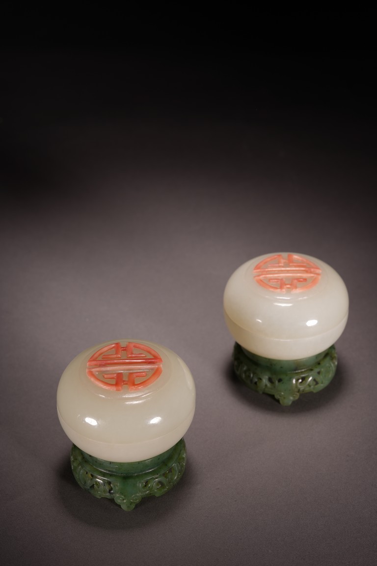 Of circular form, the polished white jade cover carved in relief on the top with stylized shou character, all supported on carved and pierced spinach green jade stand. Qing Dynasty period.