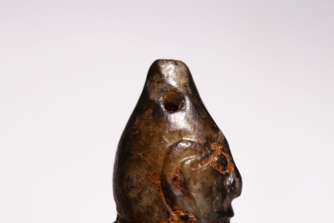 The stone is carved in the round as a kneeling figure. The face is detailed with protruding eyes.