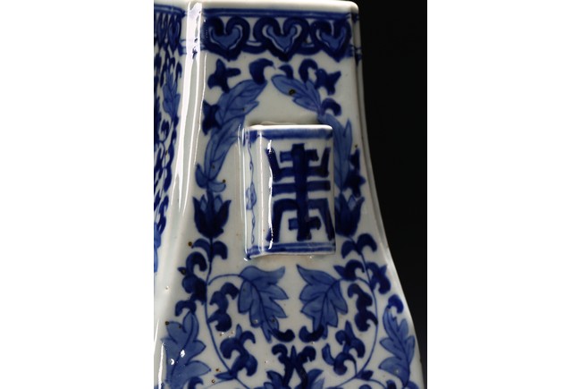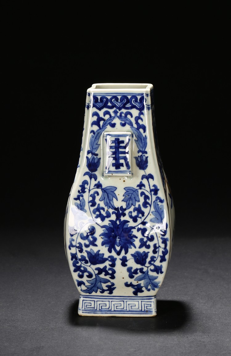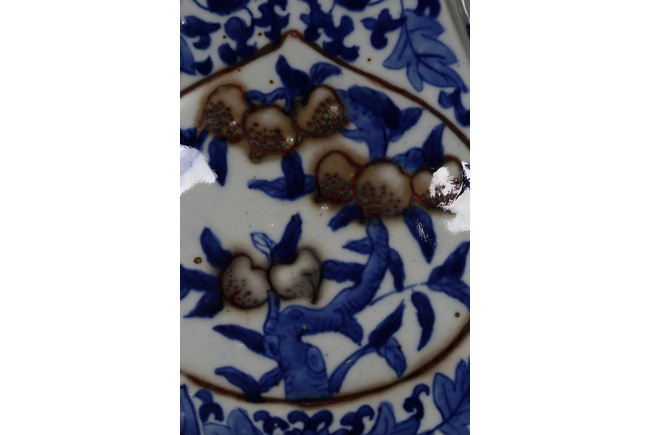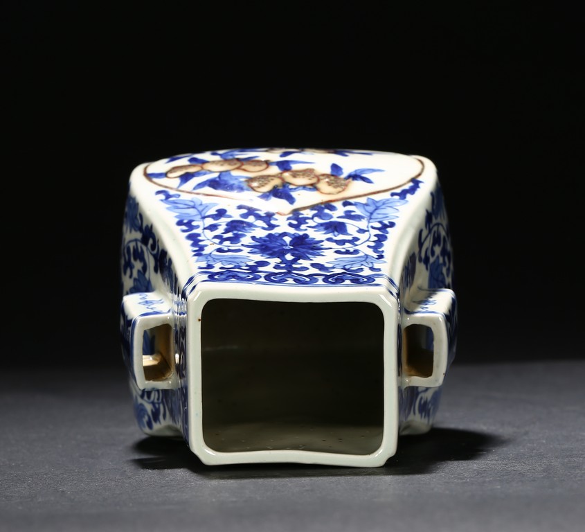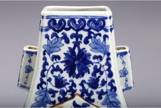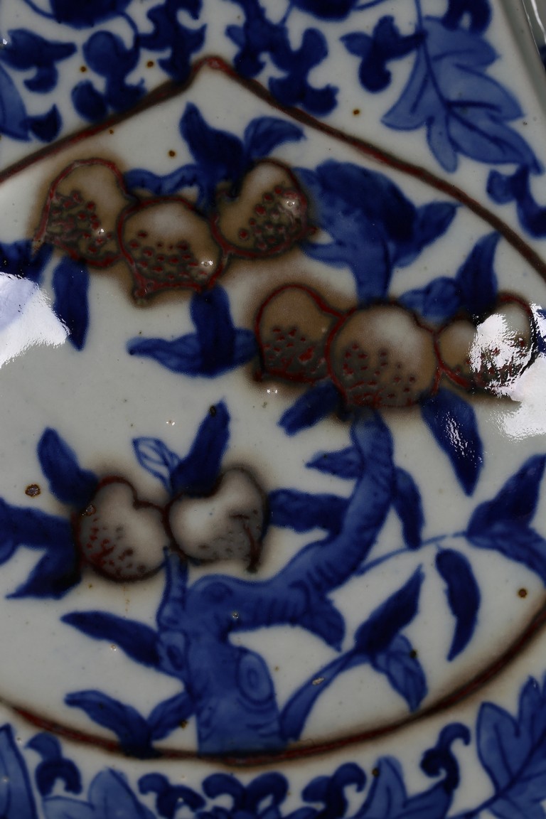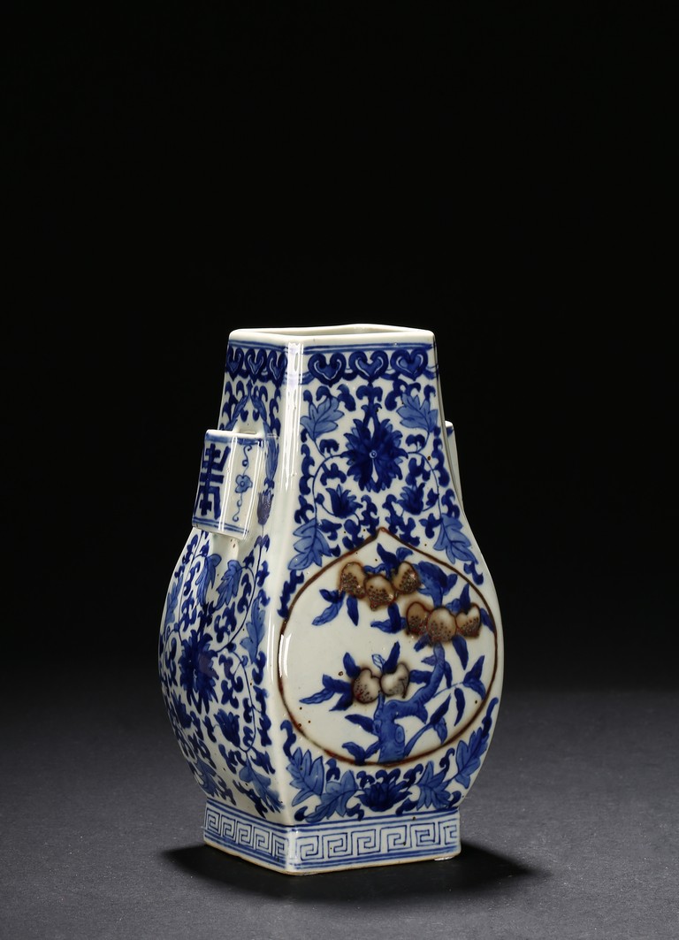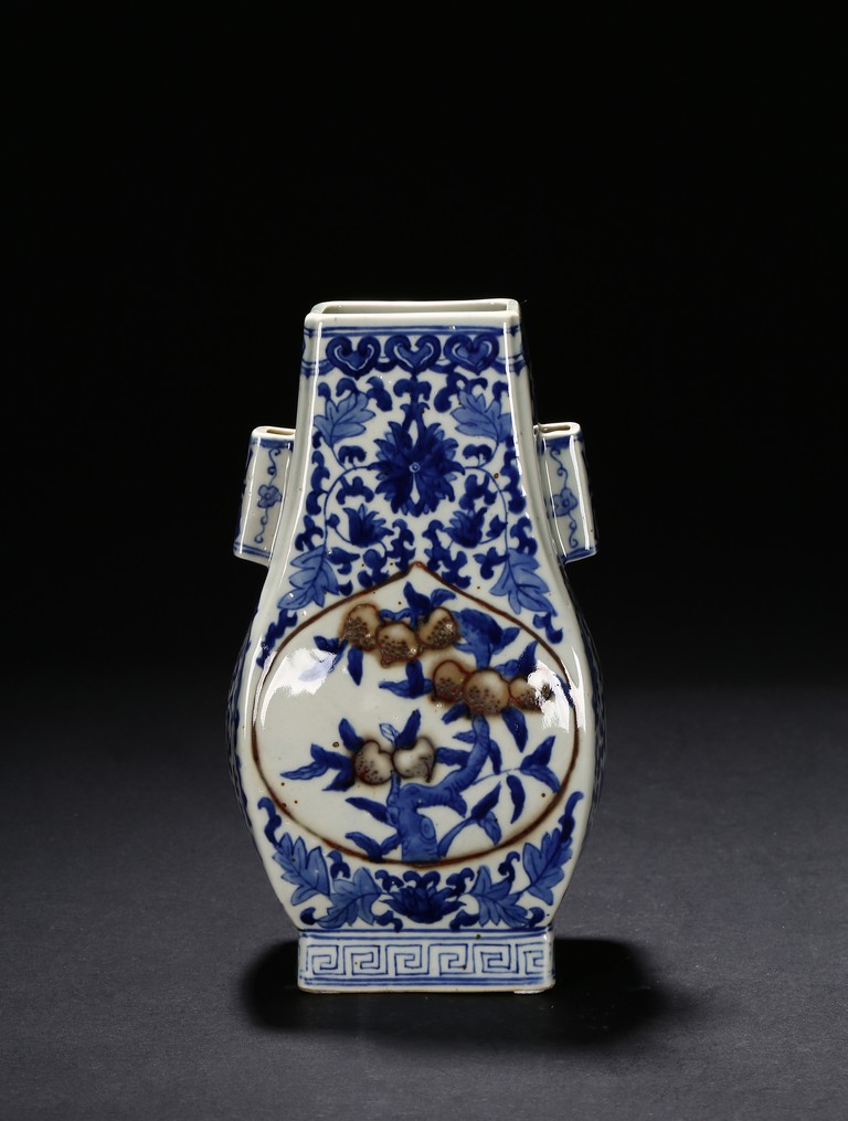 A BLUE AND WHITE 'PEACH' VASE 清 青花釉裡紅貫耳瓶