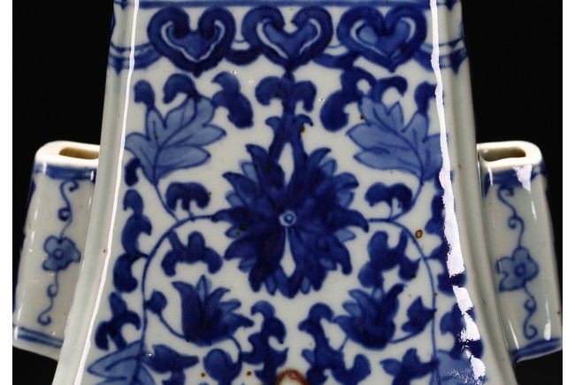 Enamelled with leafy peach and scrolled lotus, neck flanked by two handles. Republic period.
