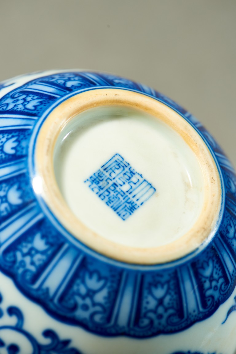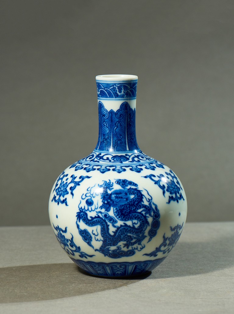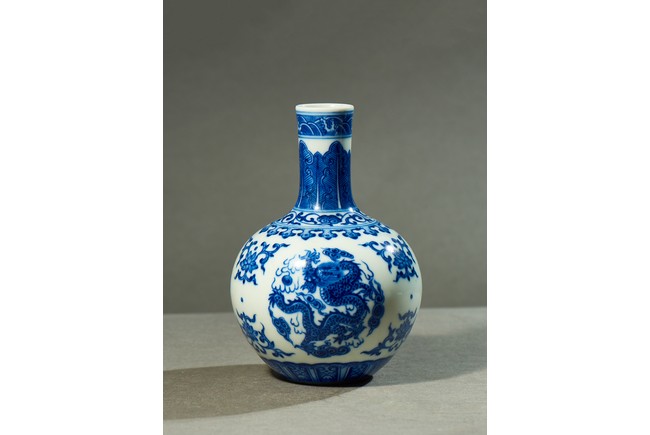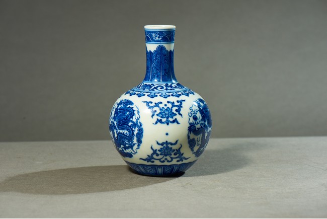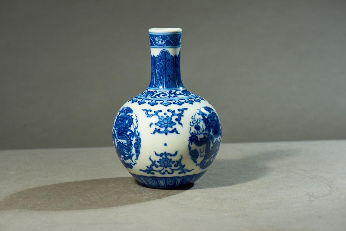 直口、長頸、圓腹、腹下漸收、淺圈足。通體白釉地繪青花紋飾,“海水紋”“芭蕉紋”“如意紋”“纏枝花卉紋”“龍紋”。 “大清乾隆年制”款識。
