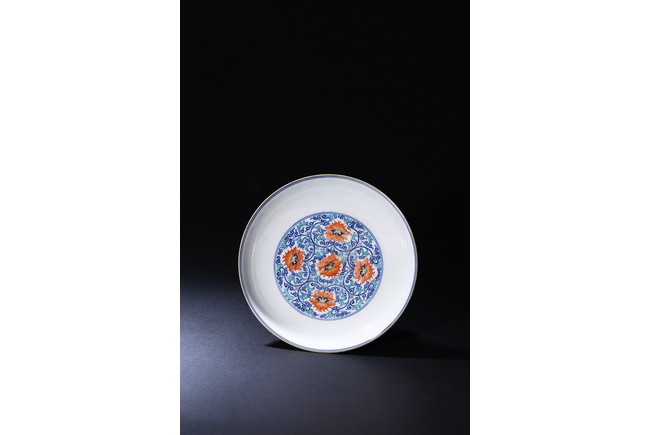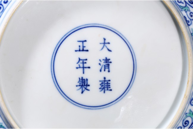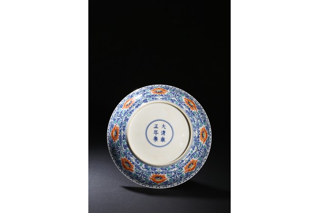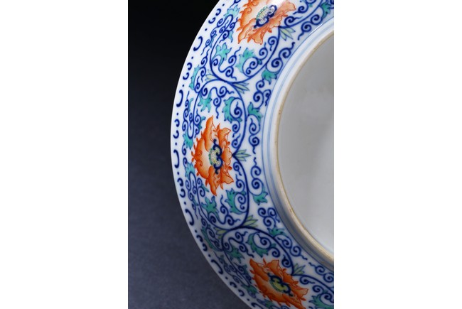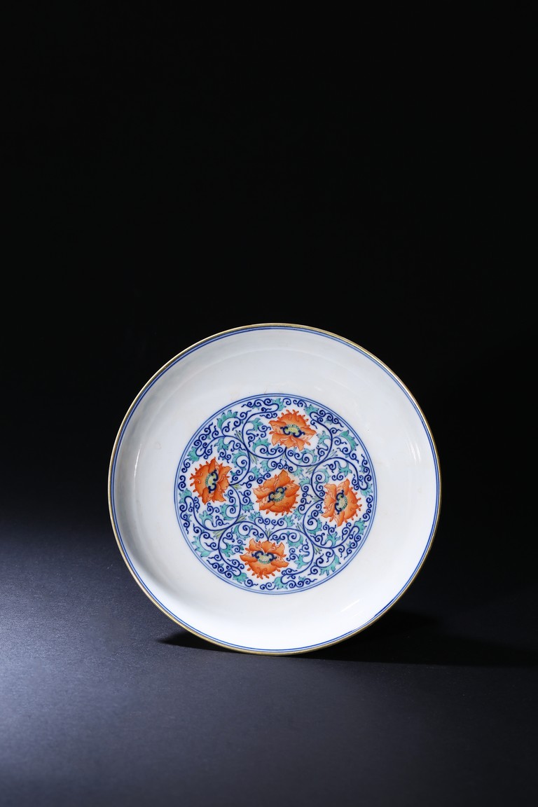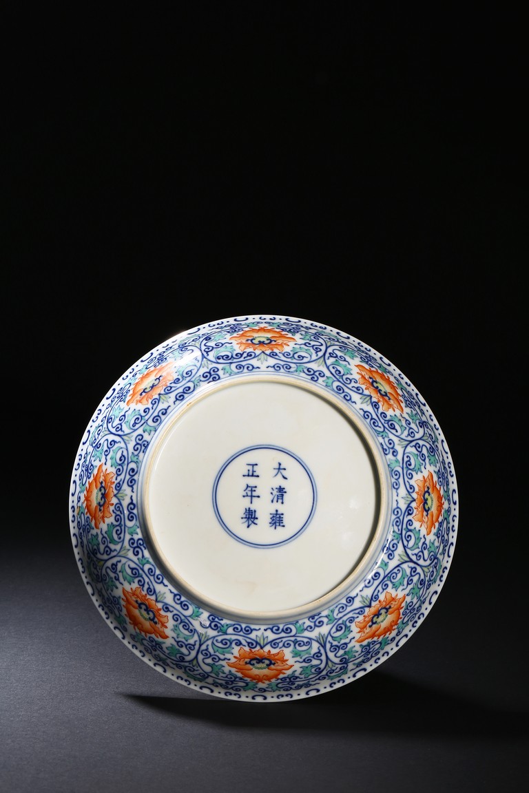 The rounded sides rising from a straight foot to a flaring rim,the central medallion painted in bright enamels over designs in underglaze blue,five stylised flower heads borne on meandering scrolls all enclosed in a double-line border repeated at the rim,the exterior decorated with further flower heads amidst dense scrolling tendrils,the base inscribed in underglaze blue with a six-character seal mark. Qing Dynasty period.