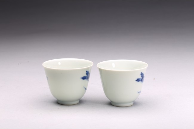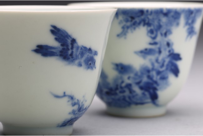 Each cup is finely potted with deep sides rising to a slightly everted rim, the exterior decorated with a magpie flying towards two magpies perching on branch, base with mark. Republic period.