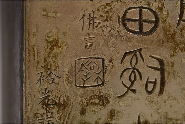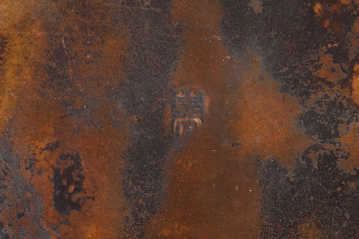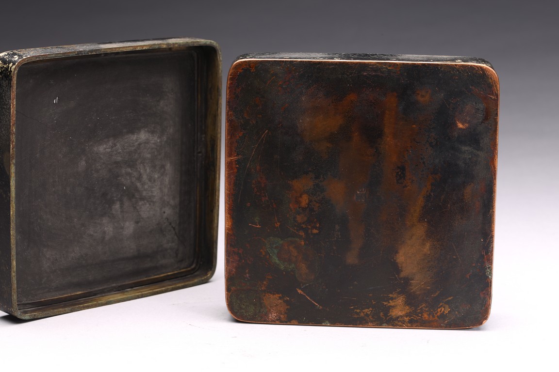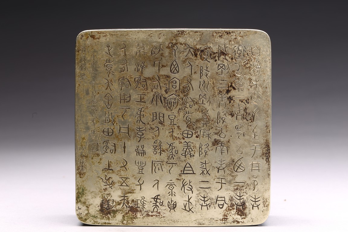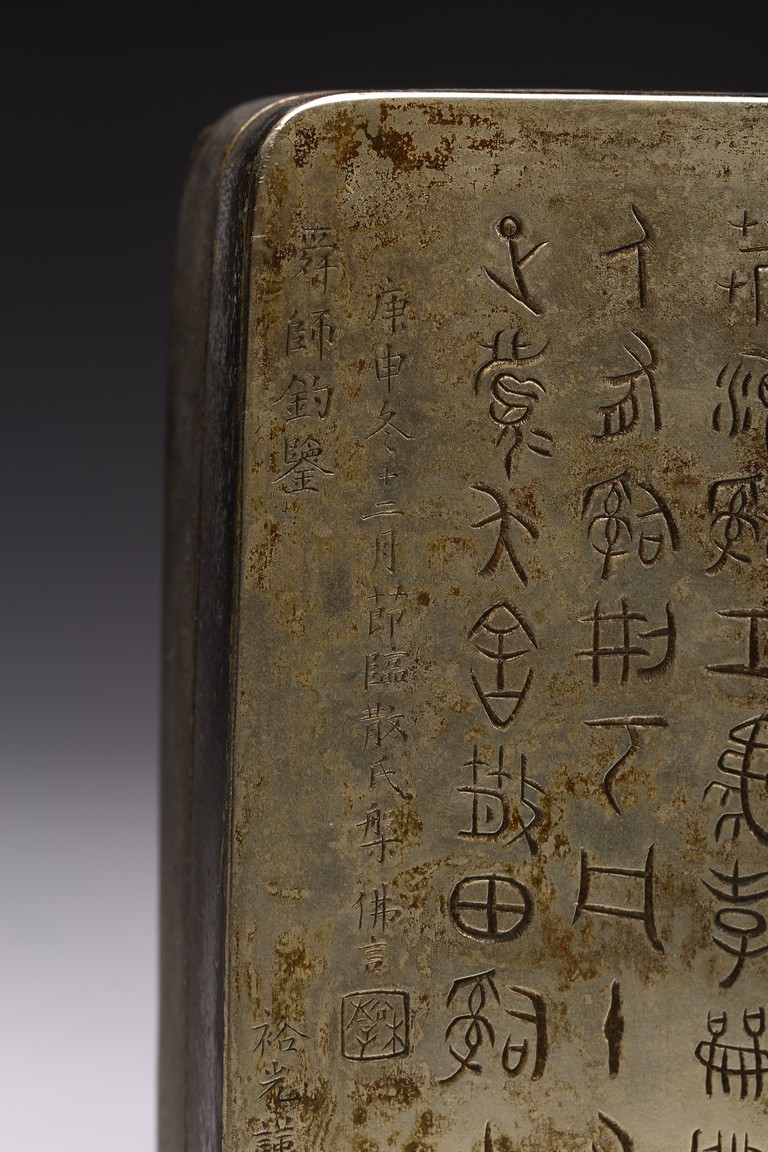 Of rounded rectangular form, the box cover inscribed in ancient oracle bone script calligraphy and inscribed and signed Yu Guang and attributed to Shun Shi. Qing Dynasty period.