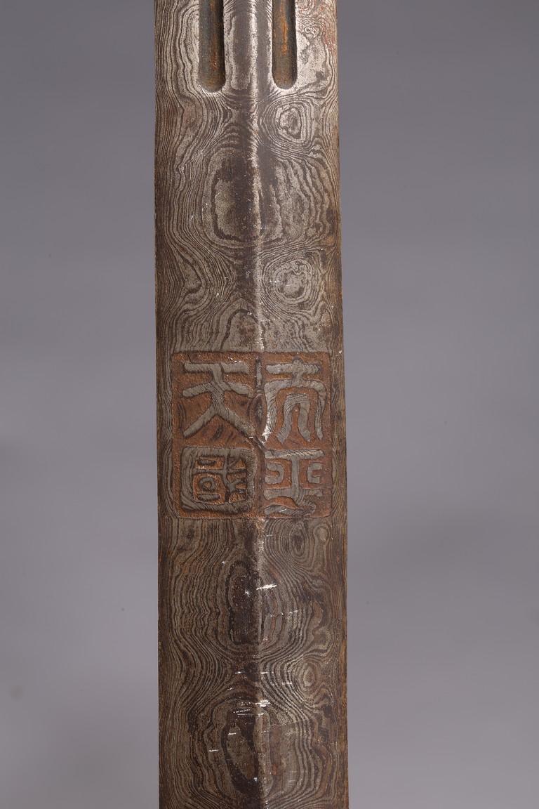 The straight double-edged steel blade steadily tapering towards a fine tip, the blade impressed with a four character mark Tai Ping Tian Guo near the hilt, the tapering hilt without and pommel. Late Qing Dynasty period.