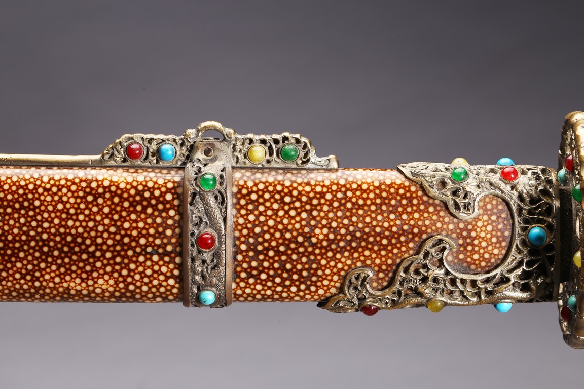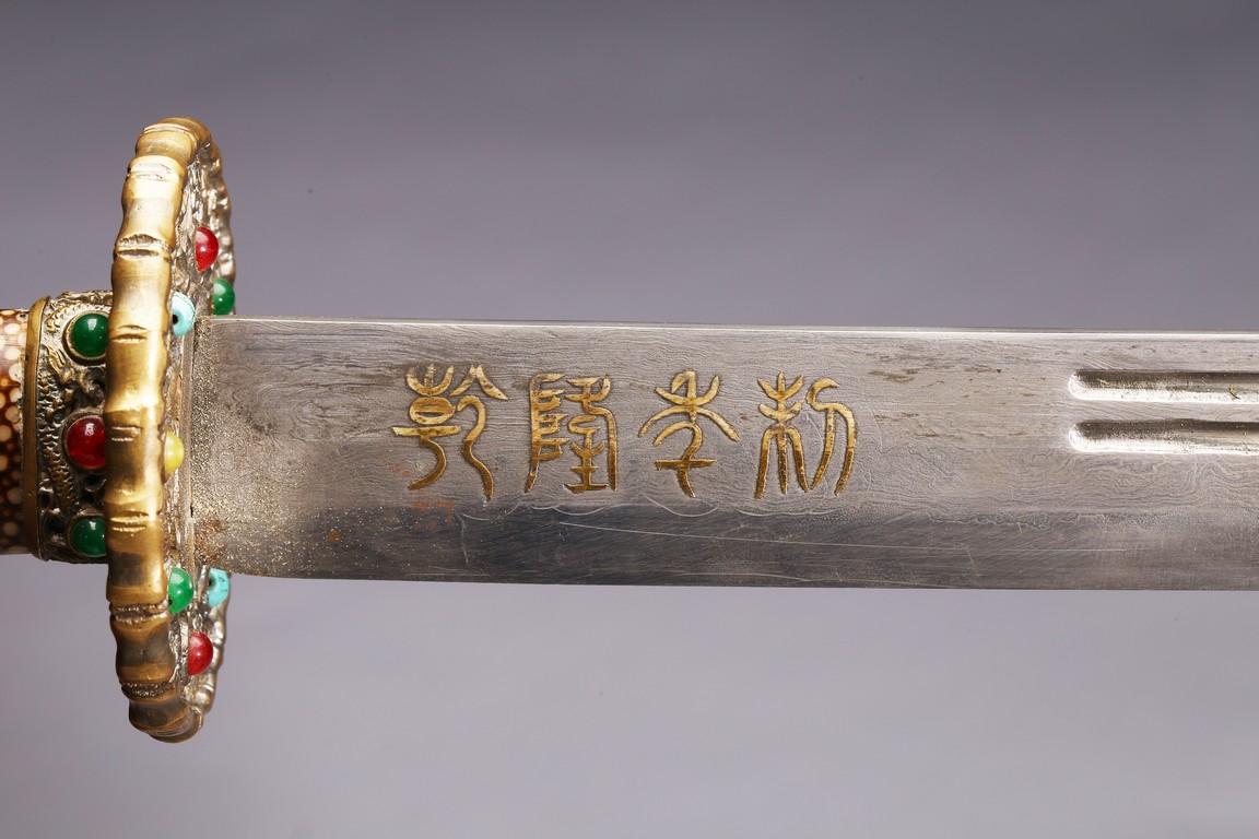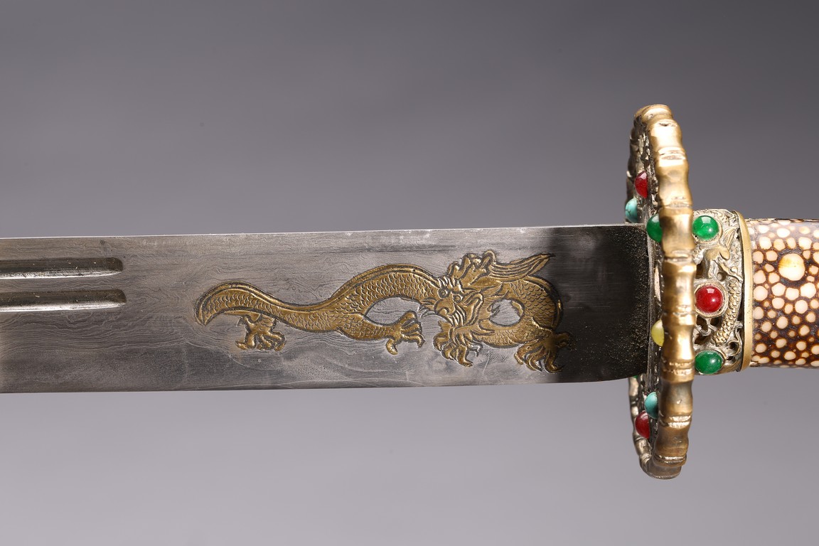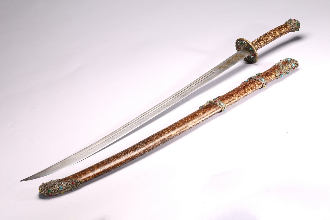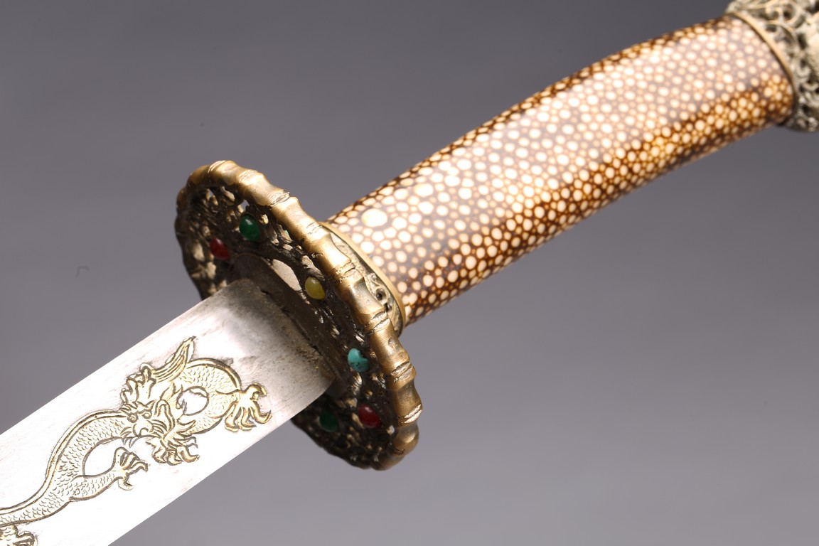The long slightly curved metal blade tapering to a pointed tip, the steel blade decorated near the hilt with inlaid gold depicting dragon on one side and four character Qianlong mark on the reverse, the handle and scabbard covered in brown and creamy white shagreen decorated with gem beads. Qing Dynasty period.