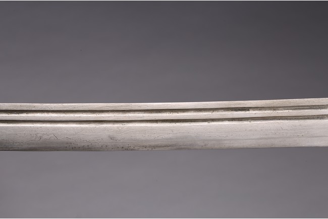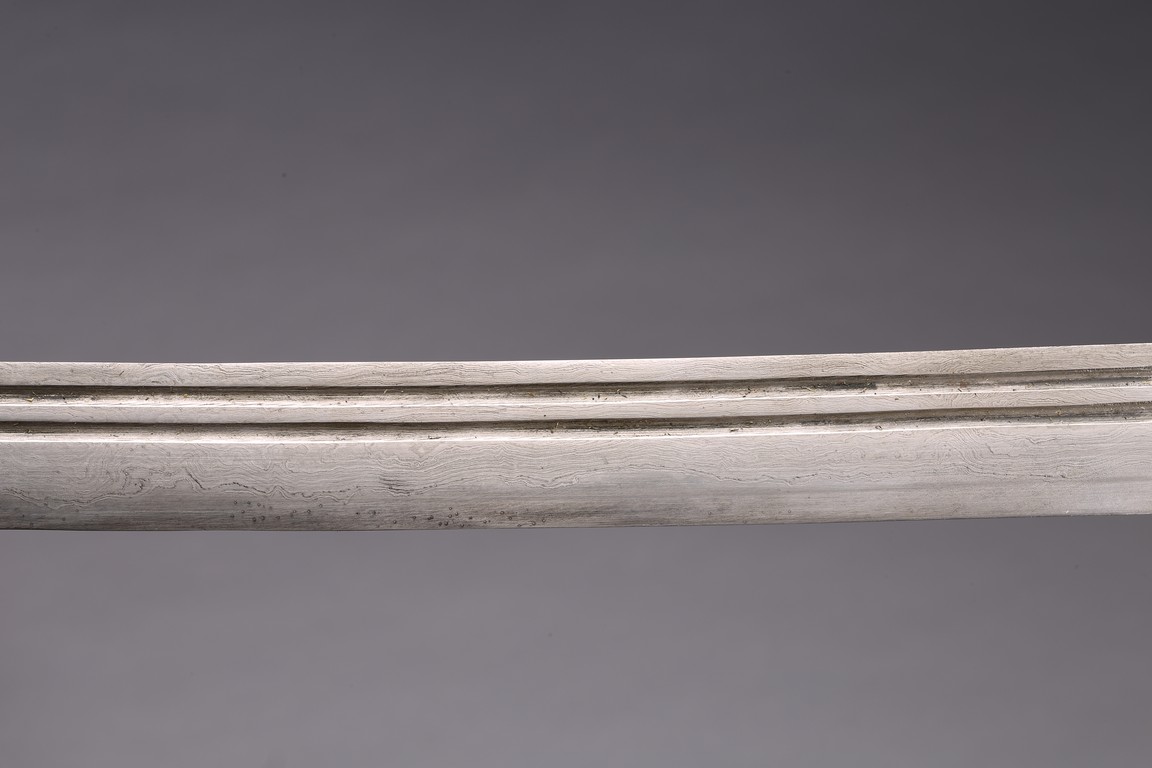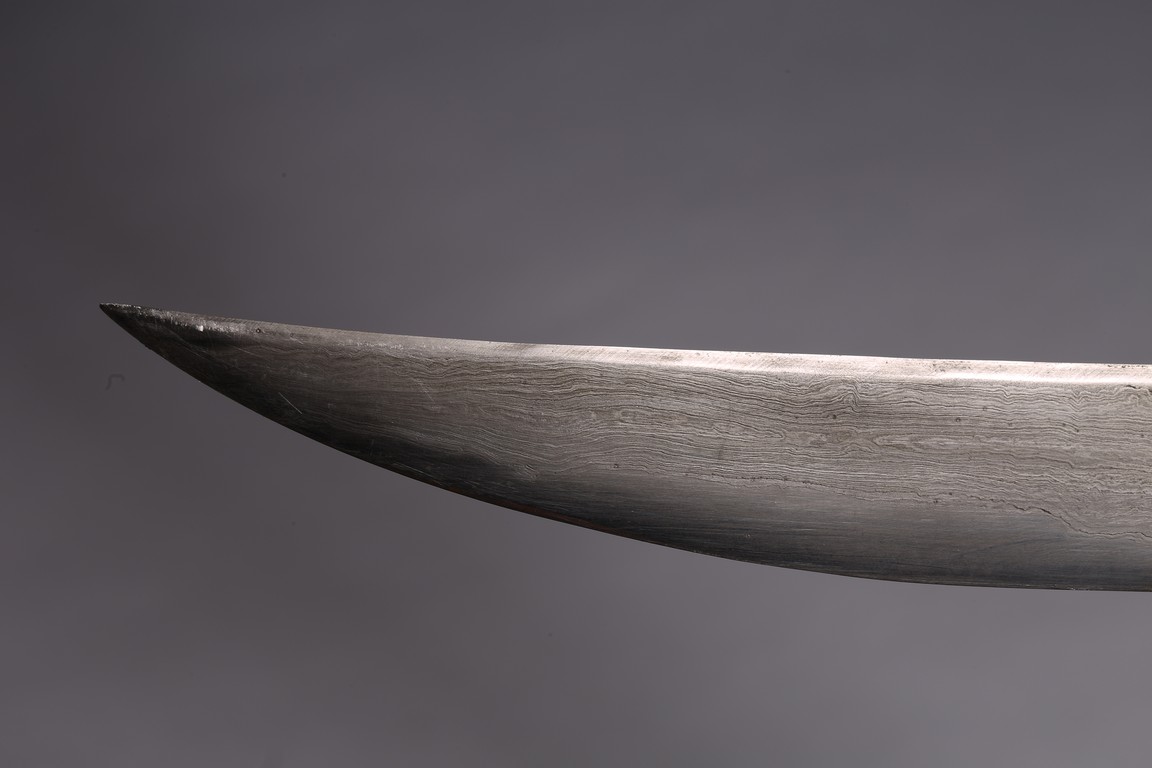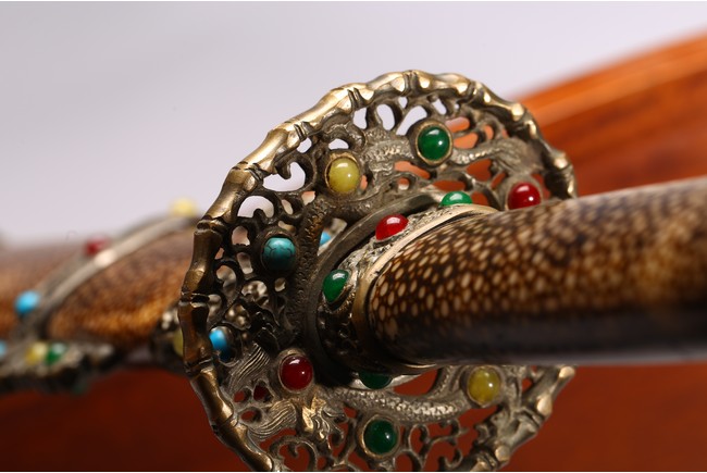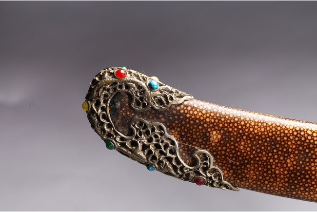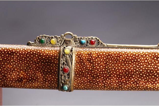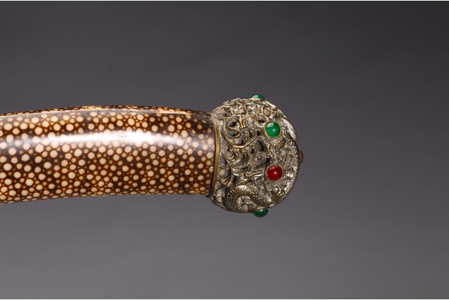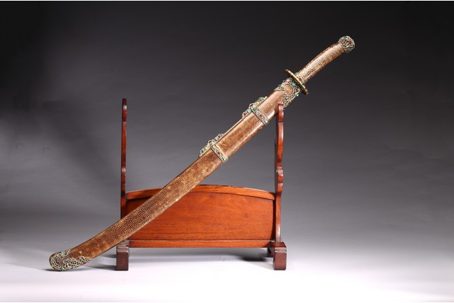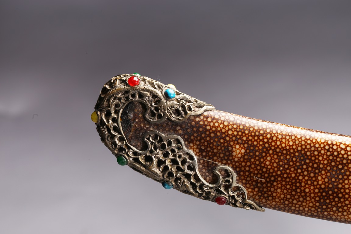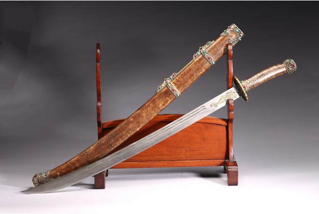The long slightly curved metal blade tapering to a pointed tip, the steel blade decorated near the hilt with inlaid gold depicting dragon on one side and four character Qianlong mark on the reverse, the handle and scabbard covered in brown and creamy white shagreen decorated with gem beads. Qing Dynasty period.