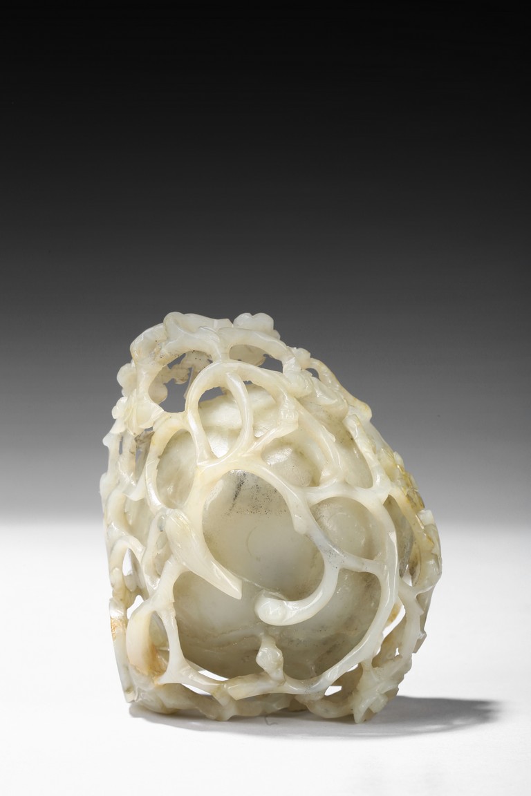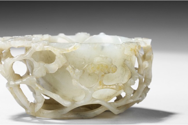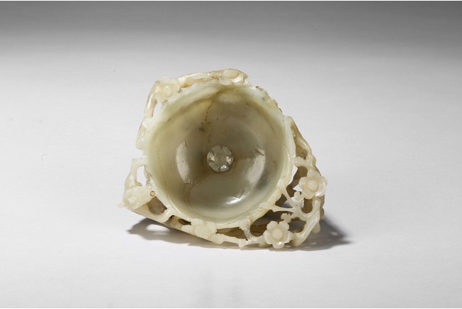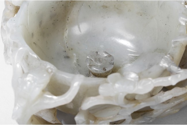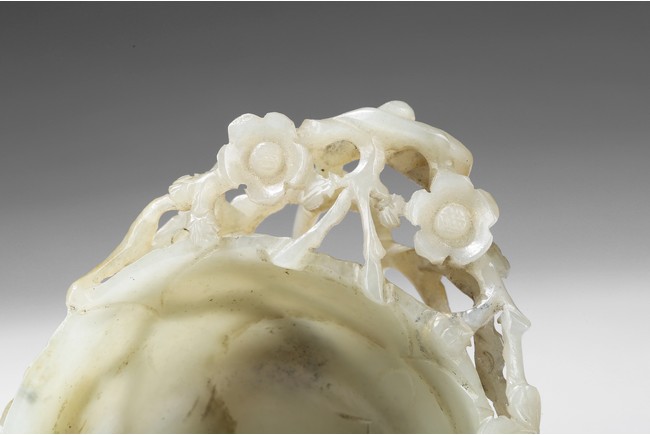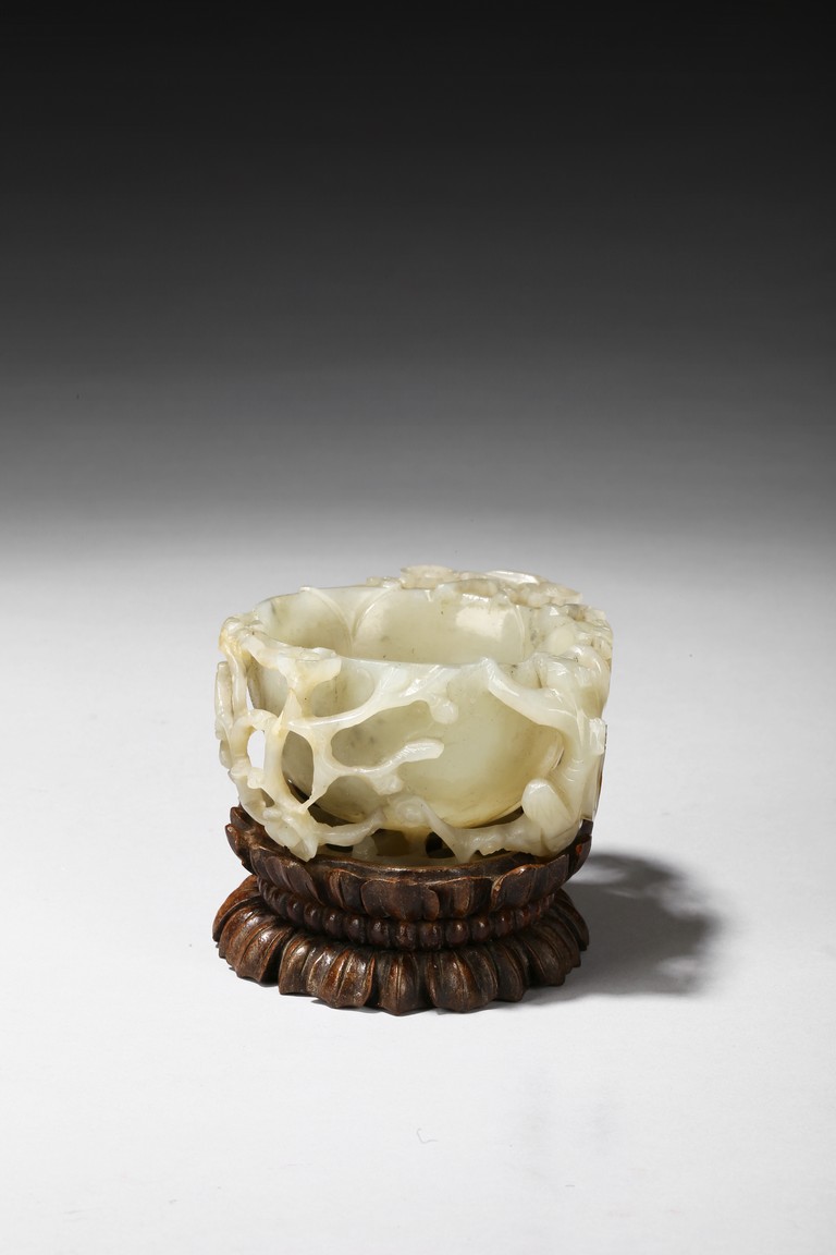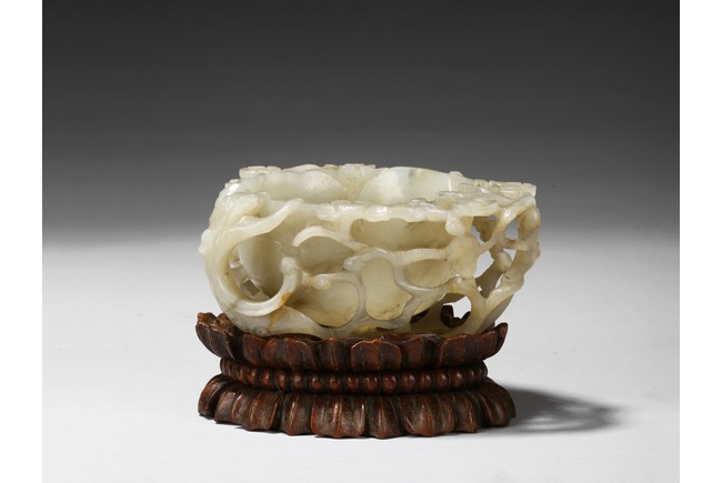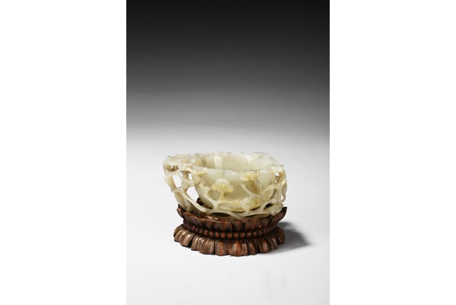 Deftly carved in the form a rounded lotus leaf, the washer is surrounded with branches of plum blossom flowers rising to the rim to one side, the other side with a climbing chilong, the stone of a greenish white tone with some russet inclusions, well fitted with original carved hardwood stand carved in the form of double lotus. Yuan Dynasty period.