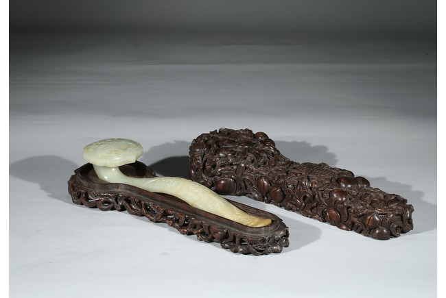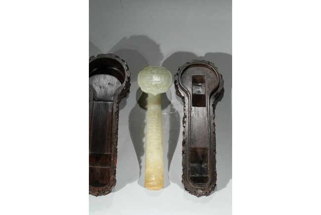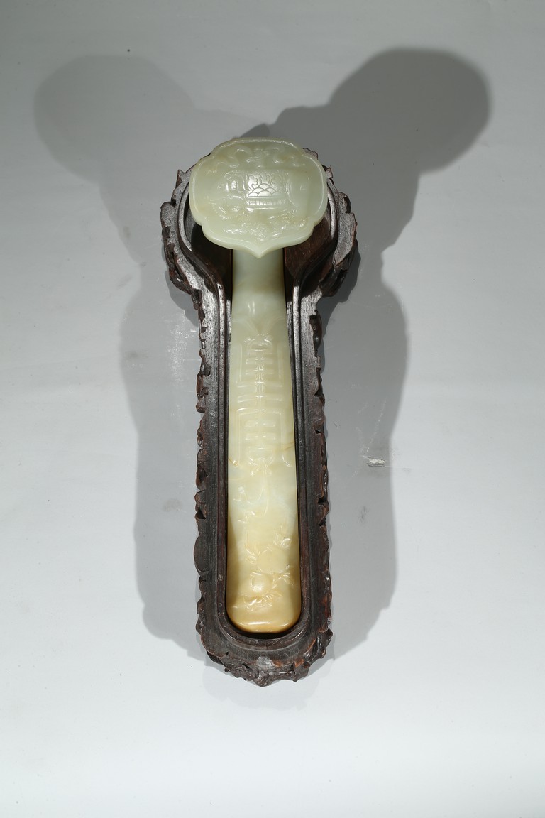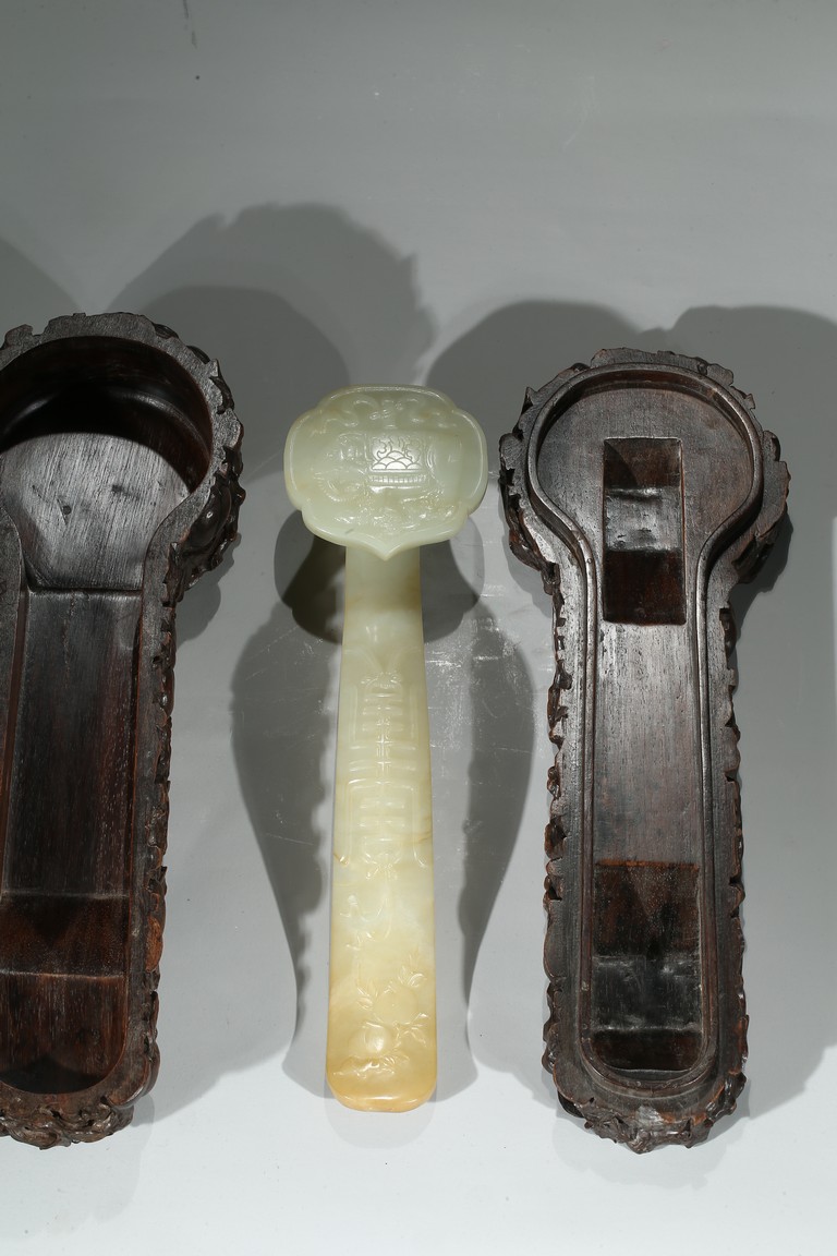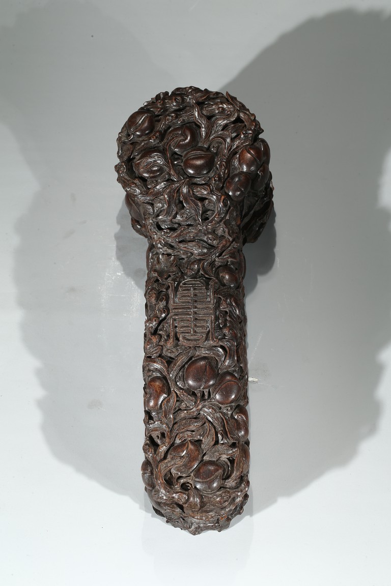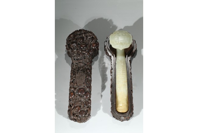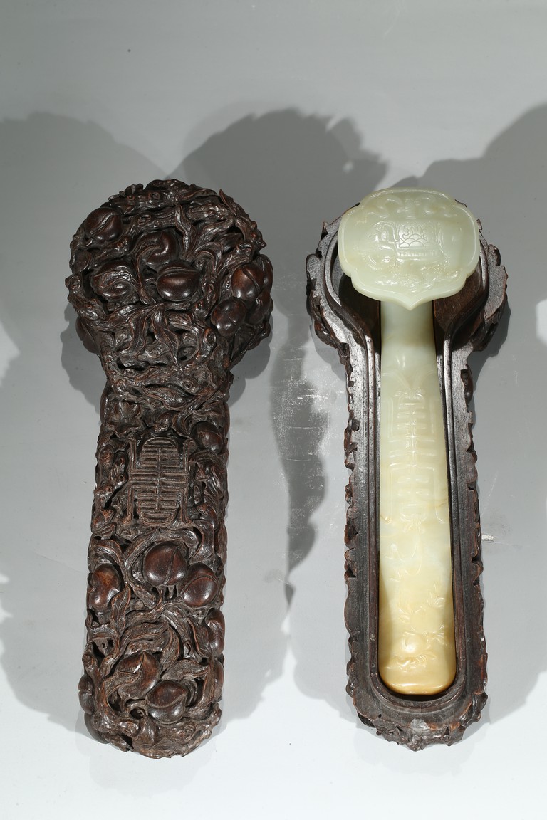 The ruyi scepter carved with an auspicious elephant supporting a vase to the head, the shaft carved with stylized shou character and peaches, the reverse inscribed with inscriptions in gilt, fitted with a carved zitan box and cover.