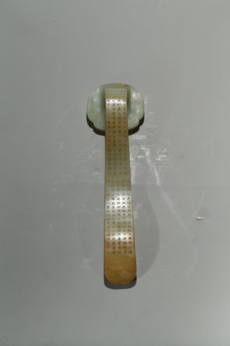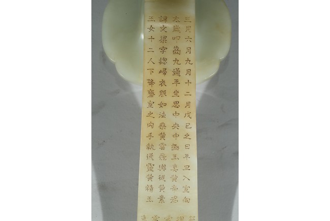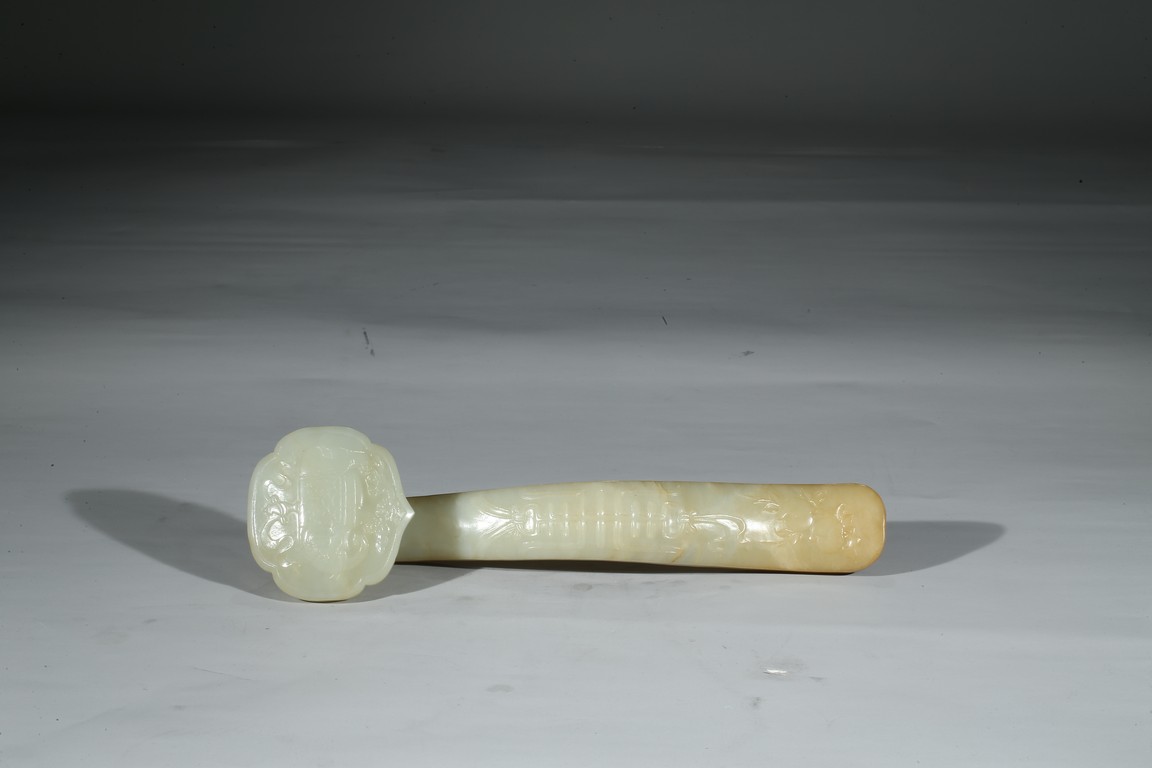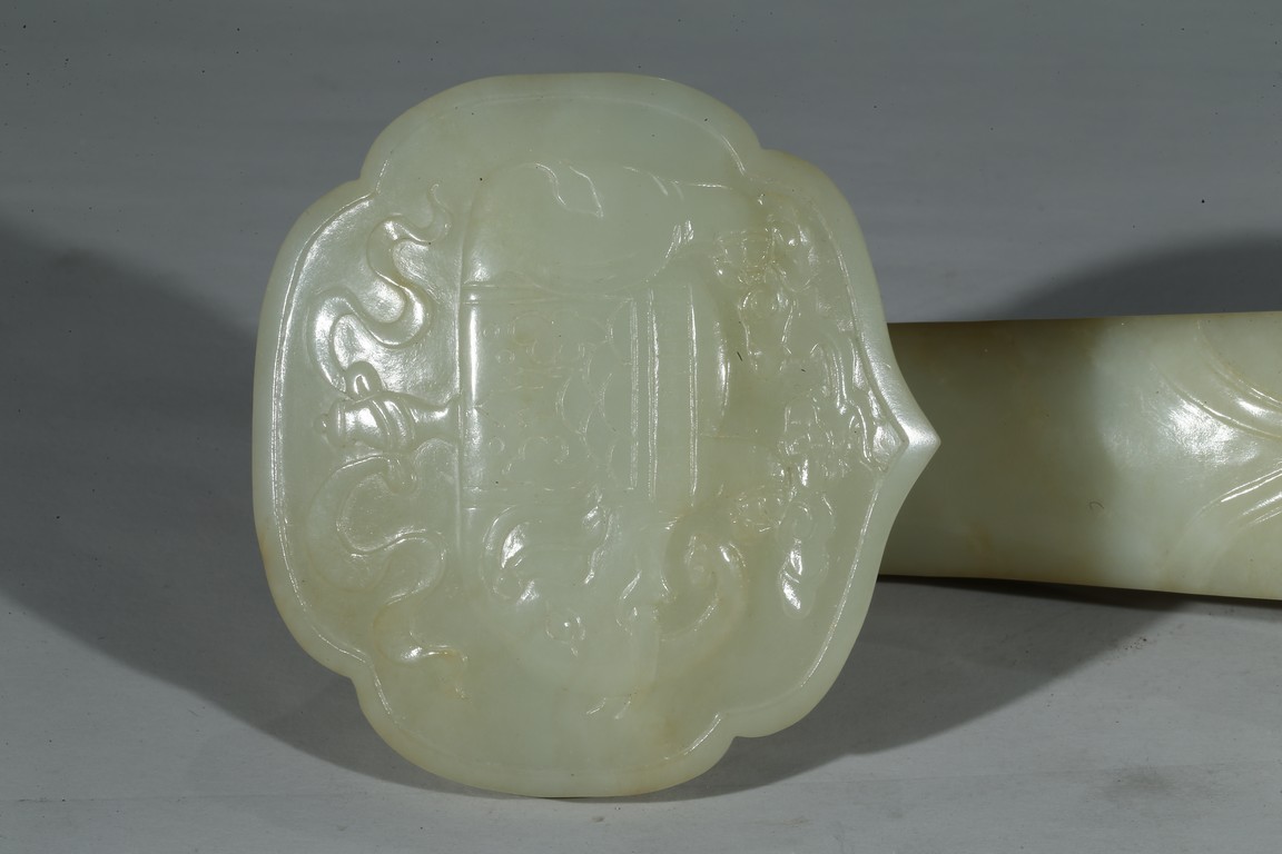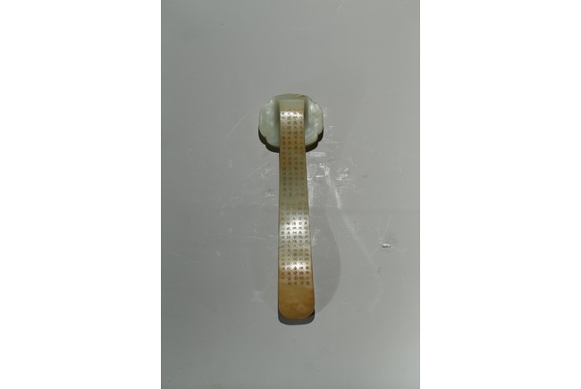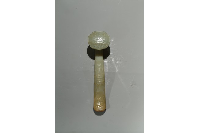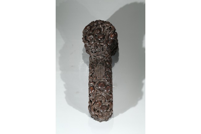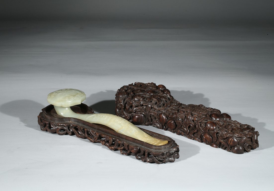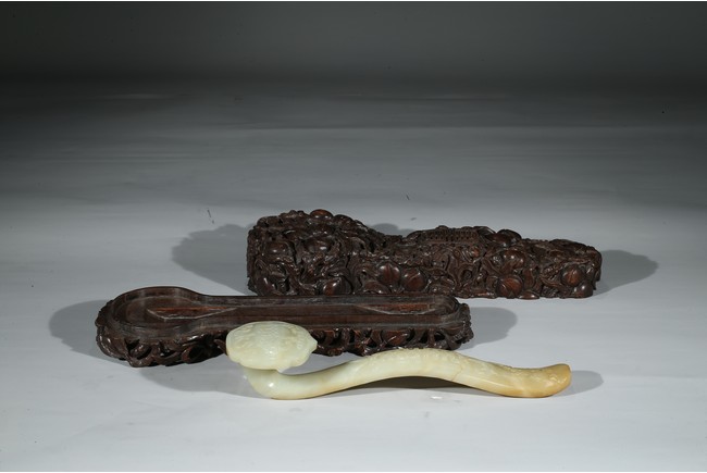 The ruyi scepter carved with an auspicious elephant supporting a vase to the head, the shaft carved with stylized shou character and peaches, the reverse inscribed with inscriptions in gilt, fitted with a carved zitan box and cover.