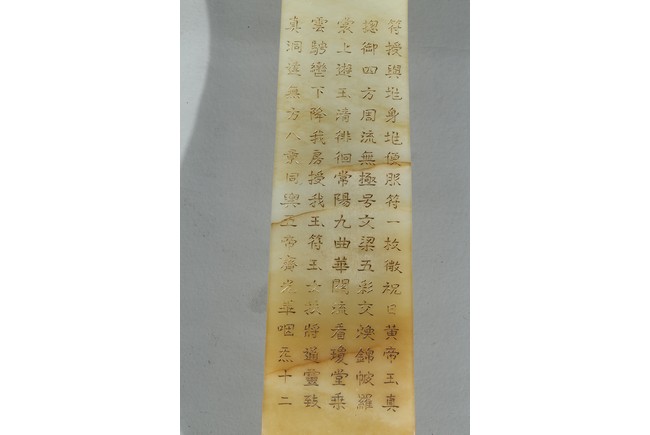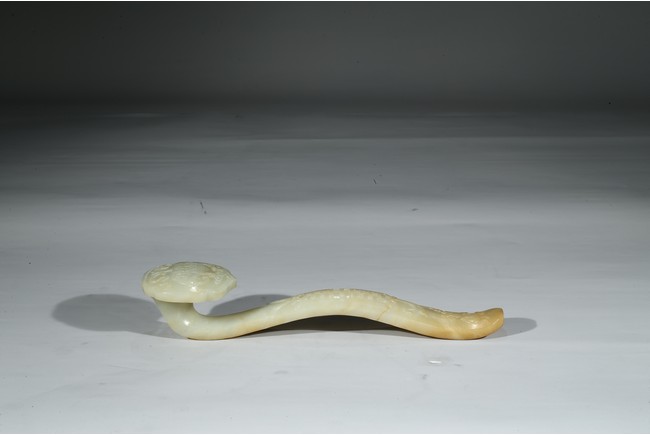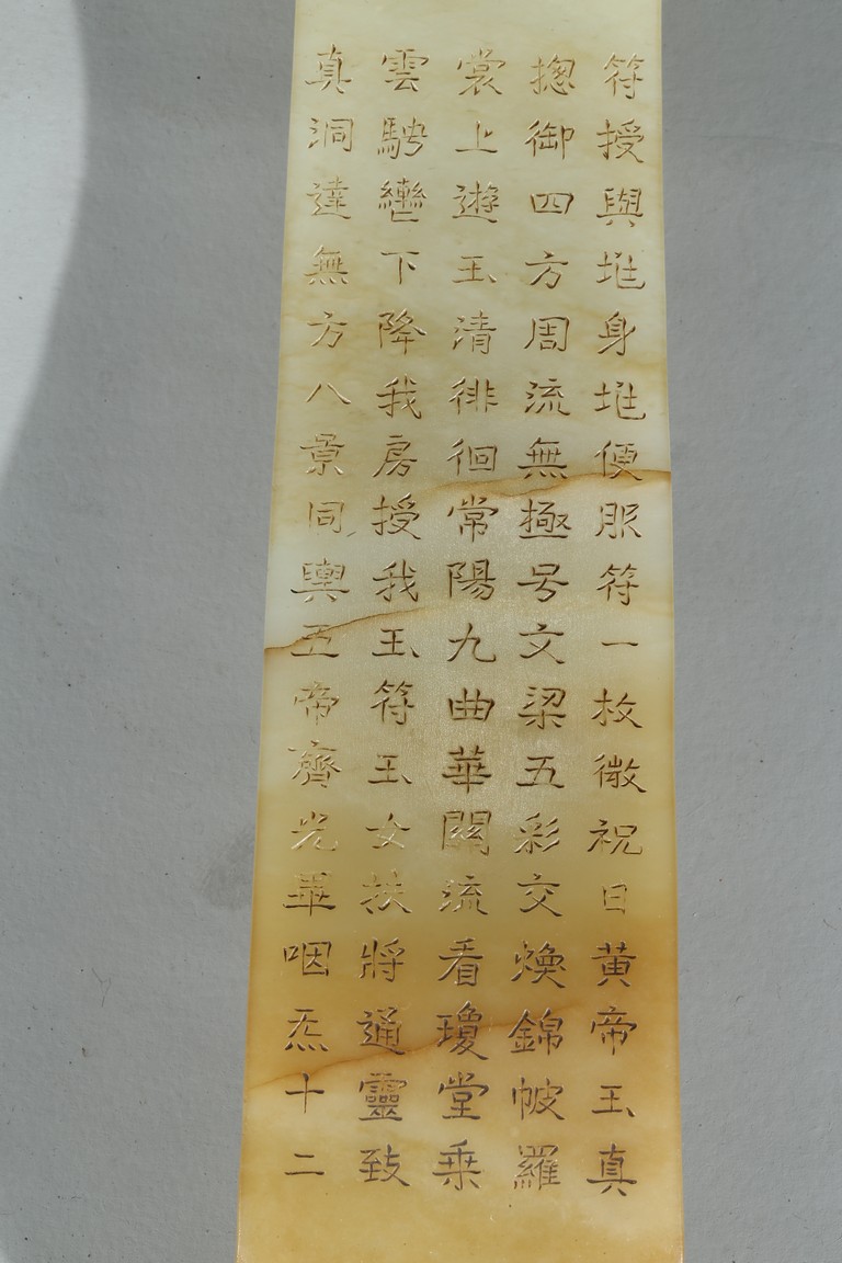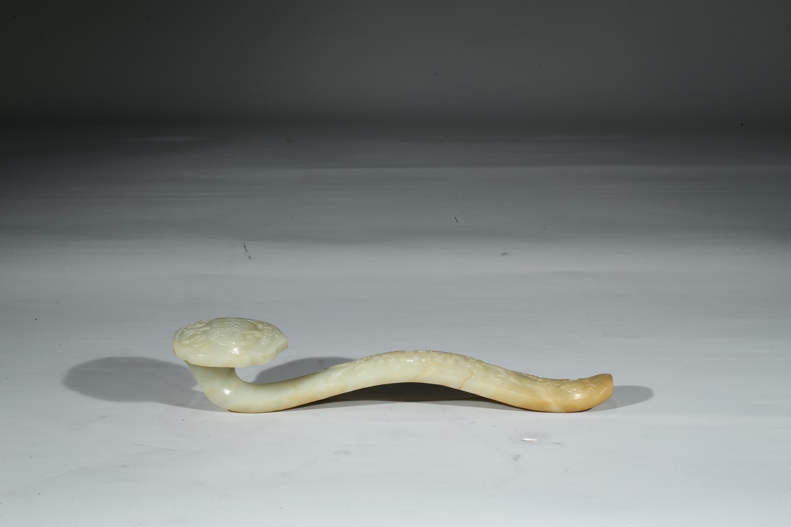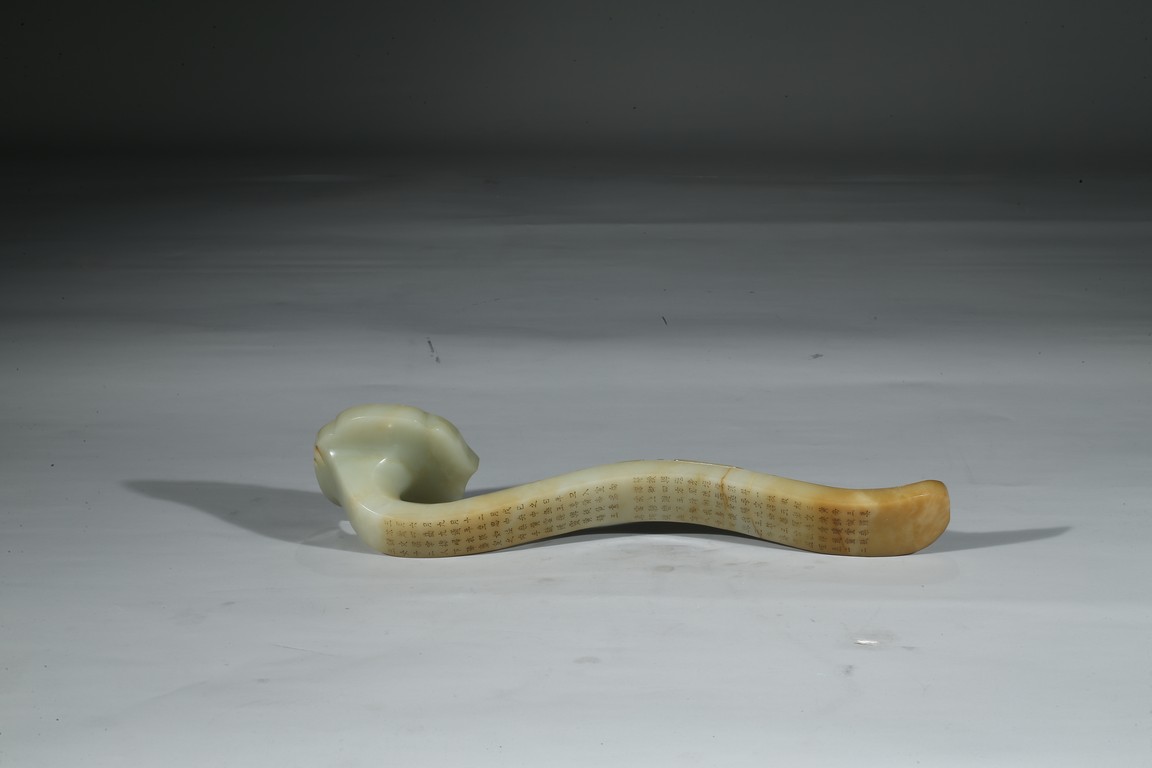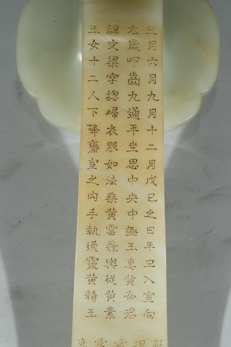 The ruyi scepter carved with an auspicious elephant supporting a vase to the head, the shaft carved with stylized shou character and peaches, the reverse inscribed with inscriptions in gilt, fitted with a carved zitan box and cover.