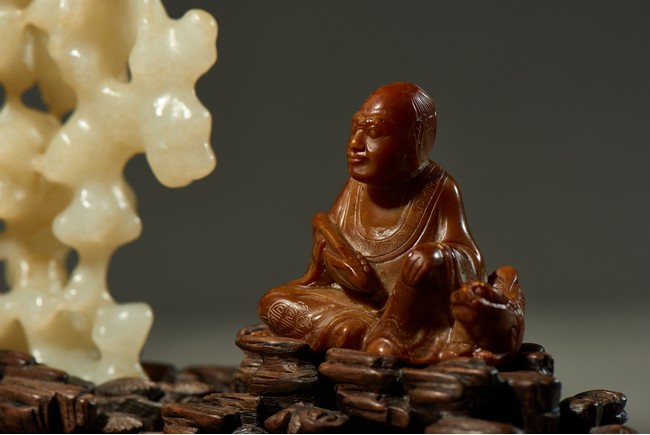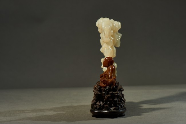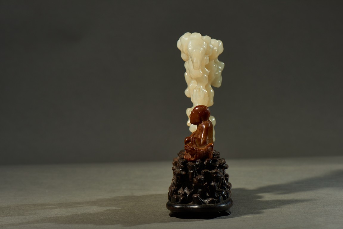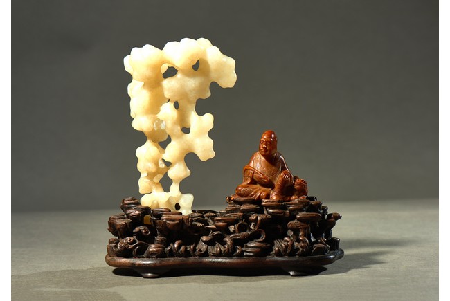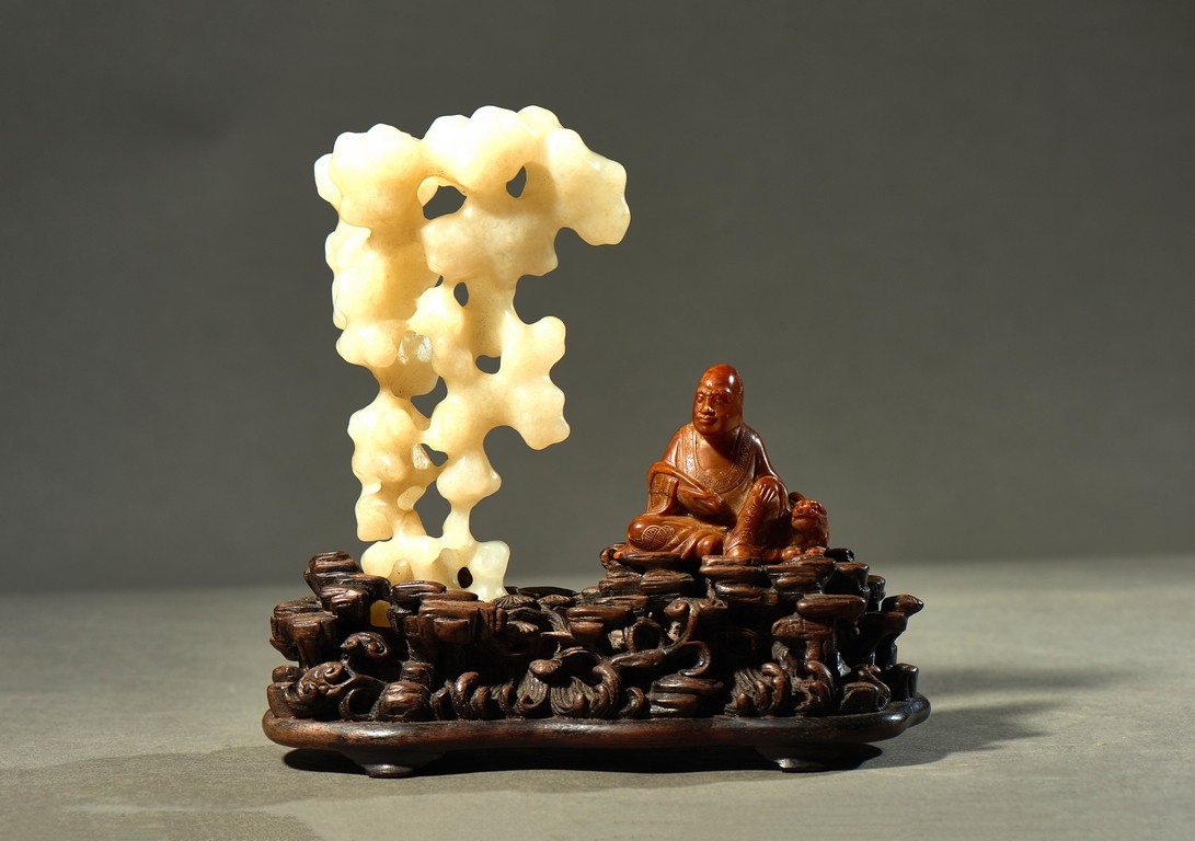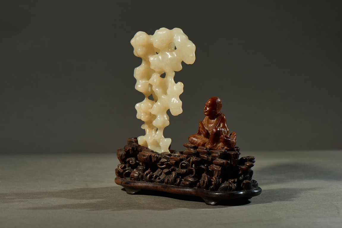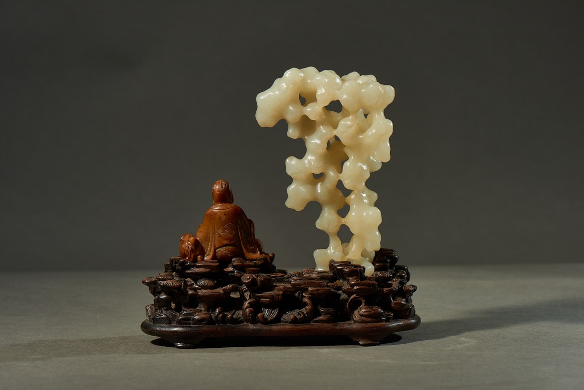 用白玉製成太湖石型,形制優美,孔洞通透。其旁用壽山石雕飾羅漢,石質優良,包漿醇熟,羅漢身著長袍,盤腿打坐,人物面容清晰,神態自然。配有原配硬木底座。