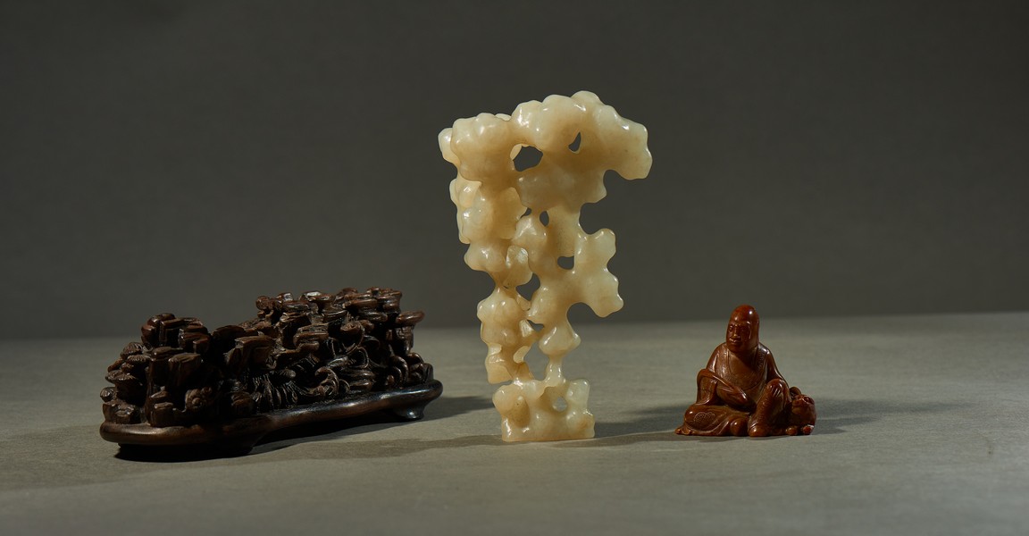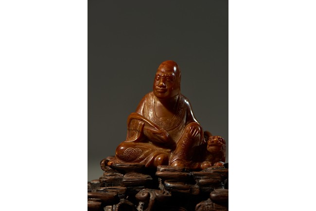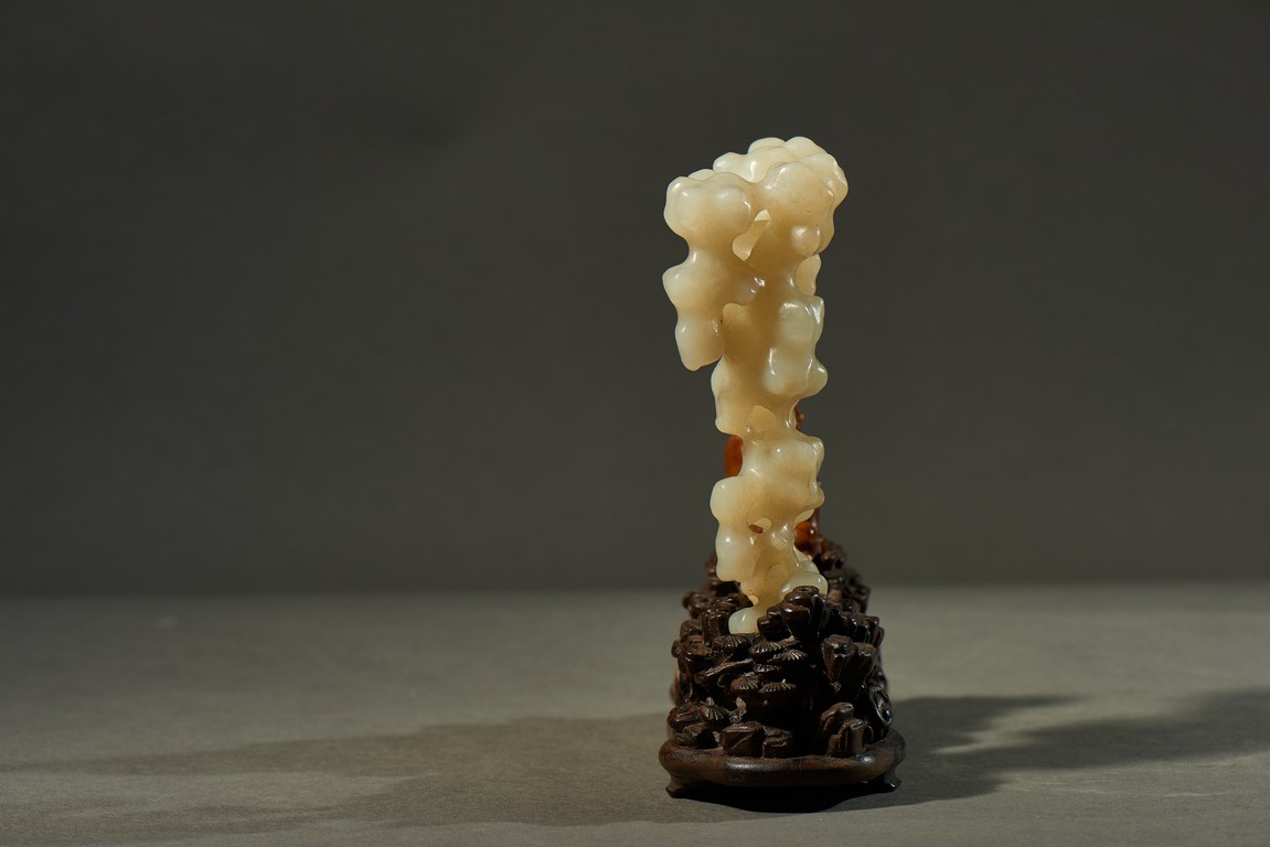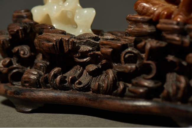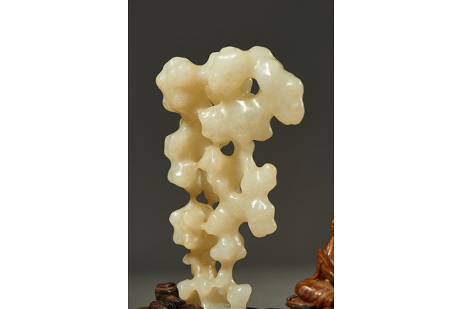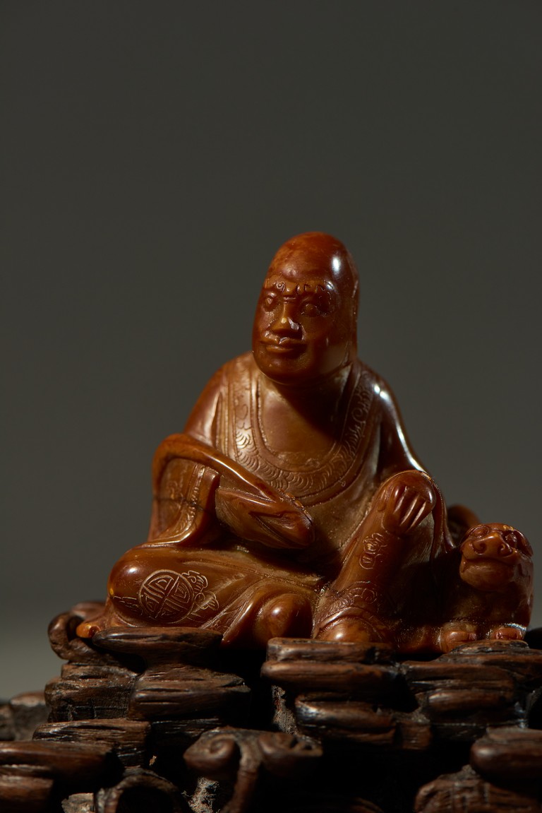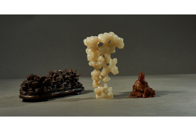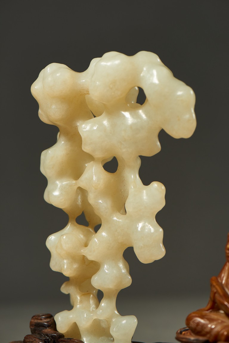 用白玉製成太湖石型,形制優美,孔洞通透。其旁用壽山石雕飾羅漢,石質優良,包漿醇熟,羅漢身著長袍,盤腿打坐,人物面容清晰,神態自然。配有原配硬木底座。