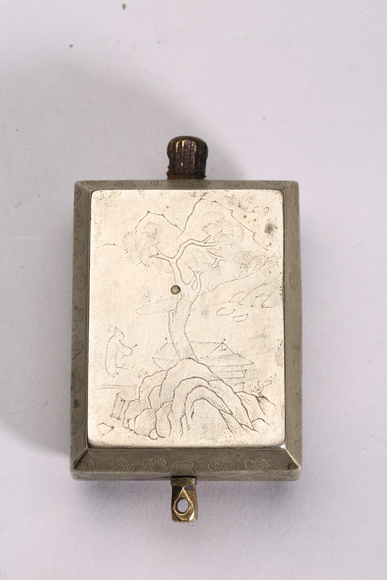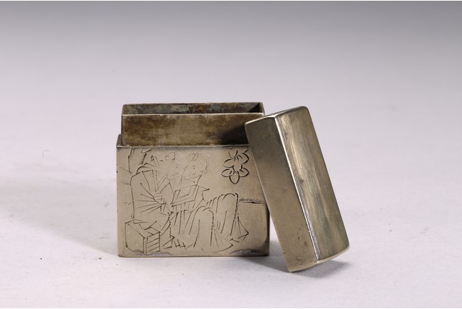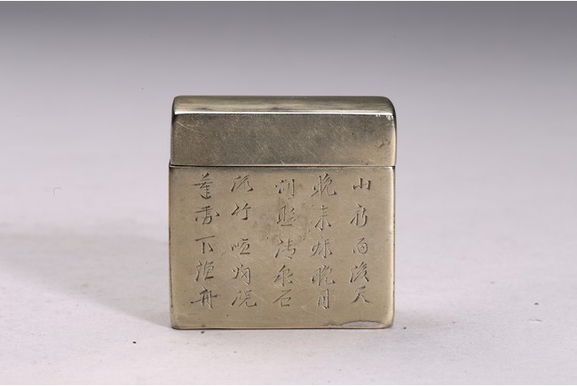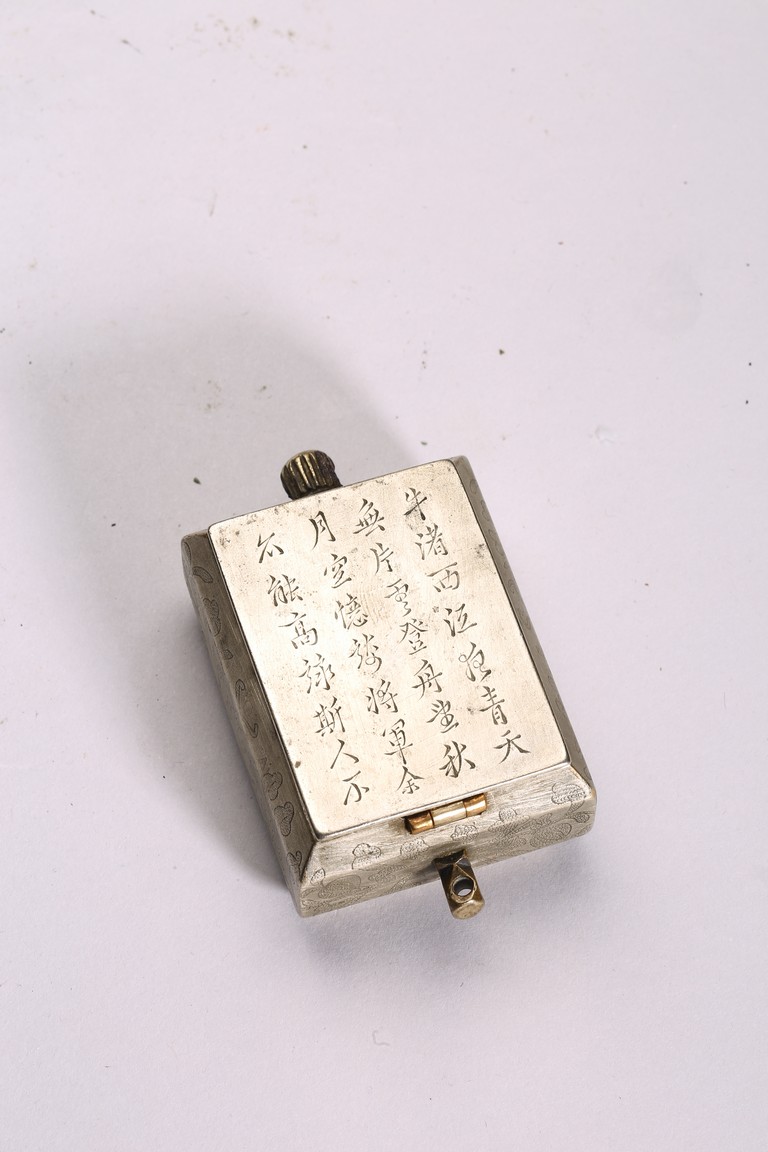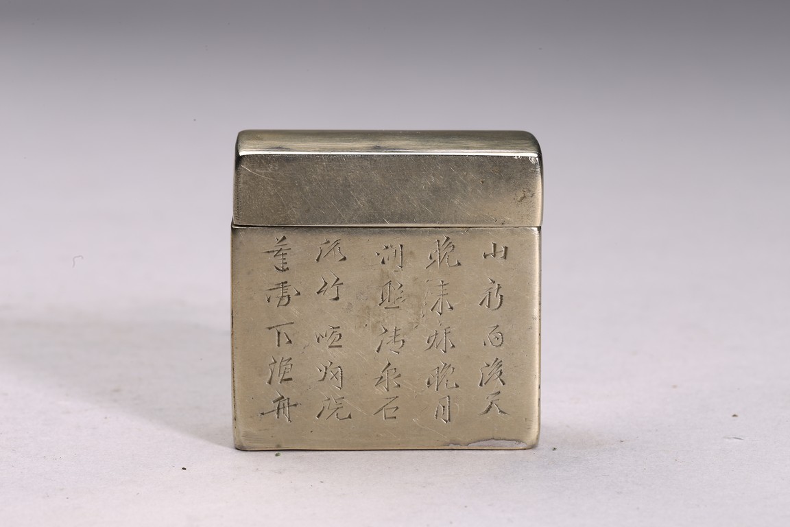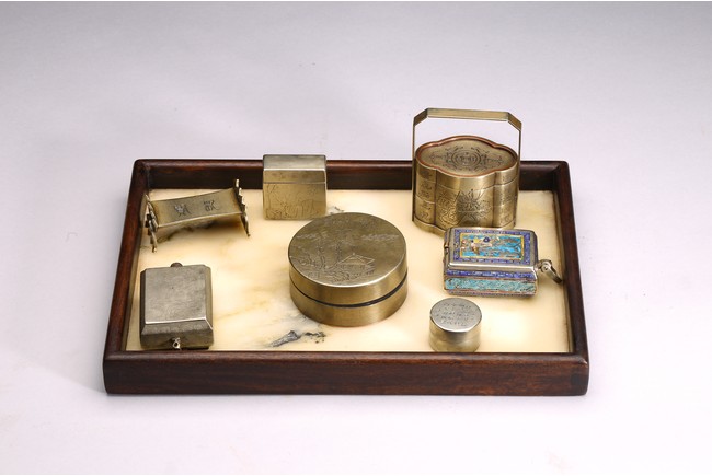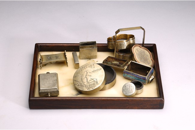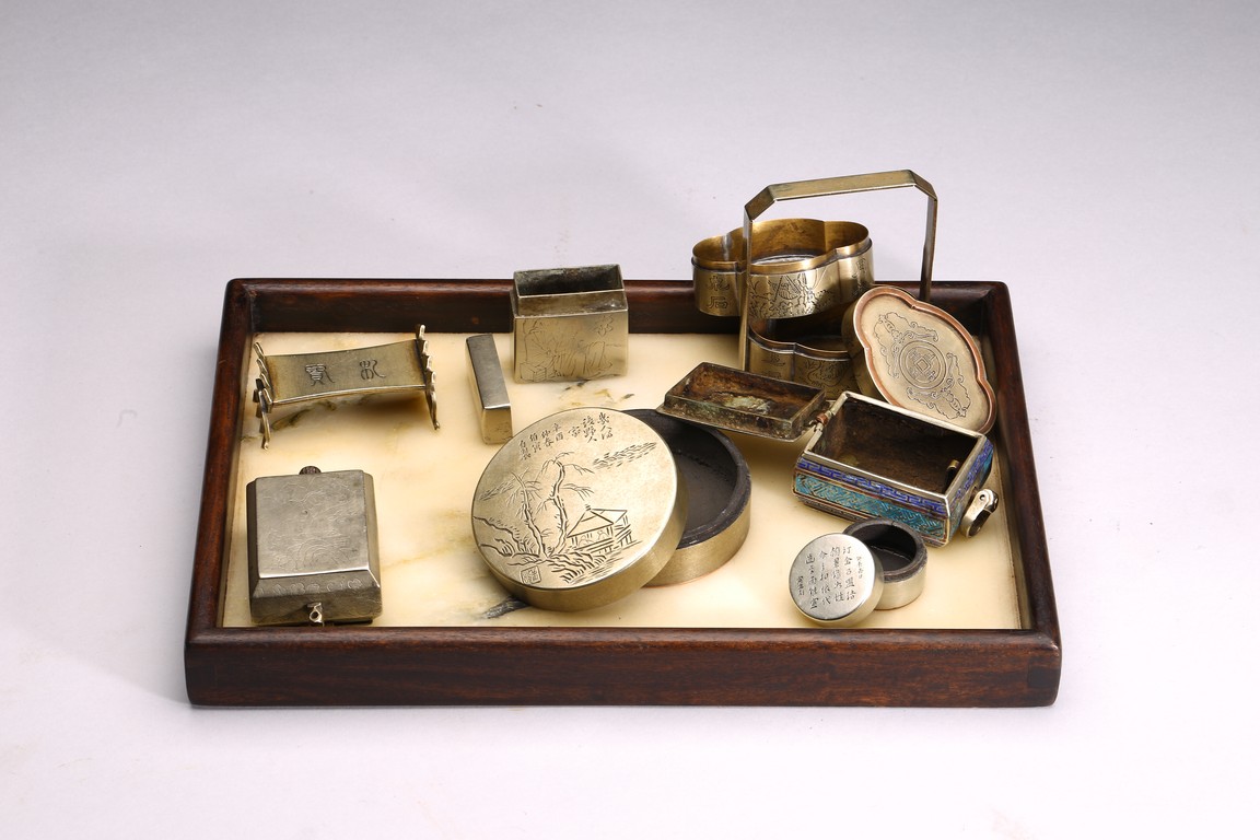 Consisting of seven small silver incised scholar's boxes in various forms, accompanied with a rectangular rosewood tray inset with patterned 'dream stone' marble as base. Late Qing Dynasty period.