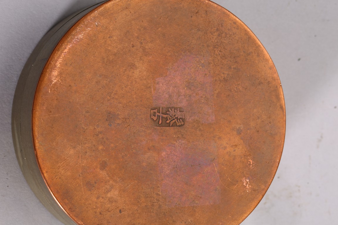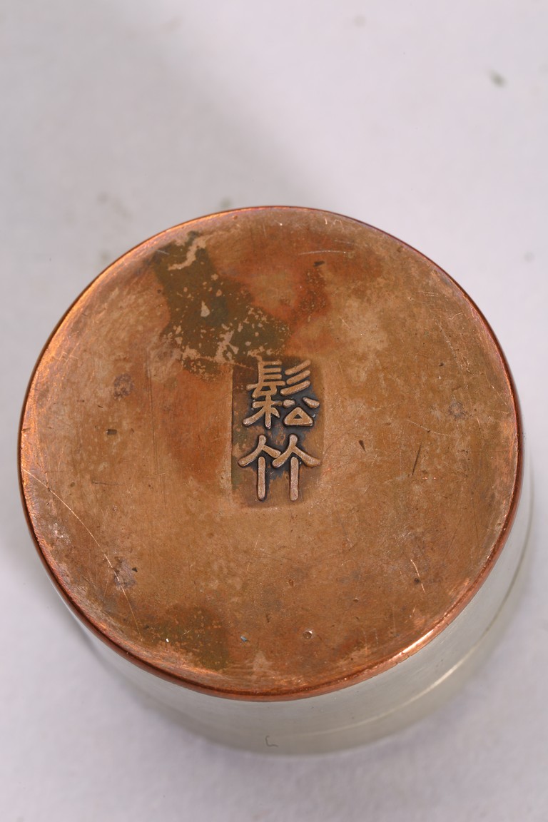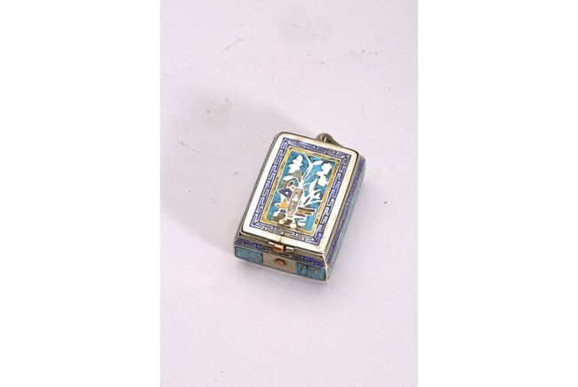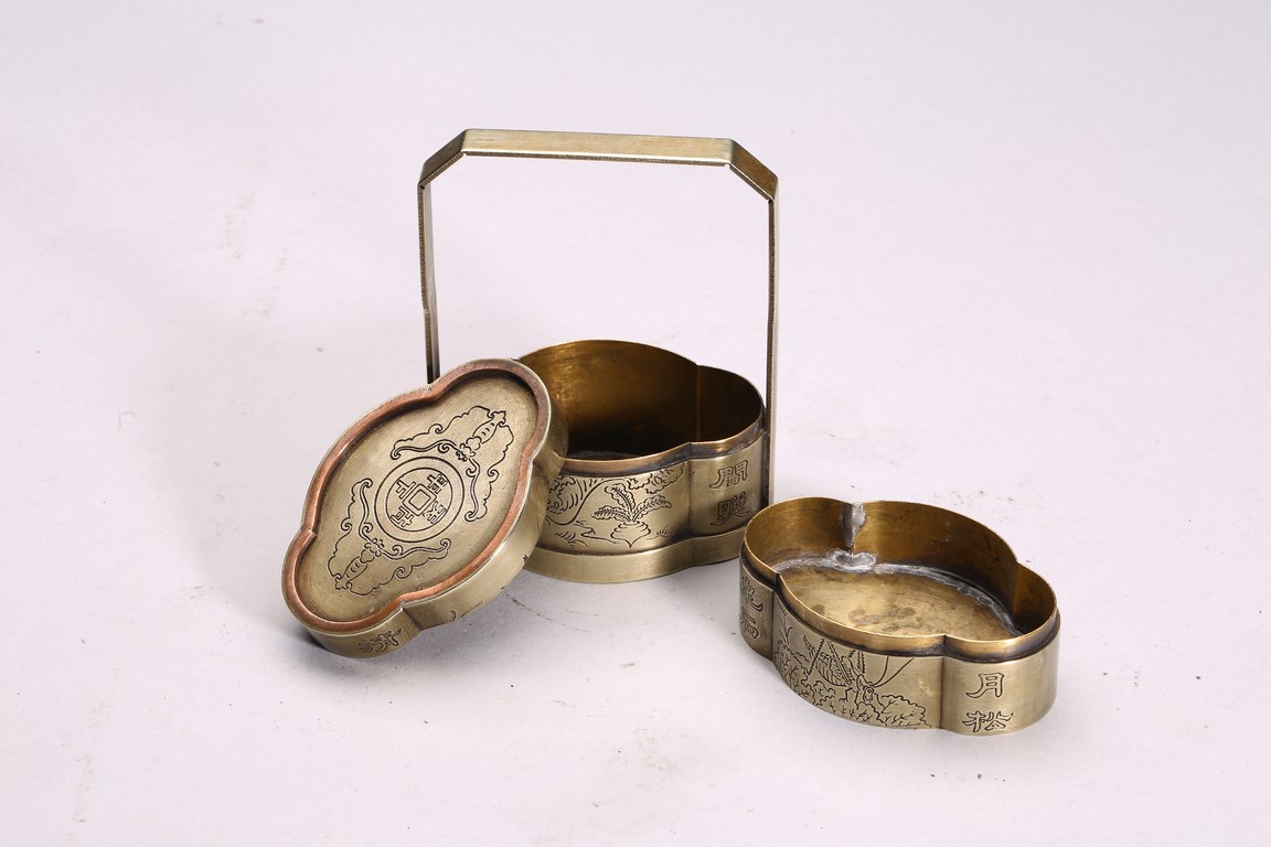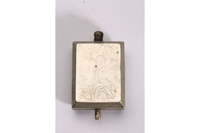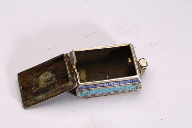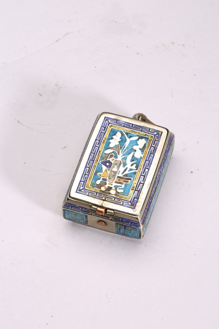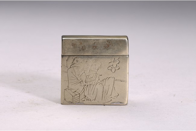 Consisting of seven small silver incised scholar's boxes in various forms, accompanied with a rectangular rosewood tray inset with patterned 'dream stone' marble as base. Late Qing Dynasty period.