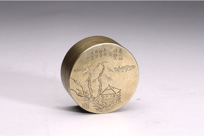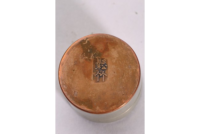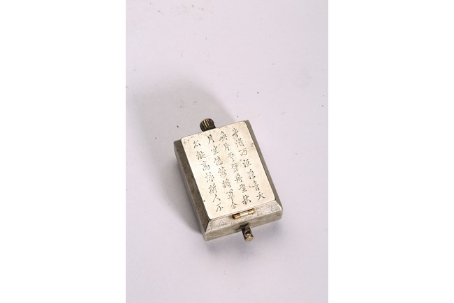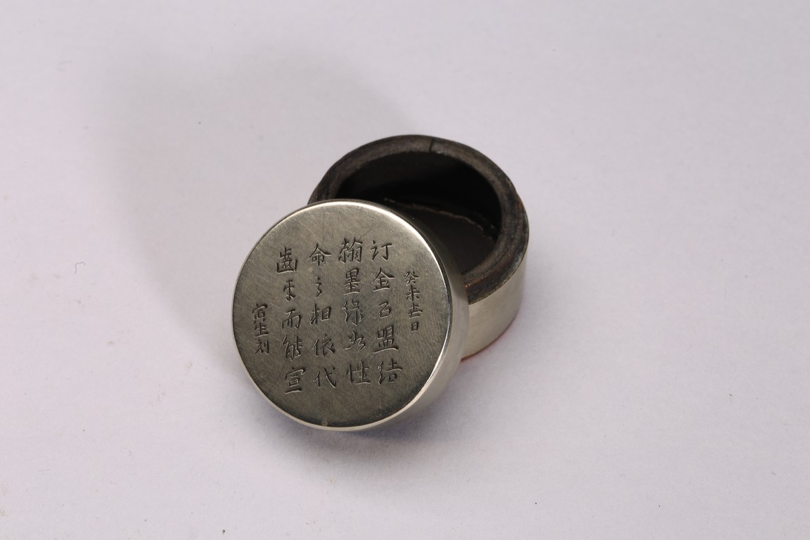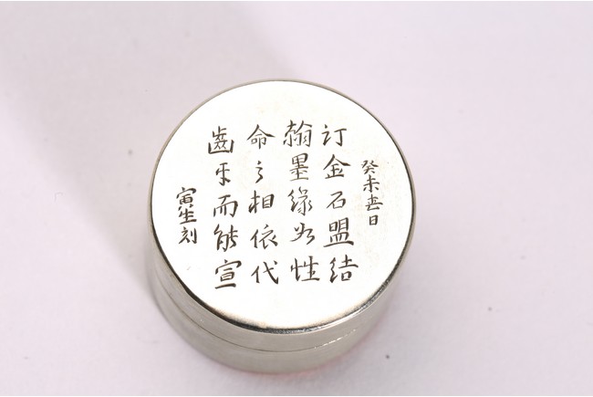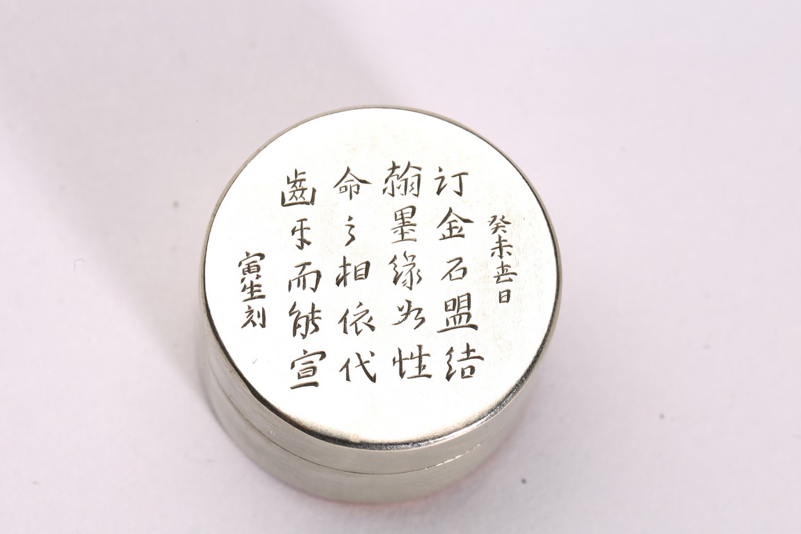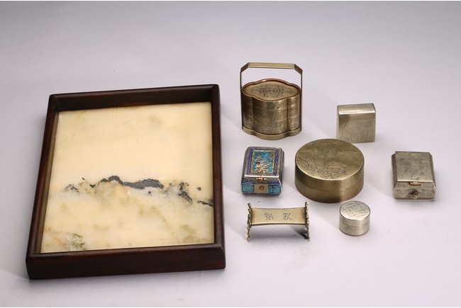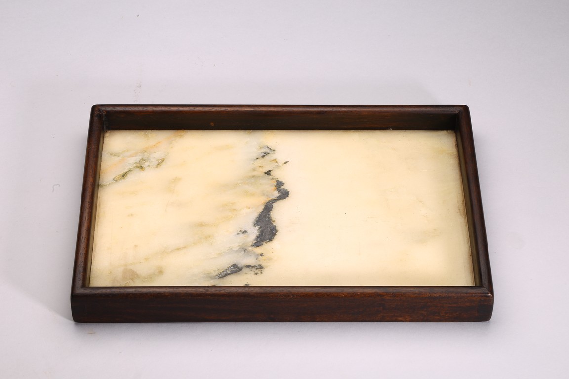 銀質文房四寶含筆架、印泥盒等組合七小件。又含紅木雲石都承盤。雲石也稱“滇石”或“文石”、“蒼石”,是雲南點蒼山特有的奇石,具有天然的紋理,自明代以來,文人墨客將其作為裝飾廳堂之物。此雲石白色為底,中間幾縷深色,好似山巒連綿,高峰疊嶂,煙雲繚繞,變幻莫測,意境幽遠。
