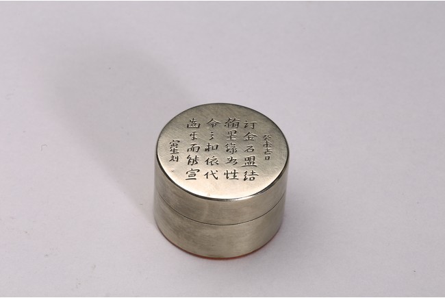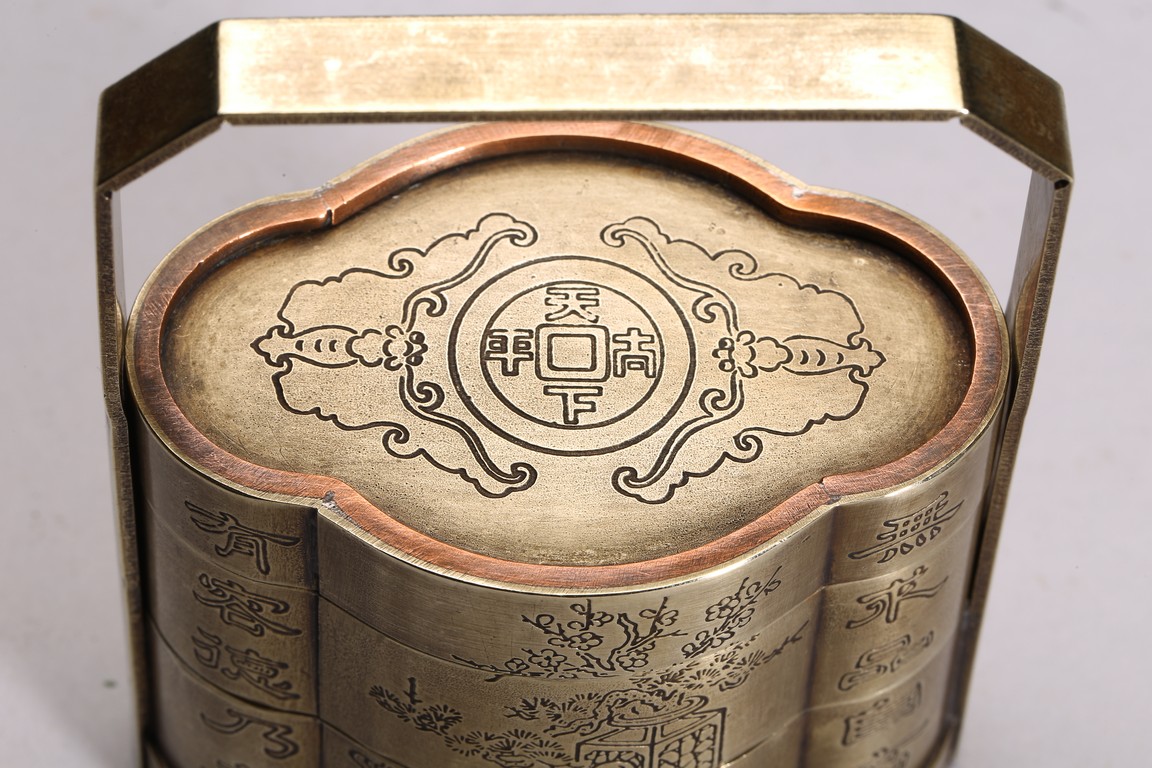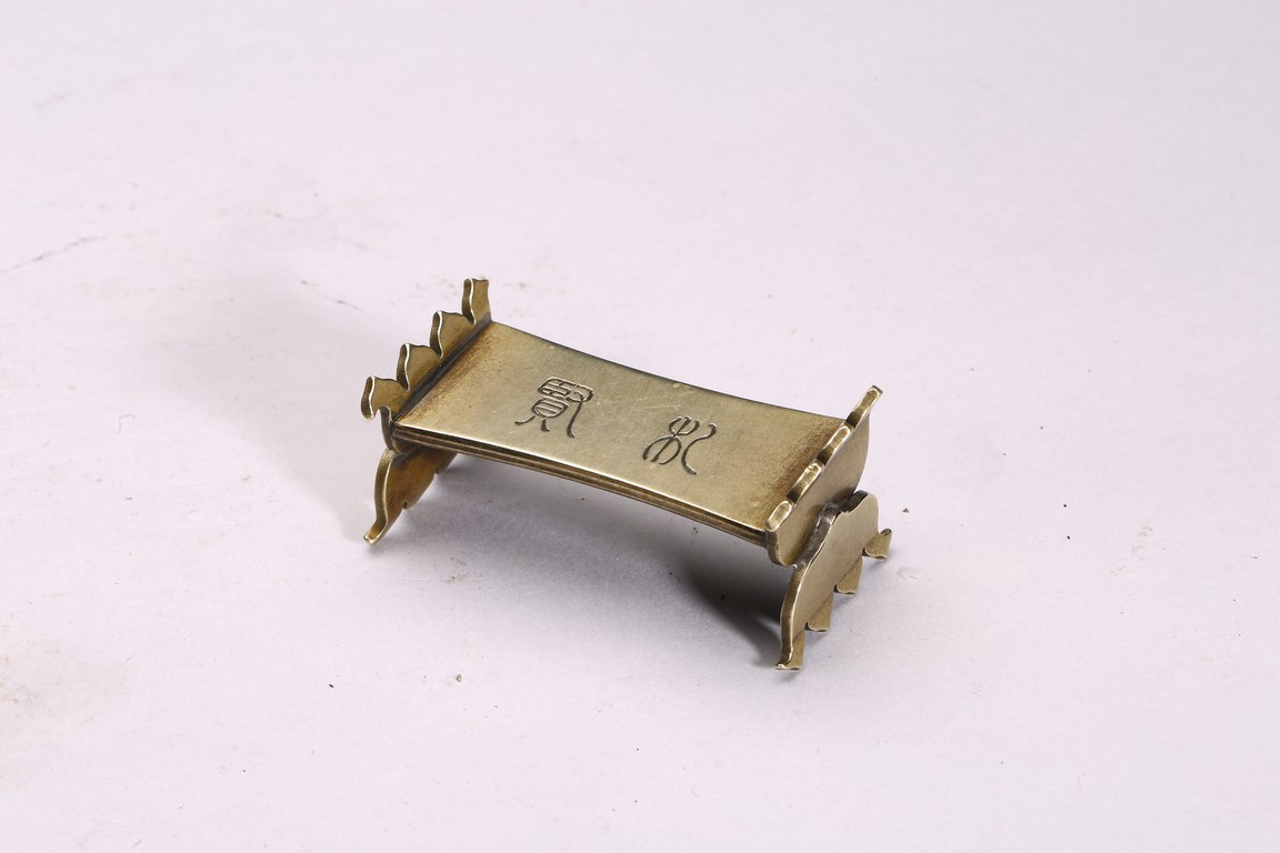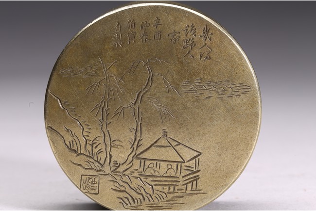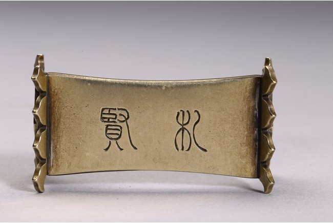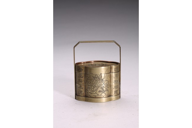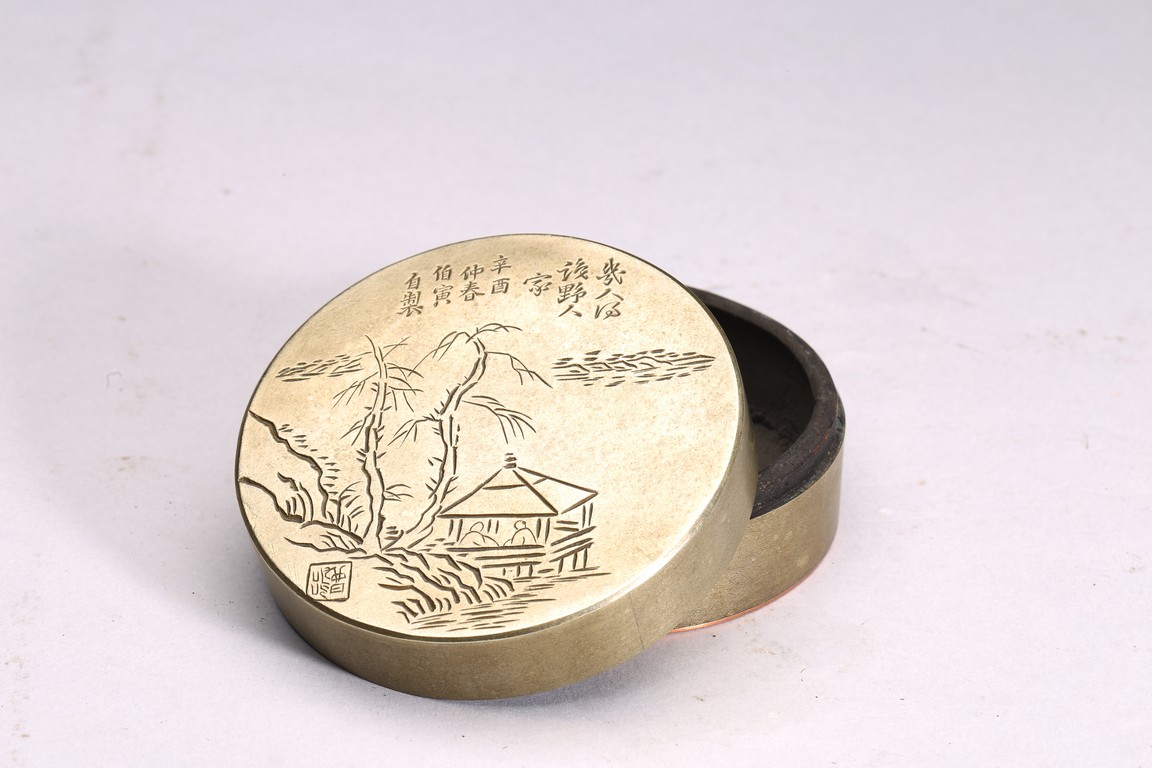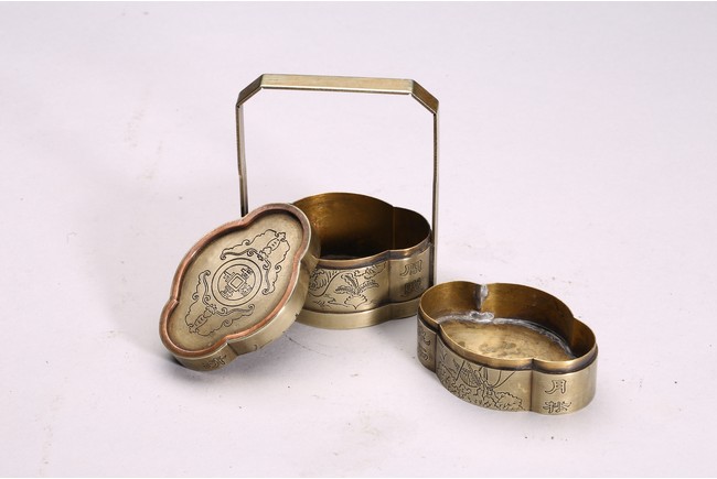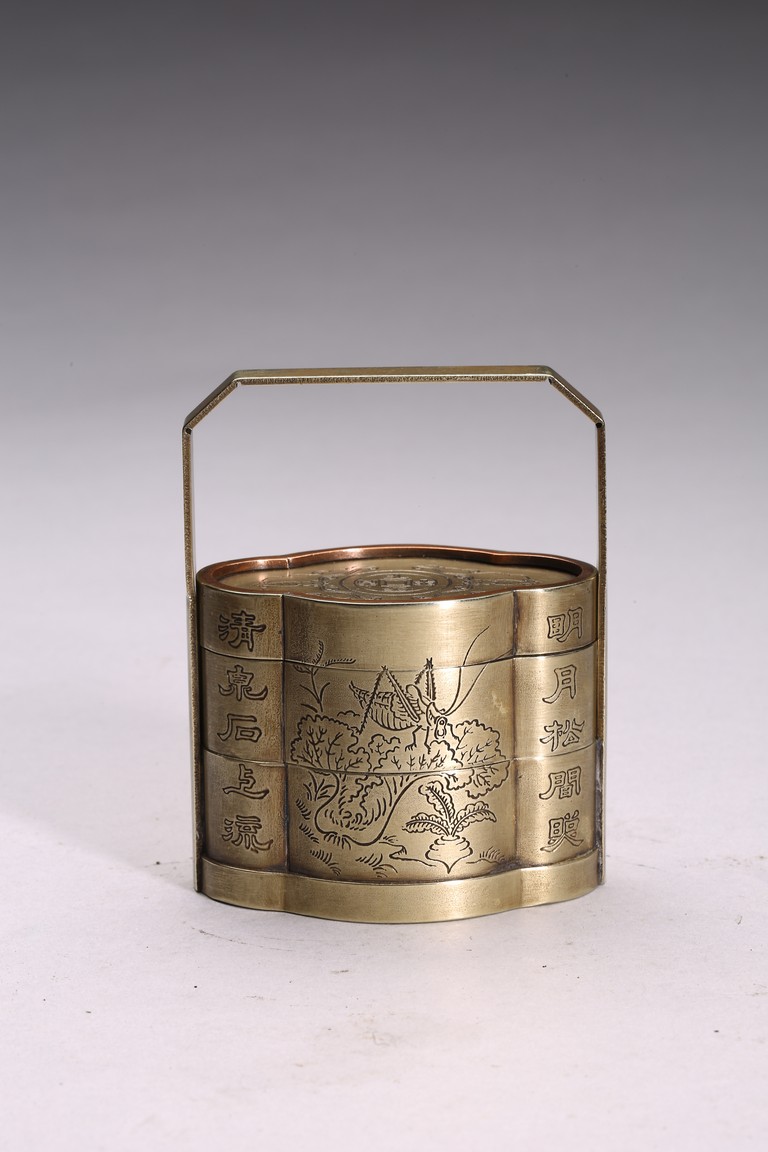 銀質文房四寶含筆架、印泥盒等組合七小件。又含紅木雲石都承盤。雲石也稱“滇石”或“文石”、“蒼石”,是雲南點蒼山特有的奇石,具有天然的紋理,自明代以來,文人墨客將其作為裝飾廳堂之物。此雲石白色為底,中間幾縷深色,好似山巒連綿,高峰疊嶂,煙雲繚繞,變幻莫測,意境幽遠。