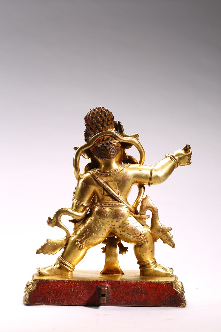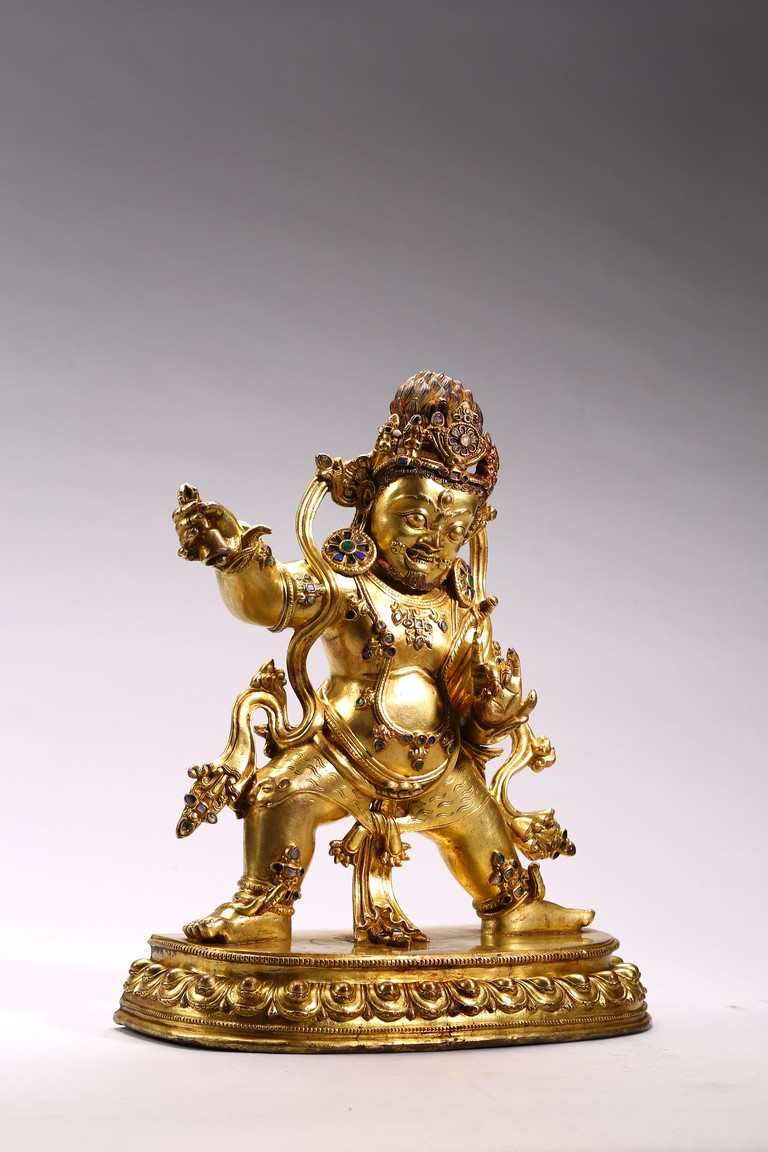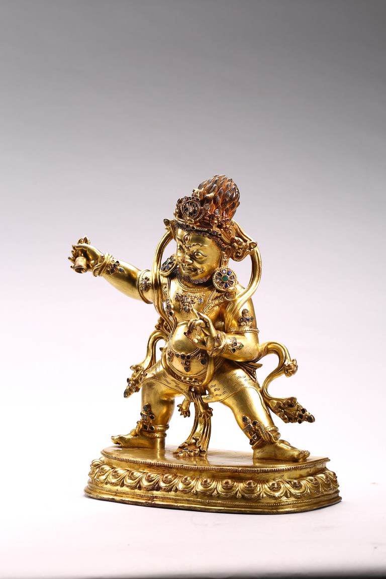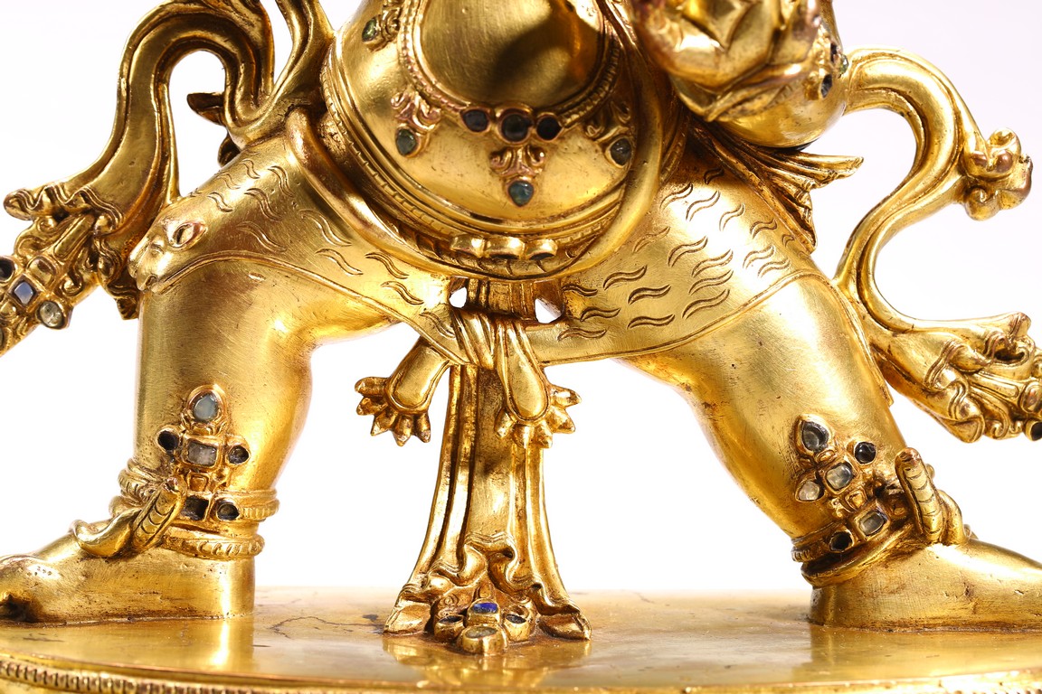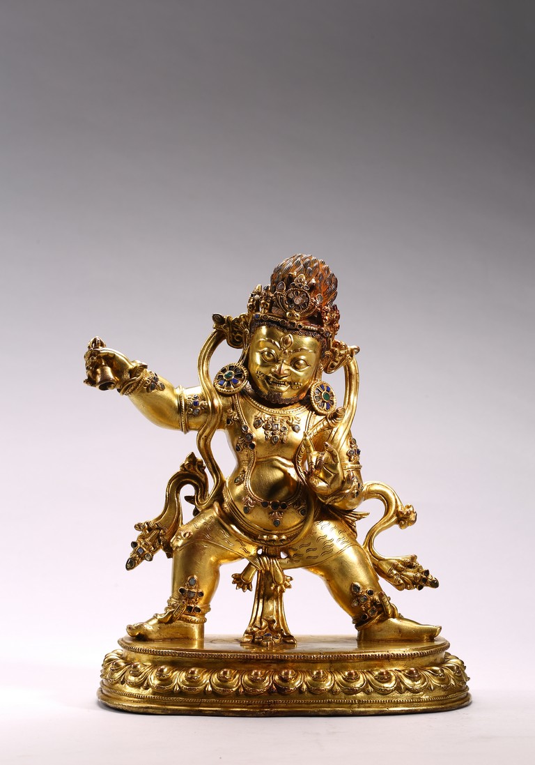 Tibetan. Densatil style. Standing in alidhasana over a lotus base and holding a vajra in his raised right hand, dressed in a tiger skin tied at the waist and adorned with a earrings and various beaded jewelry inlaid with various gems, the ferocious face with bared fangs, bulging eyes, and flaming brows surmounted by an elaborate tiara centered by a kirtimukha, the hair in flames, base sealed. 15/16th century.