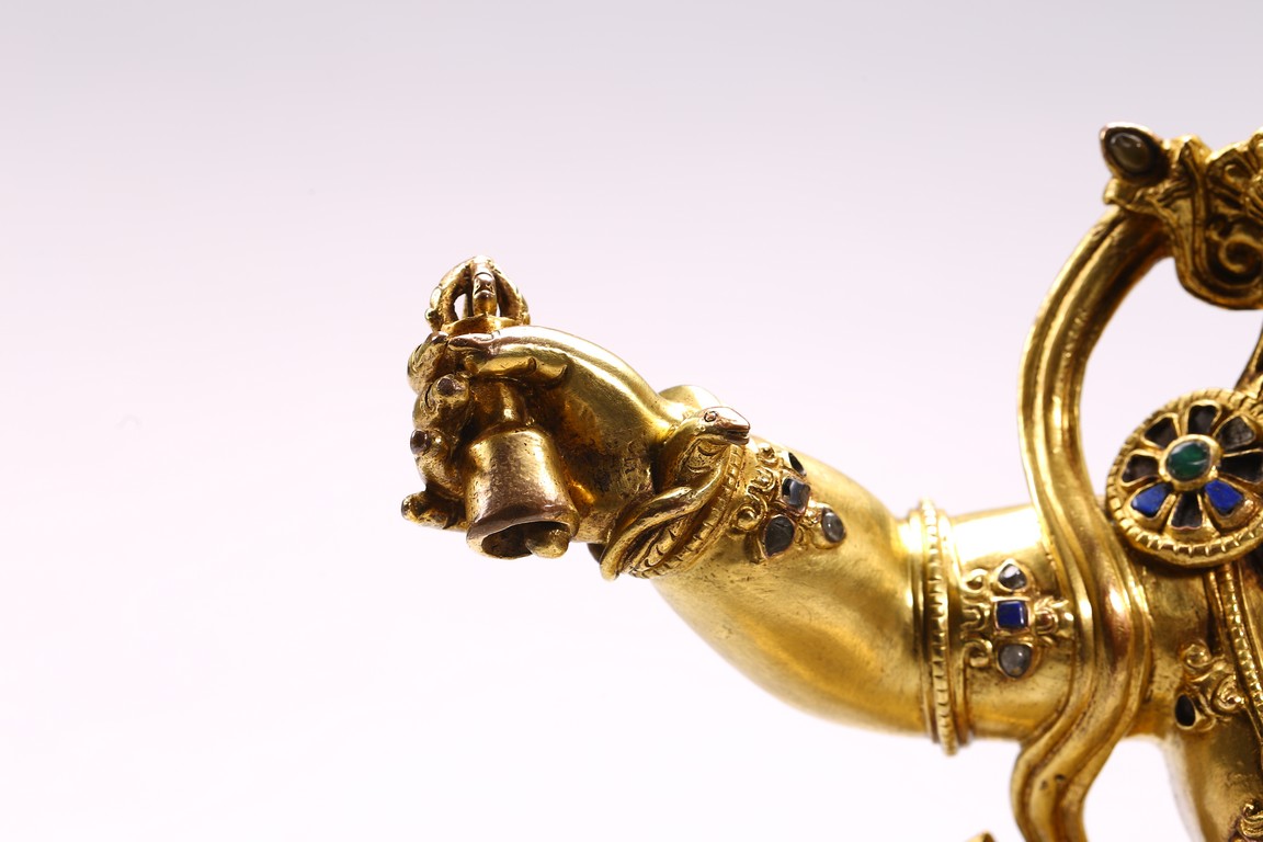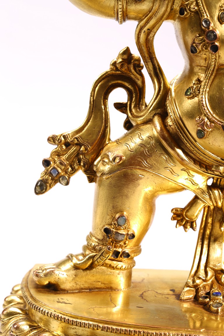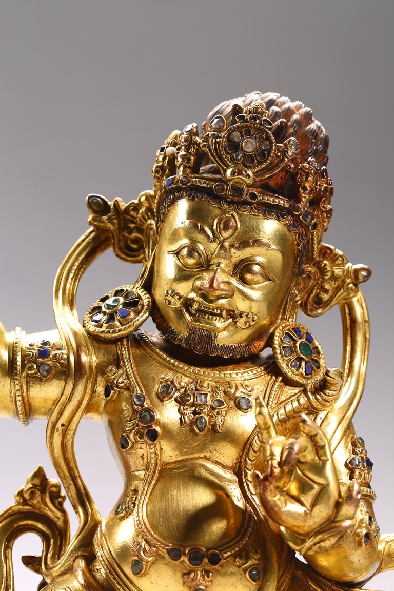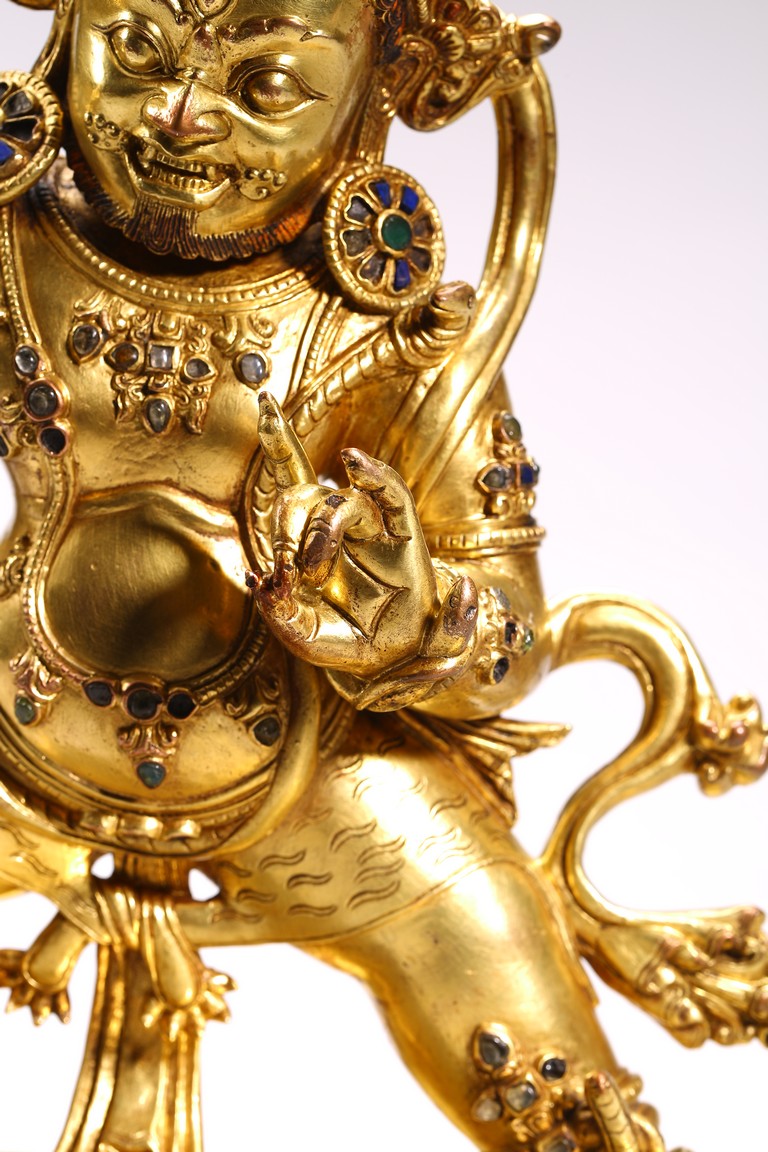 Tibetan. Densatil style. Standing in alidhasana over a lotus base and holding a vajra in his raised right hand, dressed in a tiger skin tied at the waist and adorned with a earrings and various beaded jewelry inlaid with various gems, the ferocious face with bared fangs, bulging eyes, and flaming brows surmounted by an elaborate tiara centered by a kirtimukha, the hair in flames, base sealed. 15/16th century.