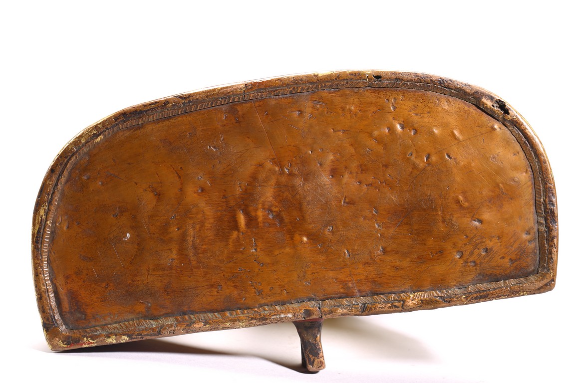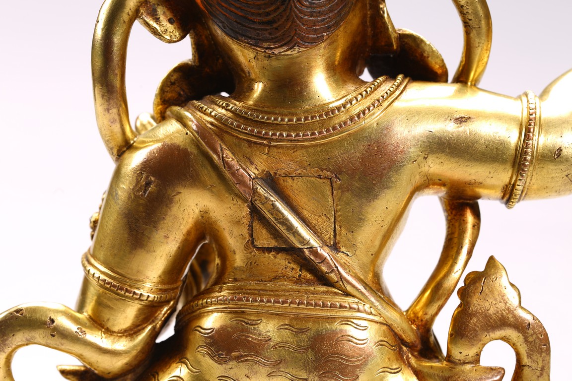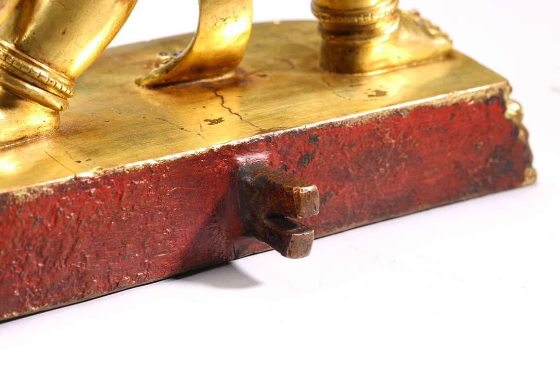 Provenance: Important Private collection, New York 此尊為典型的西藏丹薩替寺風格造像。全身鎏金,雙腳呈弓子字步站立,右手持金剛杵高舉過頭,左手屈於前胸,結期克印,代表降服與毀滅;臉盆方圓寬大,四肢粗壯,杏仁眼圓睜,皺鼻憤怒,咧嘴露牙,額頭寬而低,中間有一目,威嚴兇猛;頭帶寶冠,紅色怒發上衝,凸顯忿怒像,耳掛大鐺垂於肩膀;上半身袒露,下身著短裙;周身披瓔珞,項鏈、手鐲、臂釧、足釧,瓔珞鑲嵌各色寶石,寶石尚存,將佛像原來風貌一一展現出,極為難得。銅像四臂粗壯,細節精緻細膩,鎏金厚實,具有極佳的藝術和歷史價值。 金剛手,又名“秘密主”,屬金剛部,因手持金剛杵得名,為大勢至菩薩的忿怒化現,司大能力,亦稱“大力尊”。金剛手菩薩,具有除惡降魔的廣大神力。在西藏地區,也是相當重要的雨神。與觀音菩薩、文殊菩薩合稱“三族姓尊”(雪域三怙主)、“事部三怙主”,分別代表“伏惡、慈悲、智慧”三種特質,也為“八大菩薩”(文殊、普賢、虛空藏、地藏王、觀世音、金剛手、彌勒、除蓋障)之一。是大勢至菩薩的忿怒化現,司大能力,亦稱“大力尊”。金剛手菩薩為統攝財寶天王(四大天王之北方毗沙門天王,即多聞天王)與財神護法等夜叉部之主尊,亦為像頭王、龍王和阿修羅之部尊。 來源:紐約重要藏家舊藏