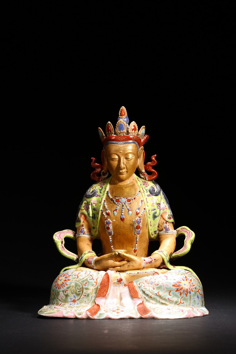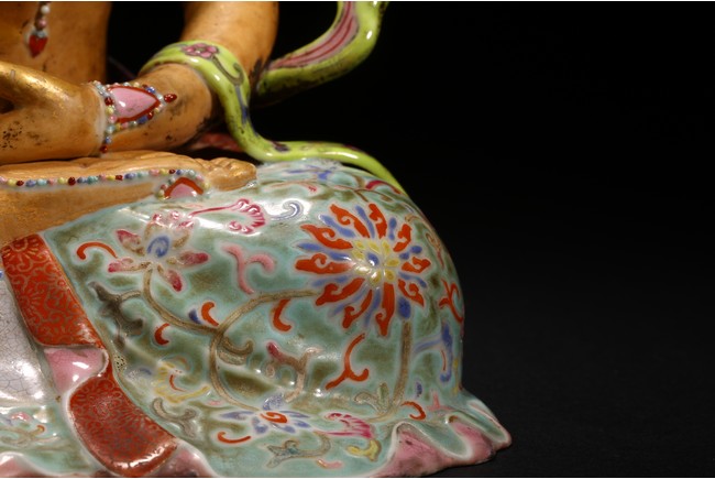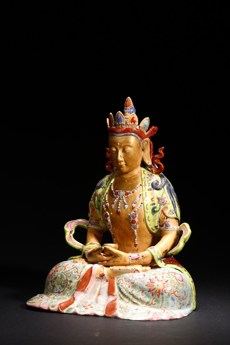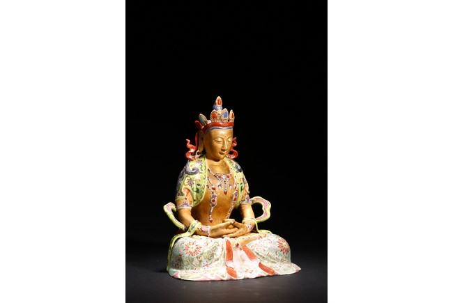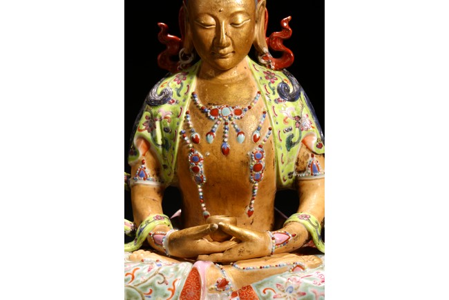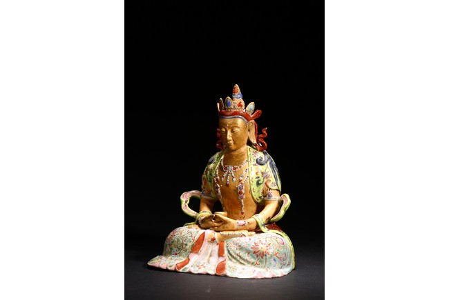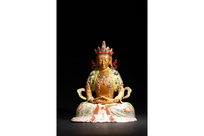 Seated in dhyanasana, the hands held in dhyanamudra supporting a bowl, the shoulders draped with a billowing lime-green shawl detailed with stylised lotus scrolls, the dhoti with an outer layer decorated with gilt floral scrolls on an iron-red ground revealing the bright turquoise inner layer with further floral roundels, the gilt body adorned with ornamental jewels, the serene face surmounted with a five-leaf crown over blue hair swept into a topknot with the rest falling over the shoulders. Qing Dynasty period.