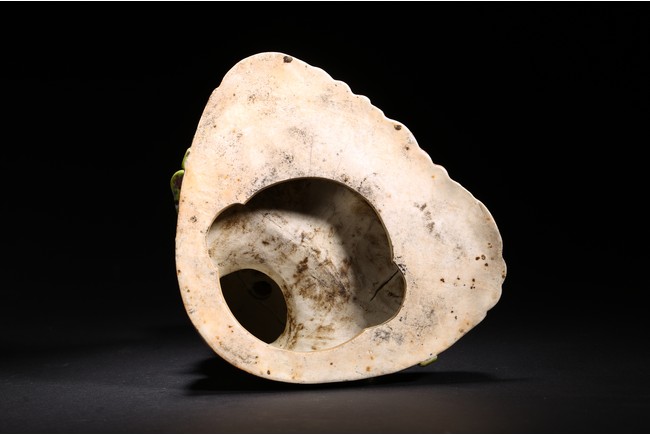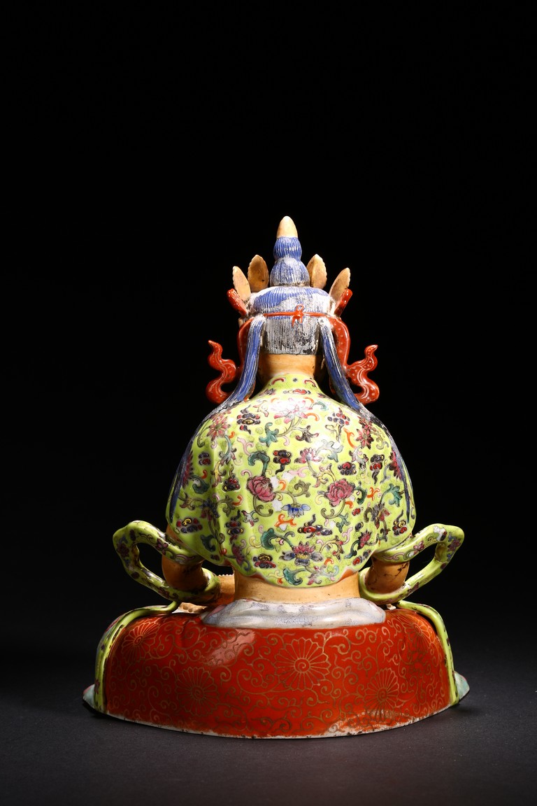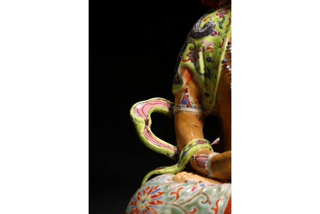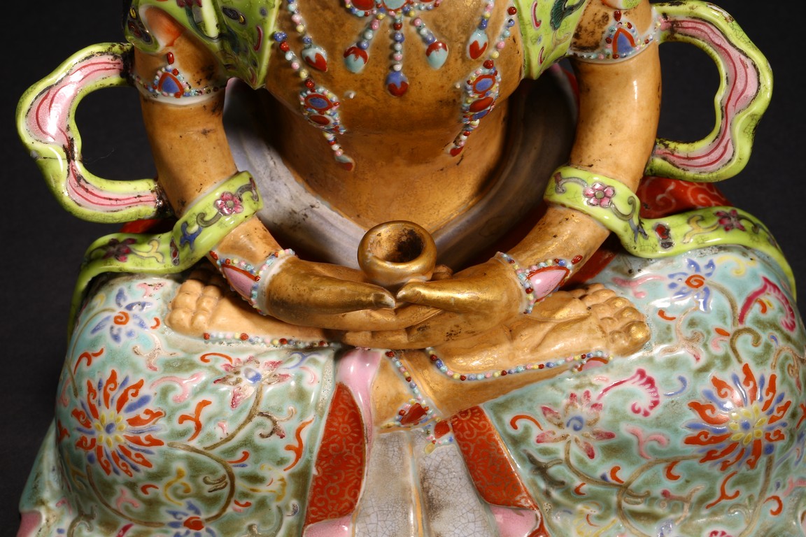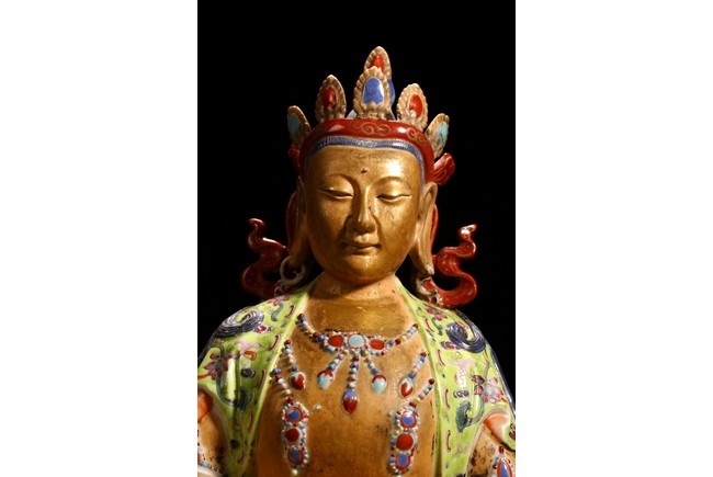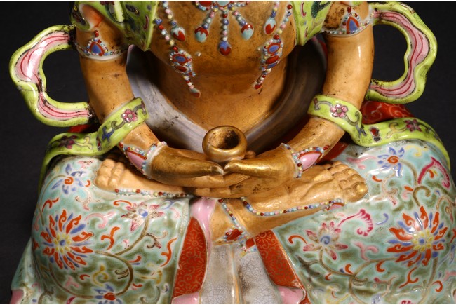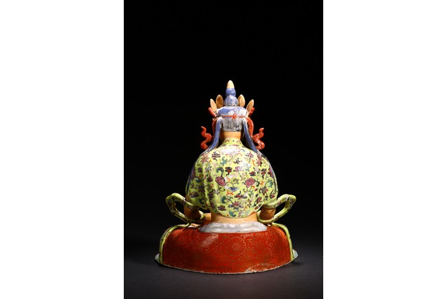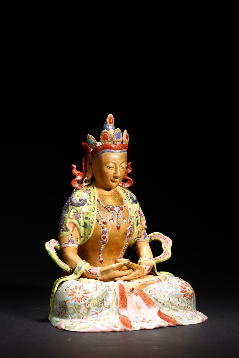Seated in dhyanasana, the hands held in dhyanamudra supporting a bowl, the shoulders draped with a billowing lime-green shawl detailed with stylised lotus scrolls, the dhoti with an outer layer decorated with gilt floral scrolls on an iron-red ground revealing the bright turquoise inner layer with further floral roundels, the gilt body adorned with ornamental jewels, the serene face surmounted with a five-leaf crown over blue hair swept into a topknot with the rest falling over the shoulders. Qing Dynasty period.