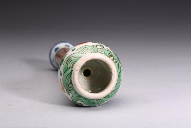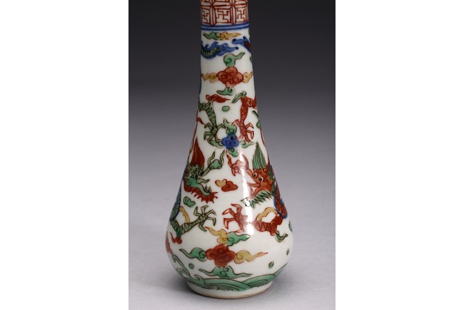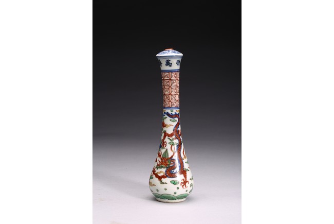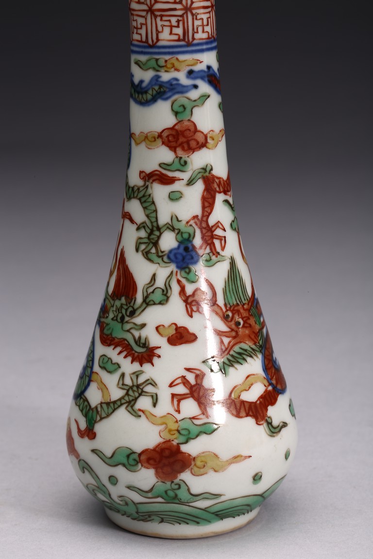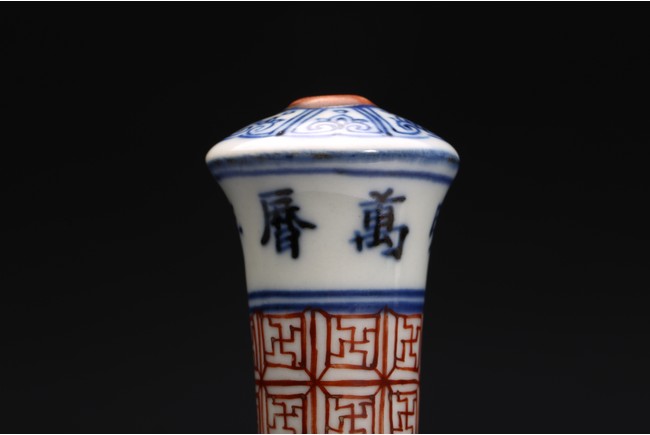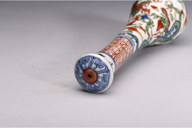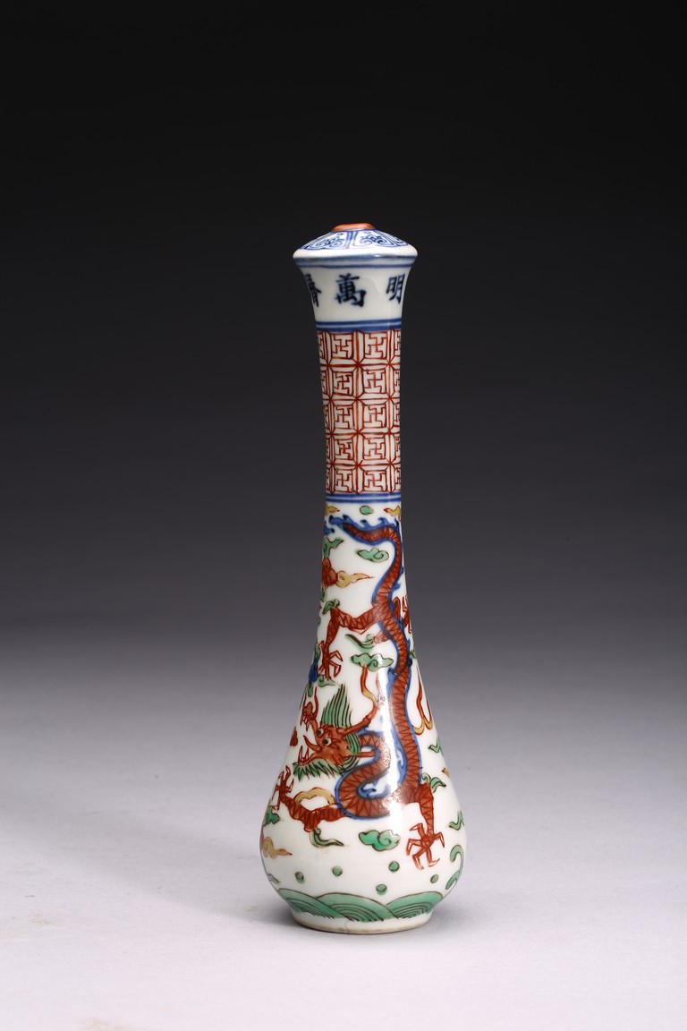 文具瓷是明代官窯中的特殊門類,其中瓷質毛筆筆管形狀各異,以五彩、青花兩種較為常見。此件筆桿以白釉為地,以紅、黃、綠彩及青花繪畫雲龍紋裝飾,為明代五彩文房用具中的珍品。筆管上部繪祥雲紋,為萬曆時期特有的雲紋畫法,中間豎著繪畫出兩條雲龍紋穿梭於火雲之中,雲龍造型古拙,為嘉靖、萬曆時期特有之風格。筆管下端飾福海壽山紋,筆端書青花“大明萬曆年制”六子楷書橫款。本品所飾之彩色澤鮮妍,華麗凝重,塗施勻淨厚潤,益見滄桑猶存的厚重感。