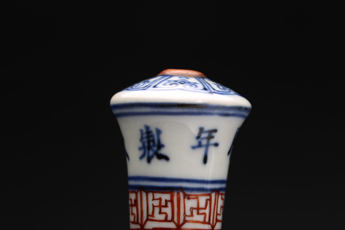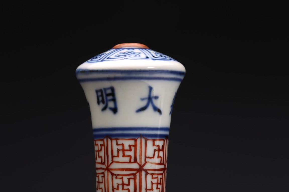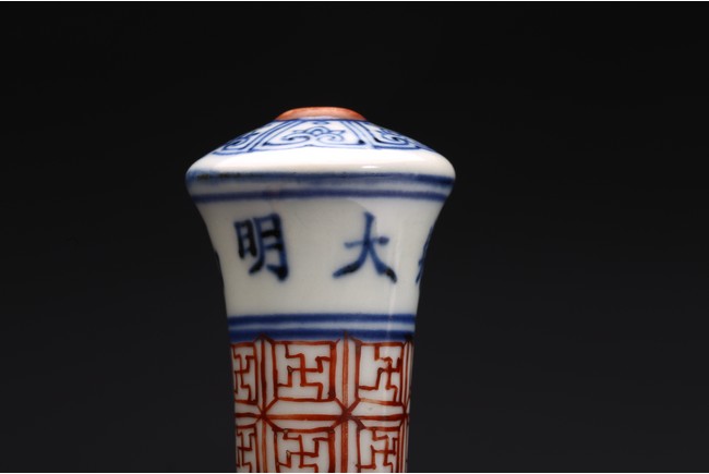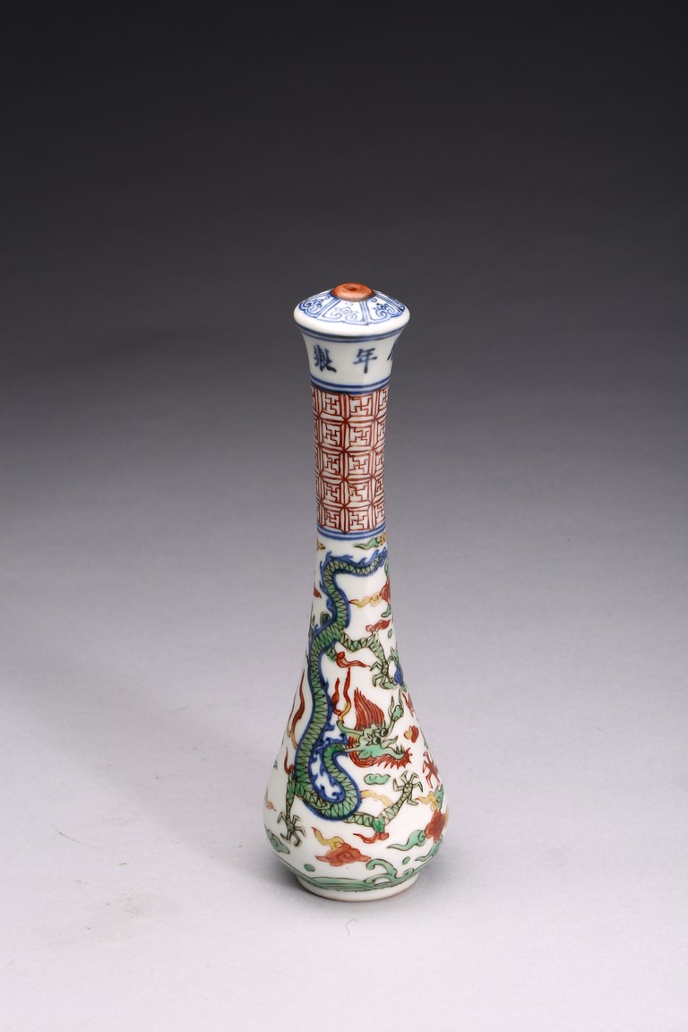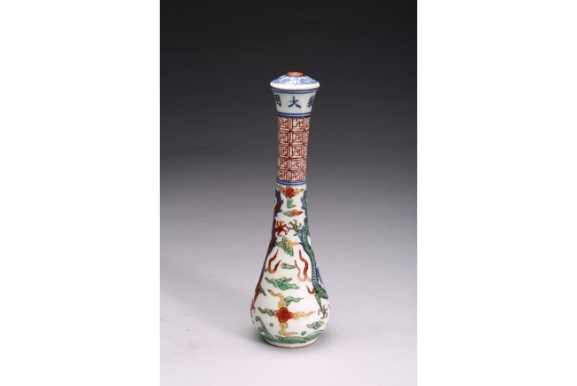 文具瓷是明代官窯中的特殊門類,其中瓷質毛筆筆管形狀各異,以五彩、青花兩種較為常見。此件筆桿以白釉為地,以紅、黃、綠彩及青花繪畫雲龍紋裝飾,為明代五彩文房用具中的珍品。筆管上部繪祥雲紋,為萬曆時期特有的雲紋畫法,中間豎著繪畫出兩條雲龍紋穿梭於火雲之中,雲龍造型古拙,為嘉靖、萬曆時期特有之風格。筆管下端飾福海壽山紋,筆端書青花“大明萬曆年制”六子楷書橫款。本品所飾之彩色澤鮮妍,華麗凝重,塗施勻淨厚潤,益見滄桑猶存的厚重感。