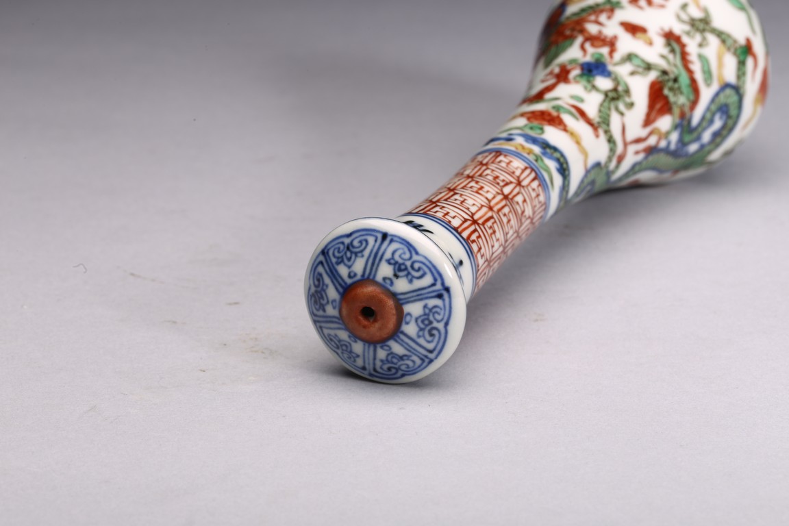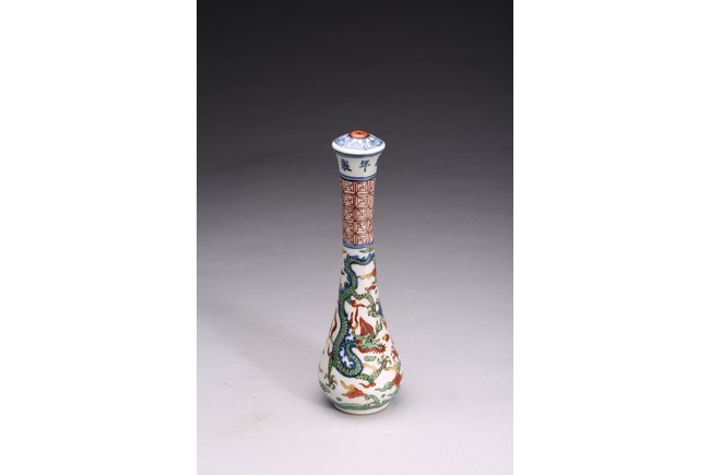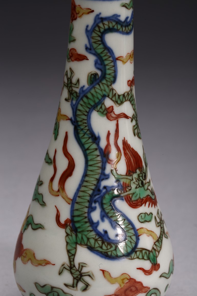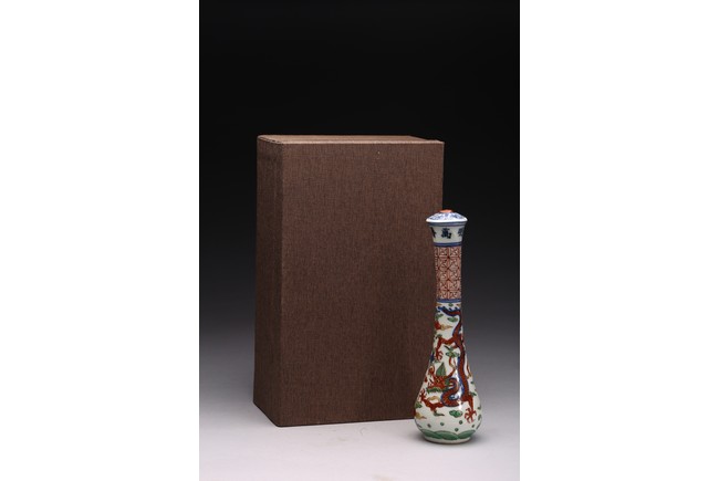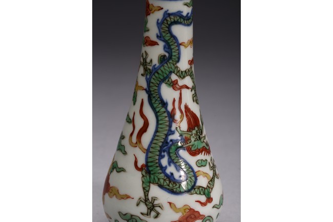 Elongated pear shape with flat bottom and flared neck, the convex top decorated with floral motifs, the body depicting two dragons interspersed with flaming pearls in underglaze blue and overglaze enamel of iron red and green, three double-line bands in underglaze blue around the neck and mouth, a geometric band in iron red along the bottom, Wanli mark along top neck. Late Ming Dynasty period.