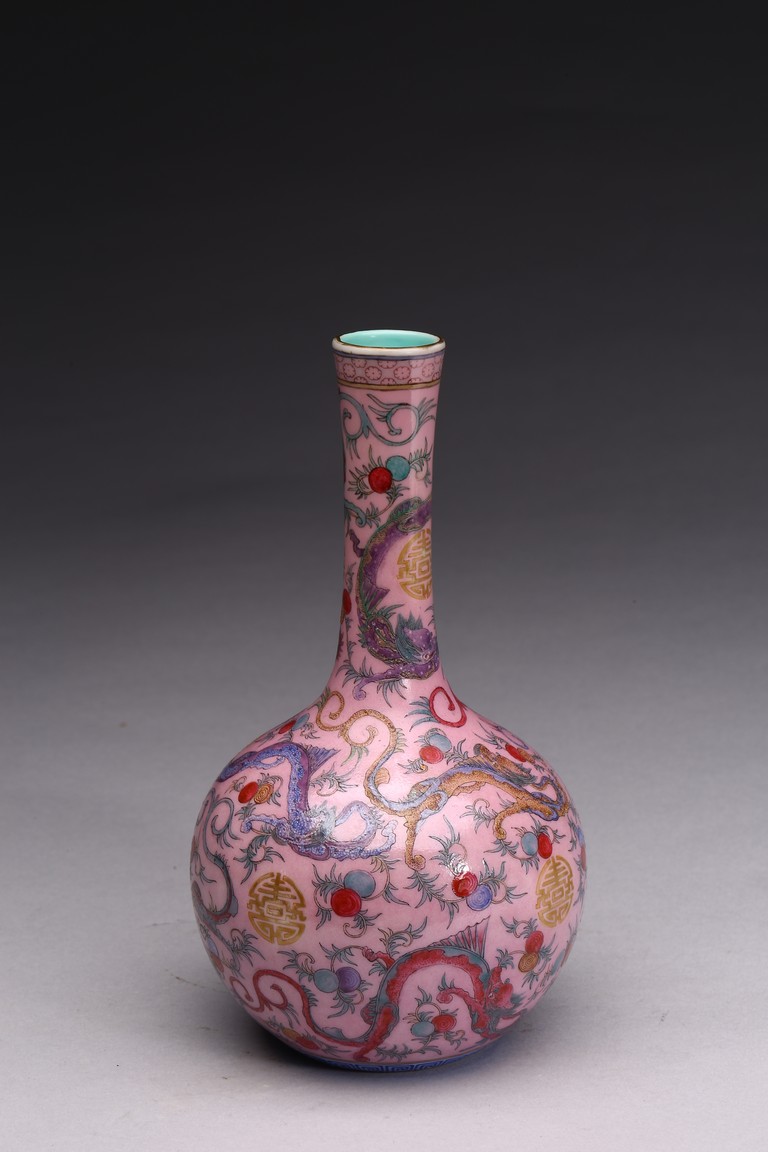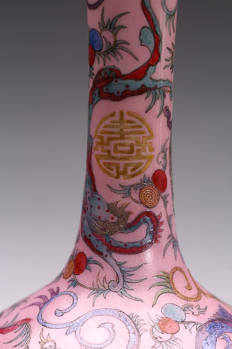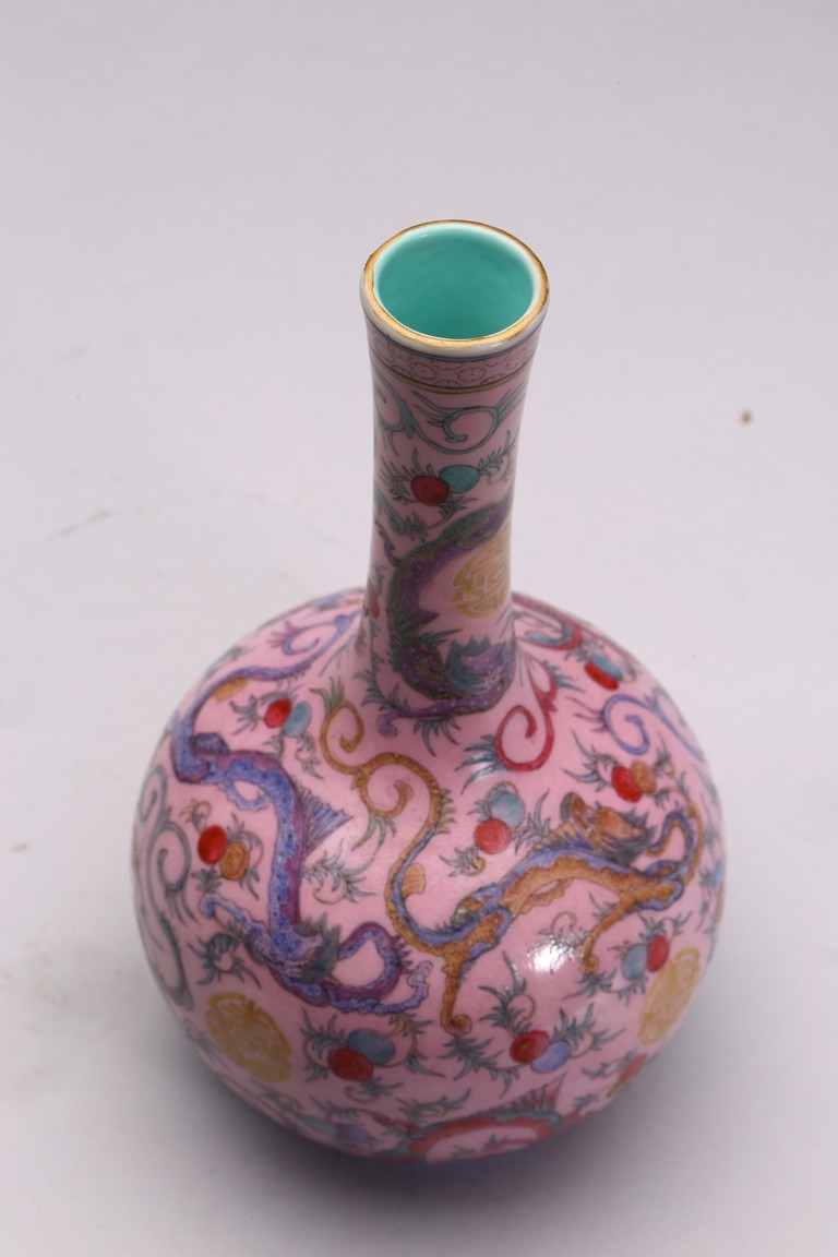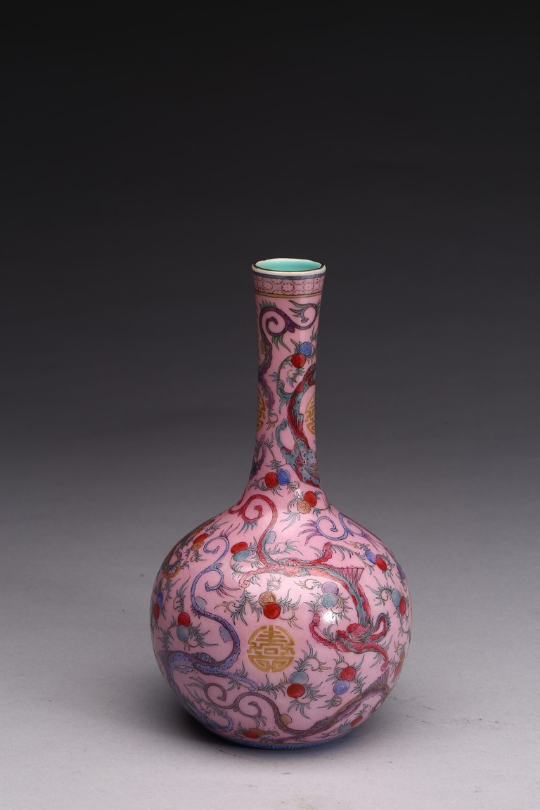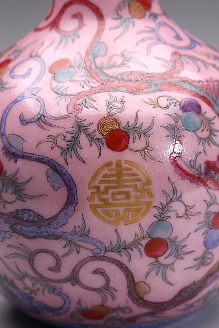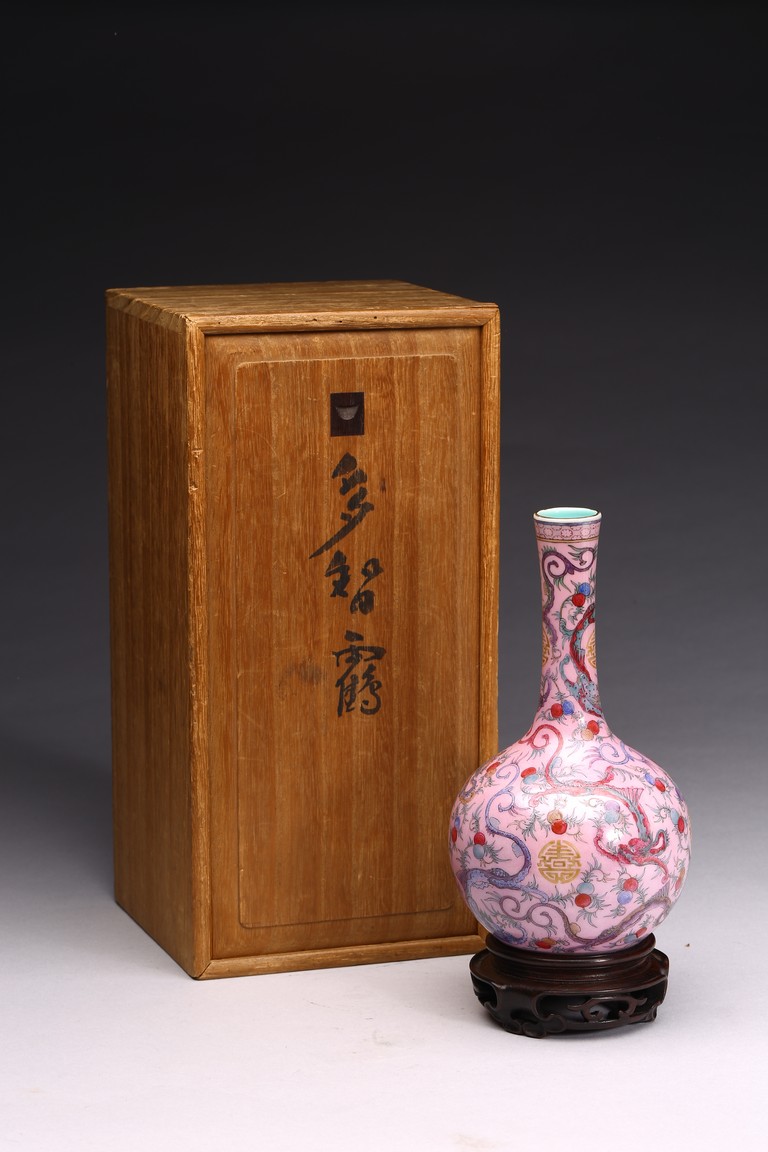 本品器型規整,細長頸,豐肩,腹部渾圓,呈球形,線條秀逸。全器通體以胭脂粉為地,明淨艷麗,嬌嫩欲滴,用粉彩飾“龍紋”,龍身矯健,雙目炯炯有神,鬚髮披散,氣勢磅礡,將飛龍在天的靈動體現得淋漓盡致,極富藝術表現力。用描金繪“壽字紋”,器物內壁及底施松石綠釉。底部用青花繪“迴紋”一週。整器釉質潤澤,色彩鮮亮,富有天然韻致,尤顯大氣雅緻、風韻雋永,堪為陳設佳器。 “大清乾隆年制”款識。配硬木底座。