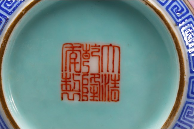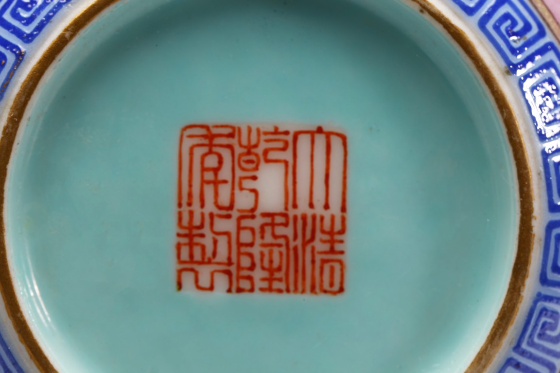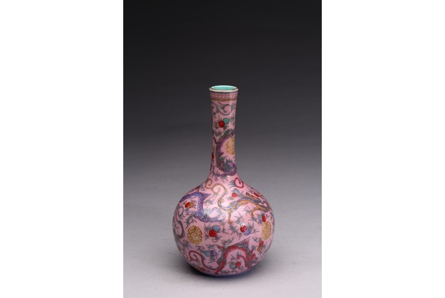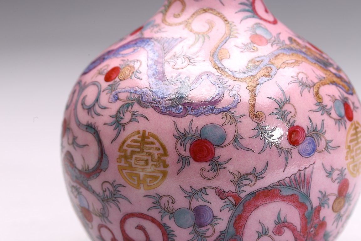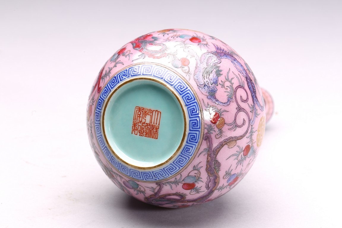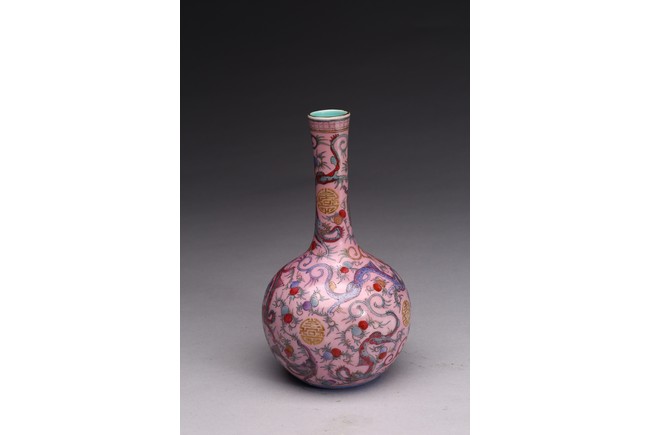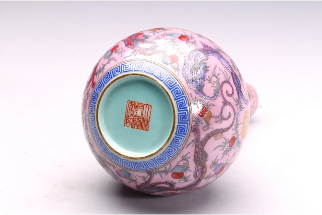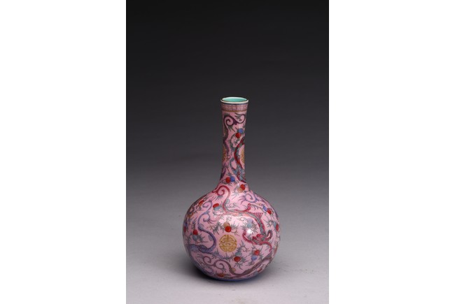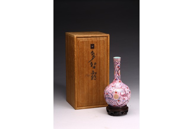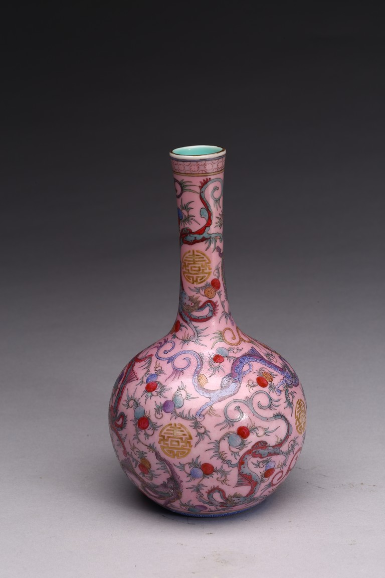 本品器型規整,細長頸,豐肩,腹部渾圓,呈球形,線條秀逸。全器通體以胭脂粉為地,明淨艷麗,嬌嫩欲滴,用粉彩飾“龍紋”,龍身矯健,雙目炯炯有神,鬚髮披散,氣勢磅礡,將飛龍在天的靈動體現得淋漓盡致,極富藝術表現力。用描金繪“壽字紋”,器物內壁及底施松石綠釉。底部用青花繪“迴紋”一週。整器釉質潤澤,色彩鮮亮,富有天然韻致,尤顯大氣雅緻、風韻雋永,堪為陳設佳器。 “大清乾隆年制”款識。配硬木底座。