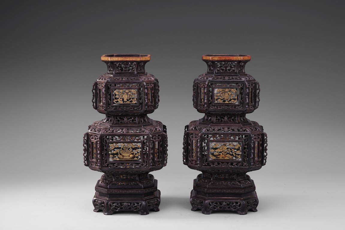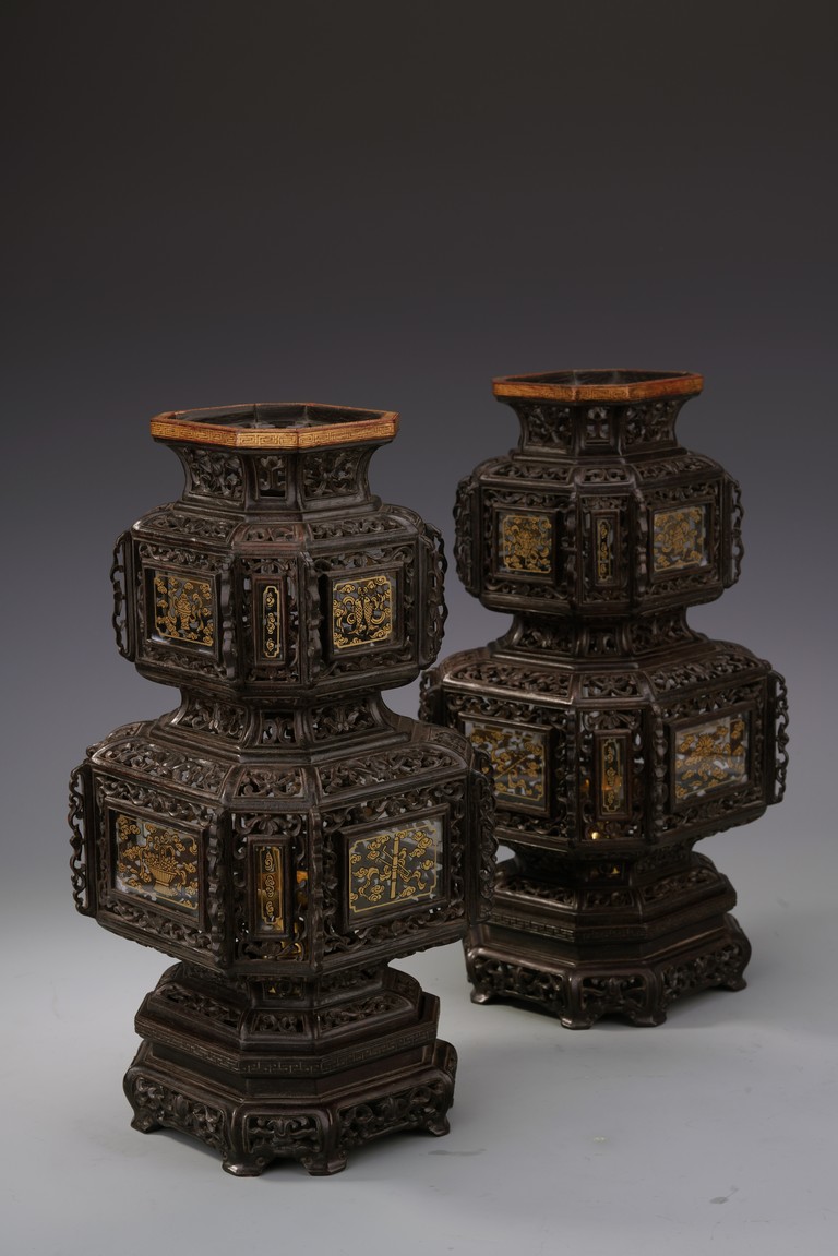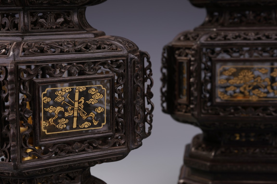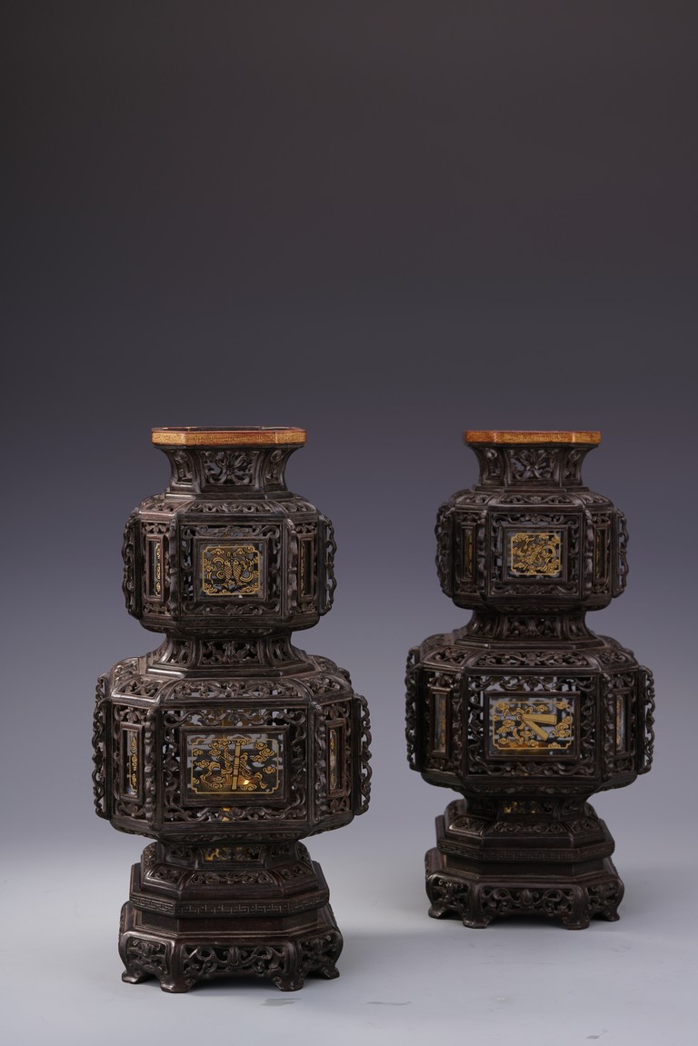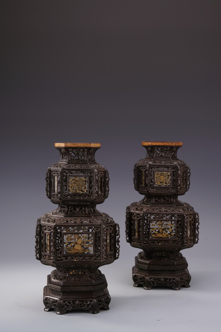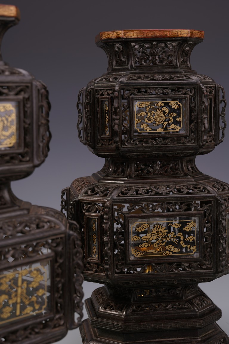 Each of double gourd octagonal form, the side inset with a glass panel with gilt painted design of the eight auspicious motif, framed by openwork stylized lotus designs, rising to flared mouth and supported on spreading feet, all supported on fitted zitan stand.