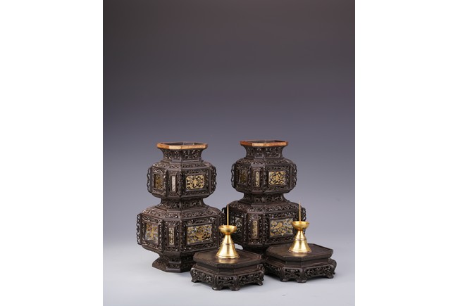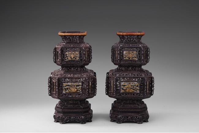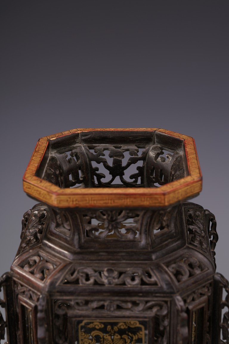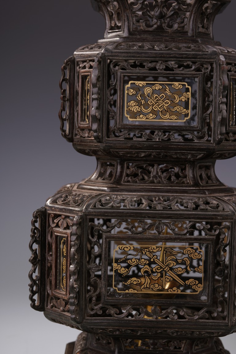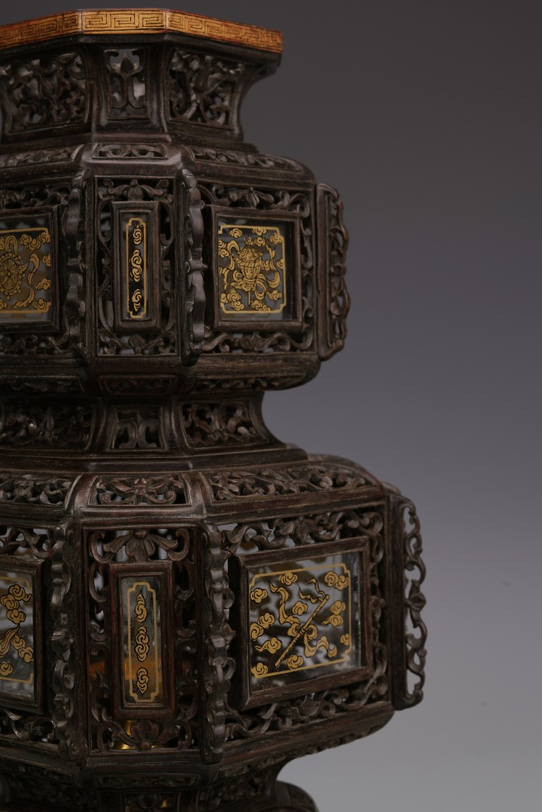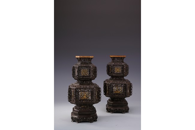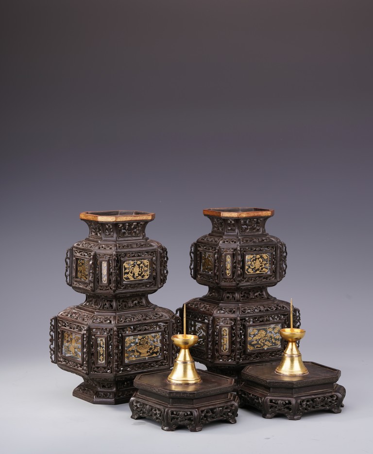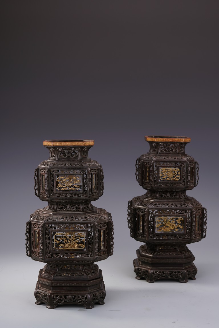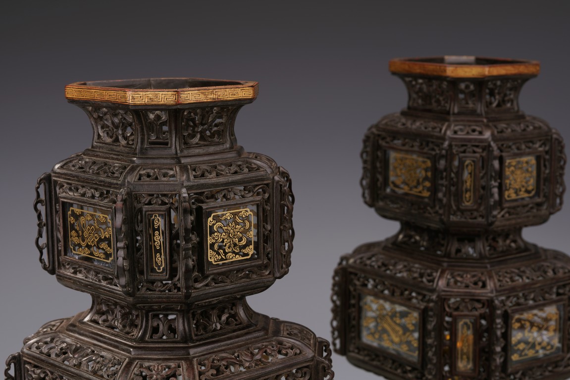 Each of double gourd octagonal form, the side inset with a glass panel with gilt painted design of the eight auspicious motif, framed by openwork stylized lotus designs, rising to flared mouth and supported on spreading feet, all supported on fitted zitan stand.