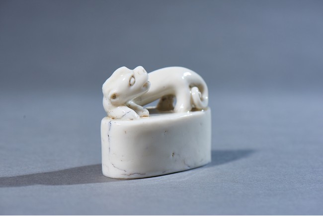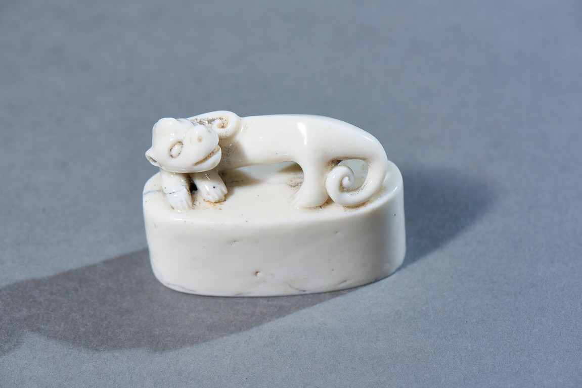 Of oval form, seal base inscribed with three character mark and surmounted with a sinuous chilong.