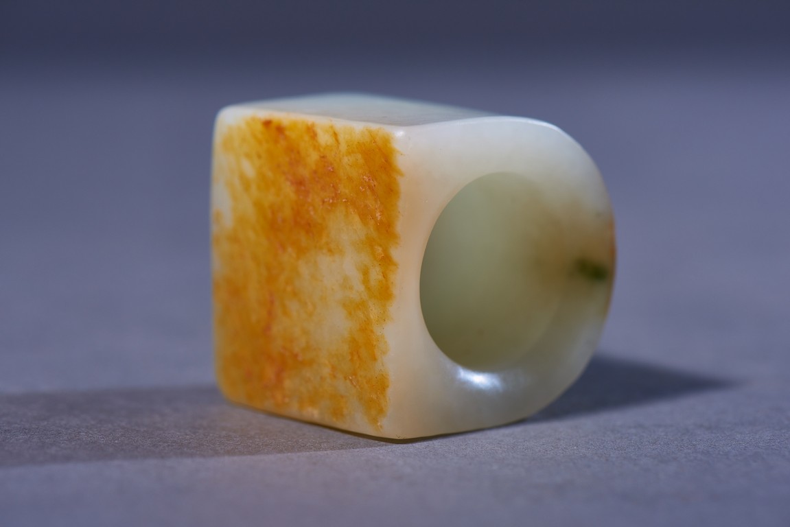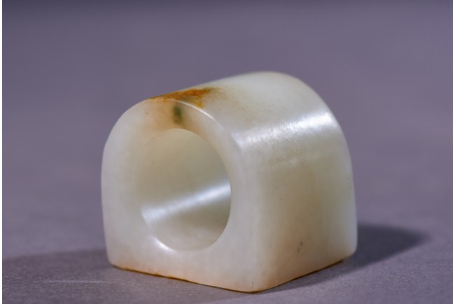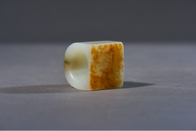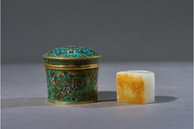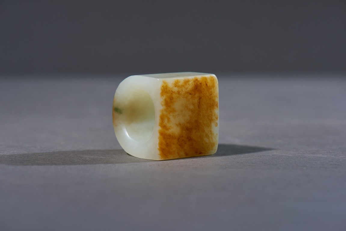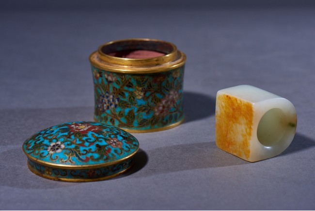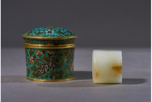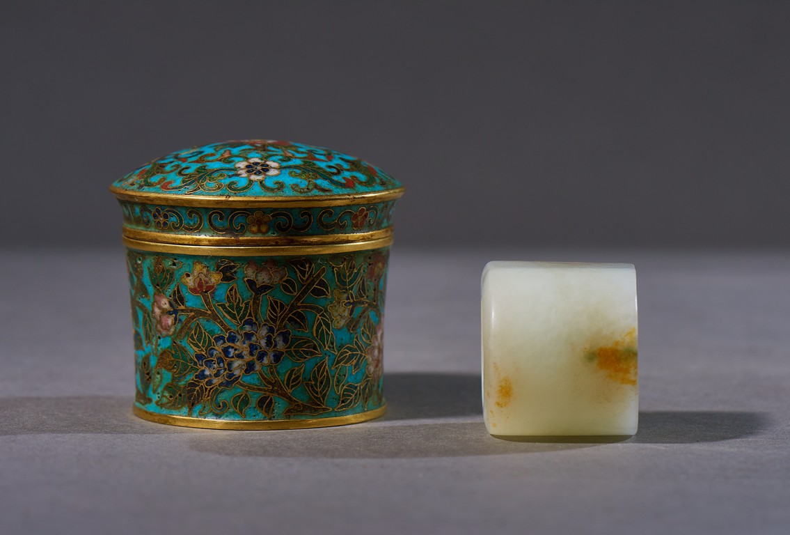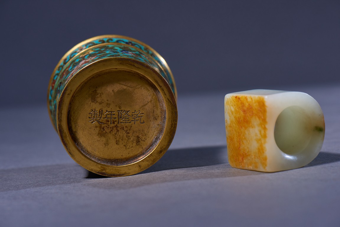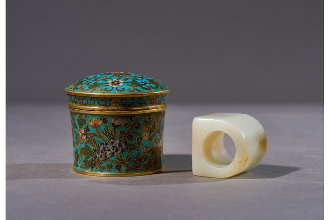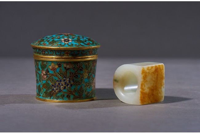The archer's ring is of plain design, with one side carved flat showing the russet skin, accompanied with a cloisonne enamel box and cover with base inscribed with four character Qianlong mark. Qing Dynasty Qianlong period.
