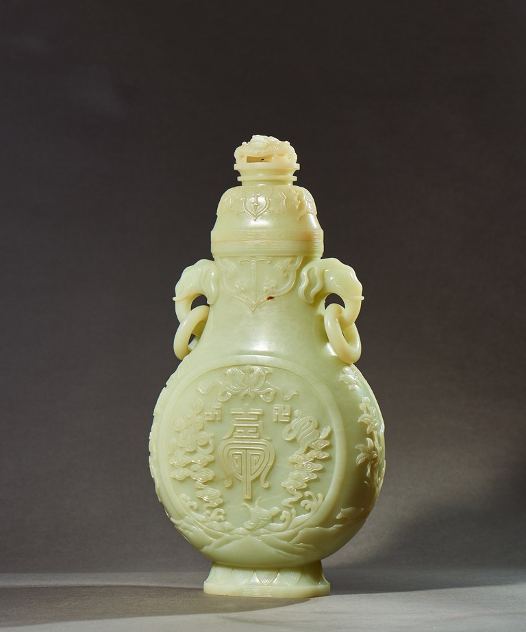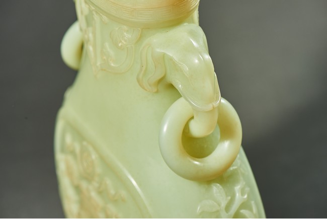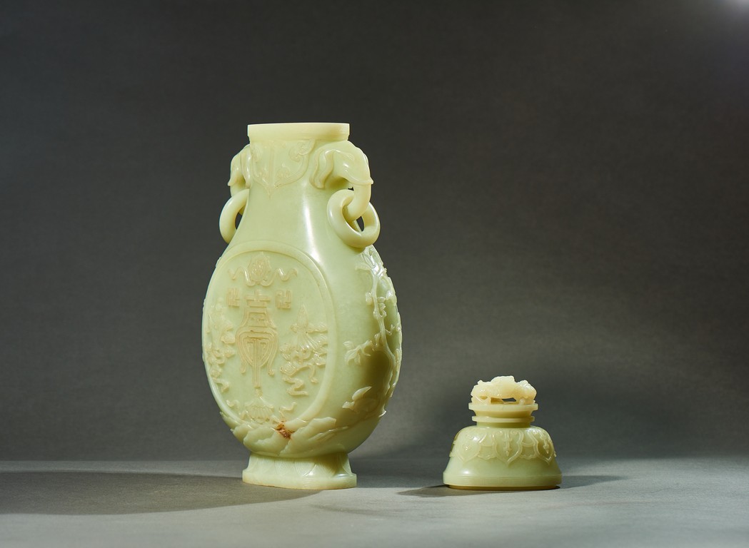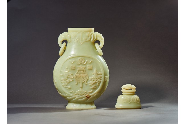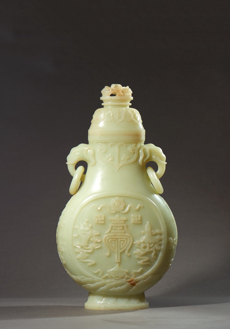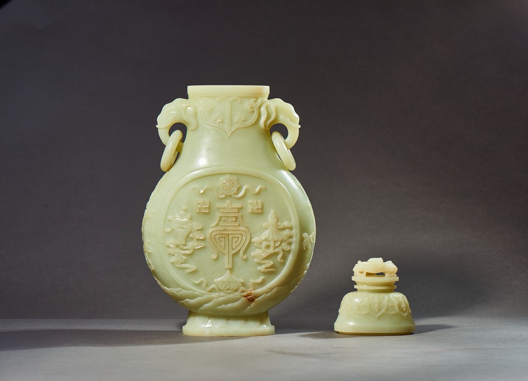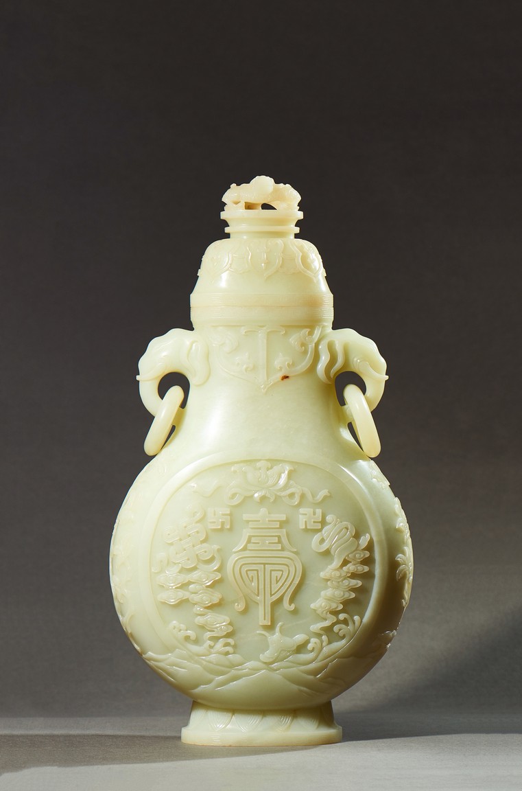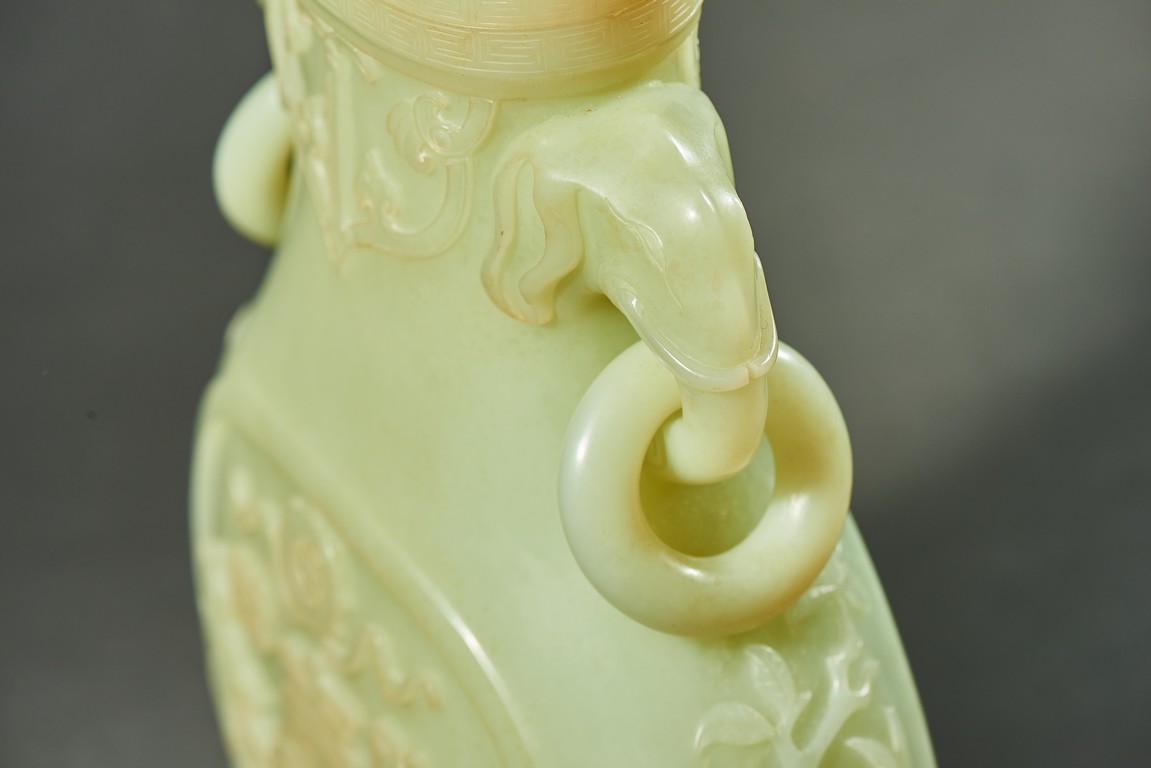Provenance: Private collection, Vancouver, Canada 玉質純淨,細膩晶瑩,溫潤而通透,形制規整,素雅秀美。呈扁圓形,長頸,兩側飾對稱啣環像耳,二層台式圈足,蓋鈕飾龍紋,子母口緊密相合,蓋與口沿裝飾一週迴紋。器身飾“壽字紋” “卐字紋”“靈芝雲紋”“蕉葉紋”,工整華美,古意盎然。此瓶為陳設用器,優雅端莊,皇家氣韻十足。 來源:加拿大溫哥華私人藏家舊藏