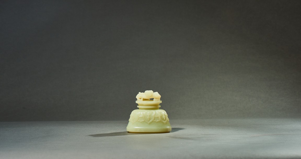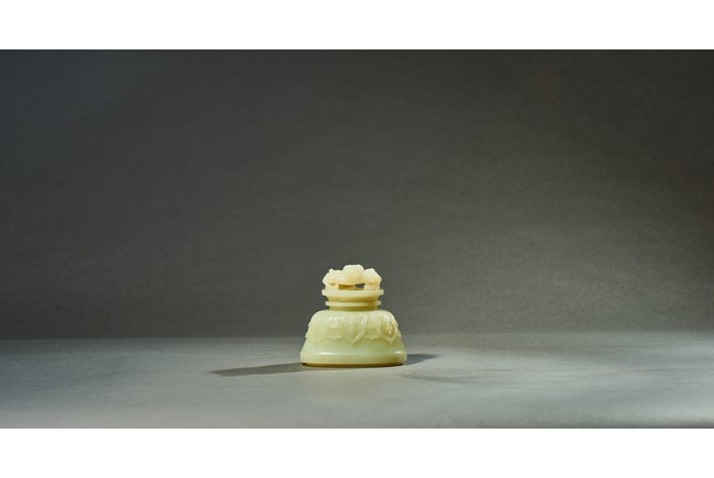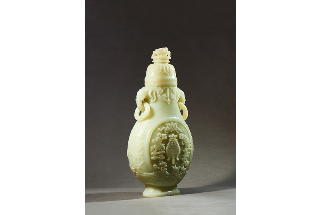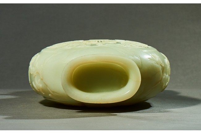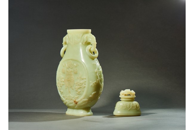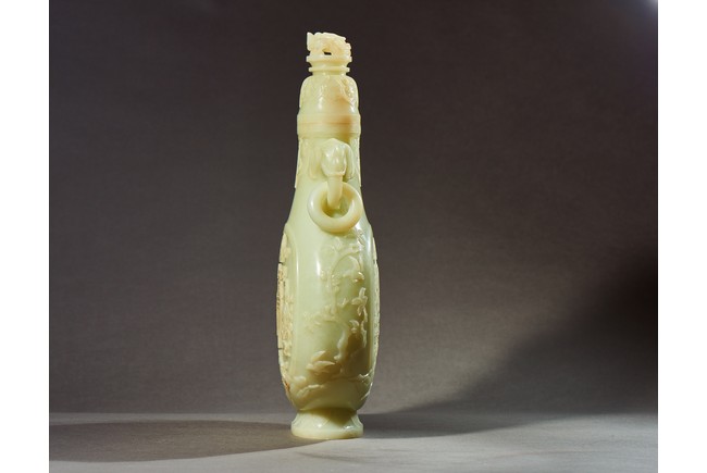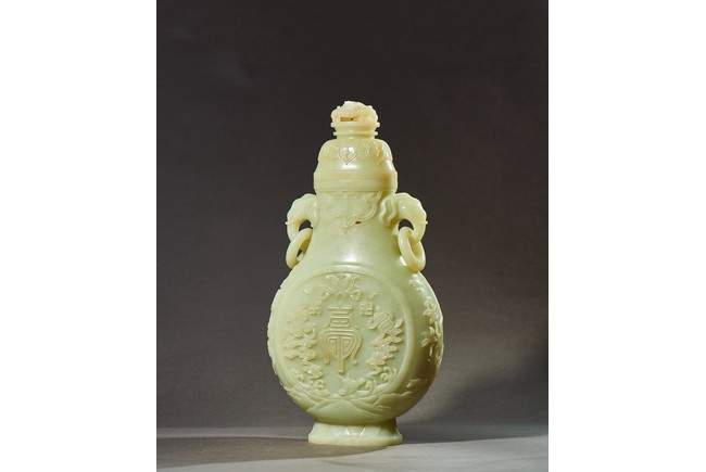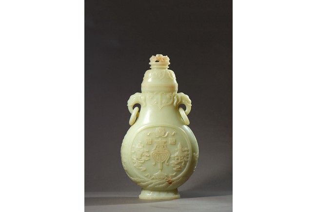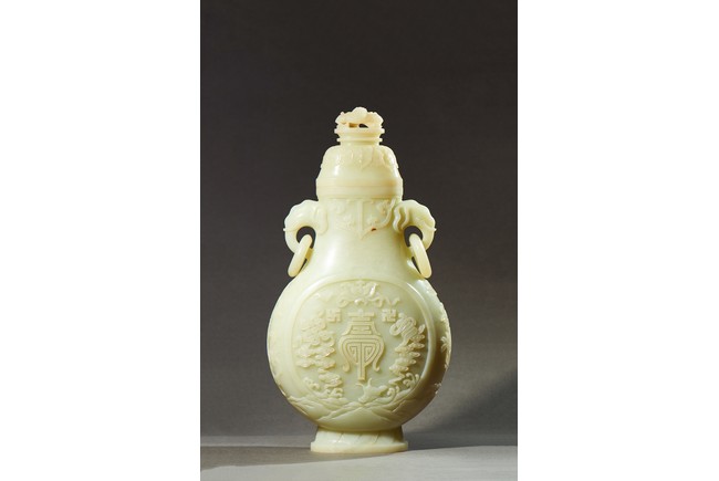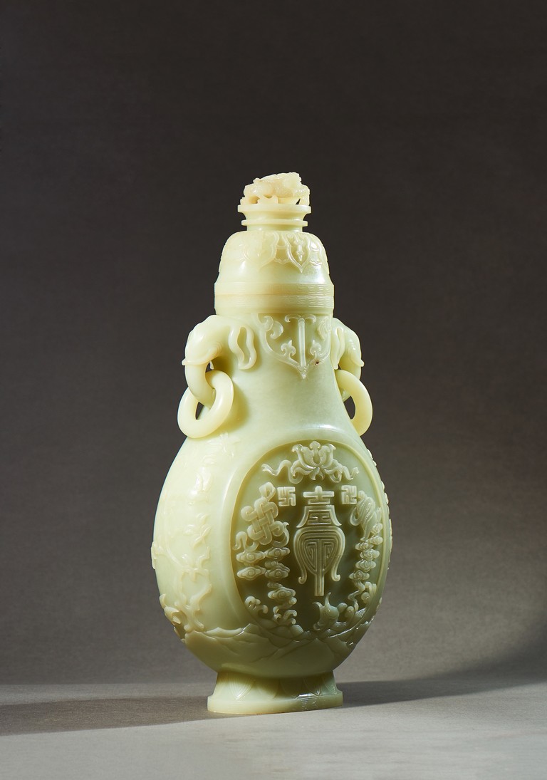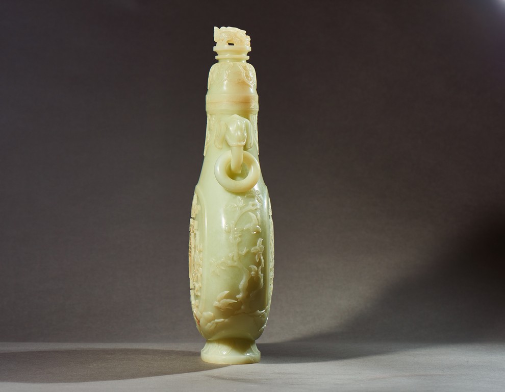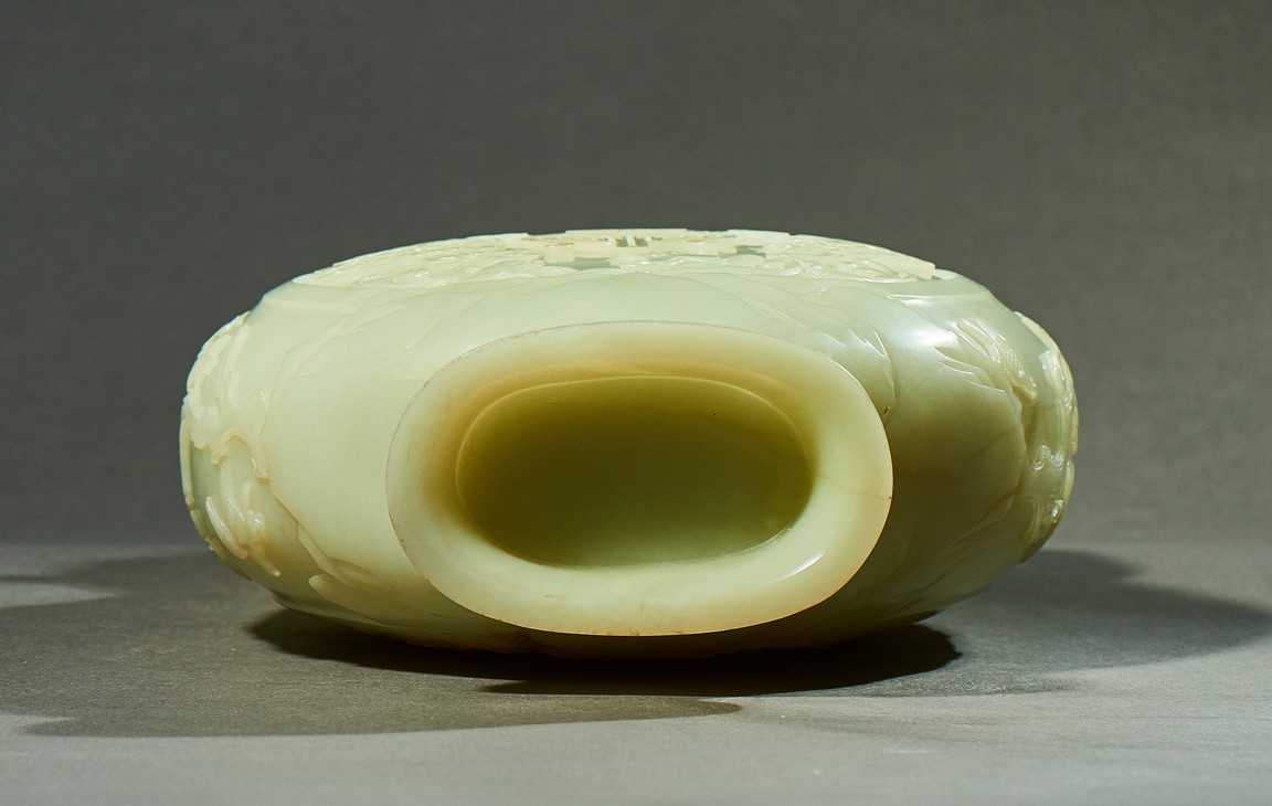 Provenance: Private collection, Vancouver, Canada 玉質純淨,細膩晶瑩,溫潤而通透,形制規整,素雅秀美。呈扁圓形,長頸,兩側飾對稱啣環像耳,二層台式圈足,蓋鈕飾龍紋,子母口緊密相合,蓋與口沿裝飾一週迴紋。器身飾“壽字紋” “卐字紋”“靈芝雲紋”“蕉葉紋”,工整華美,古意盎然。此瓶為陳設用器,優雅端莊,皇家氣韻十足。 來源:加拿大溫哥華私人藏家舊藏