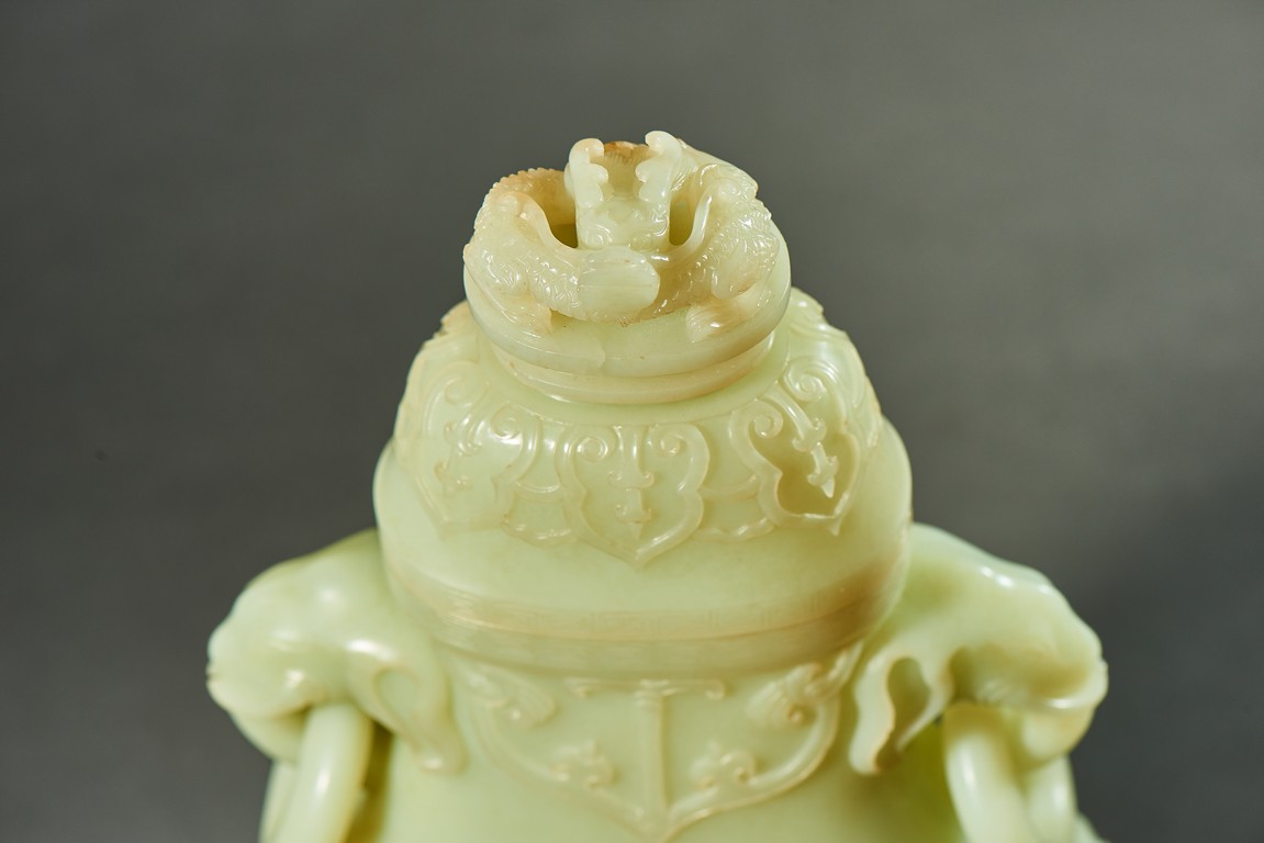 The vase is carved to each side with a central roundel enclosing a stylized shou character flanked by two wan symbols and further surrounded by four Buddhist Emblems on both front and reverse, above mountains and the sides carved with flowers in shall relief.The openwork handles are carved in the form of elephant heads, fitted with domed cover surmounted with a seated dragon finial. Mid-Qing Dynasty period.