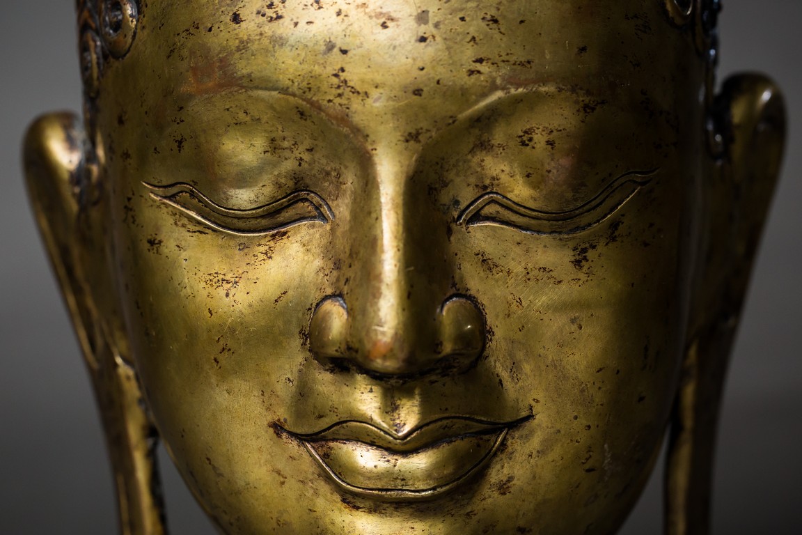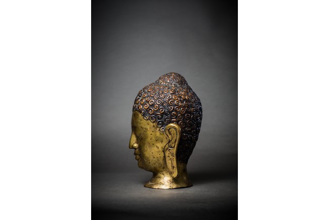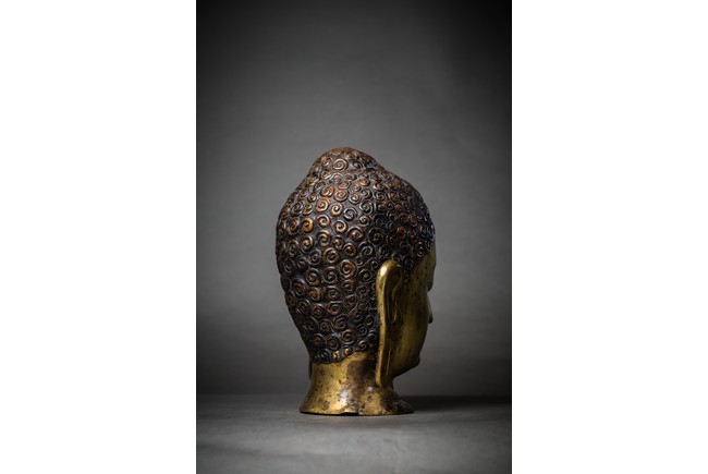 此尊佛頭體型巨大,十分罕見,頂有肉髻,細長的彎眉,雙眼俯視,隆鼻挺秀,雙唇微啟,大耳垂肩,一副慈善、笑意濃濃的面相豁然於眼前。整個佛首保留原裝鎏金,狀態完好,其整體造型典雅,氣韻不凡,端莊大氣,雄渾沉穩,不失為一件空間呈設之藝術上品。佛頭體型巨大,有如此巨大佛頭,可以想像當年完整佛身應是何等壯觀,著實讓人感嘆古人鑄造技藝之高超,敬佛崇聖之心誠。