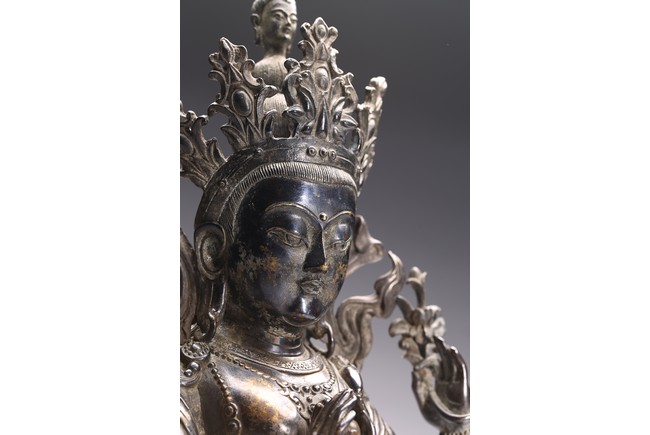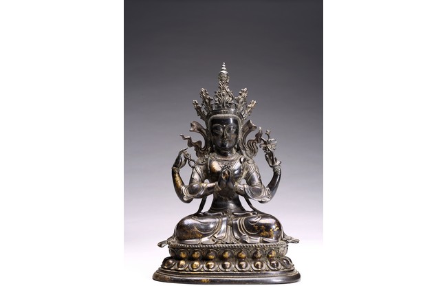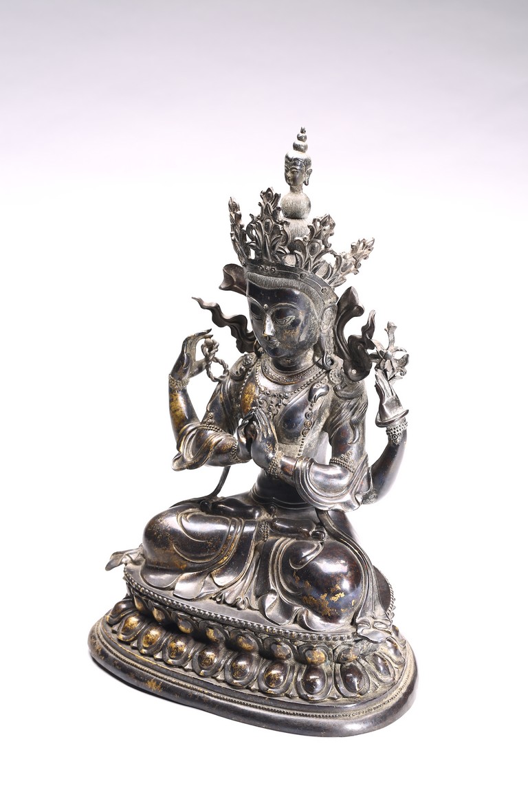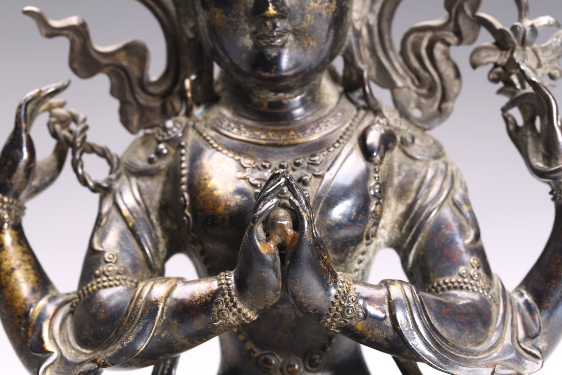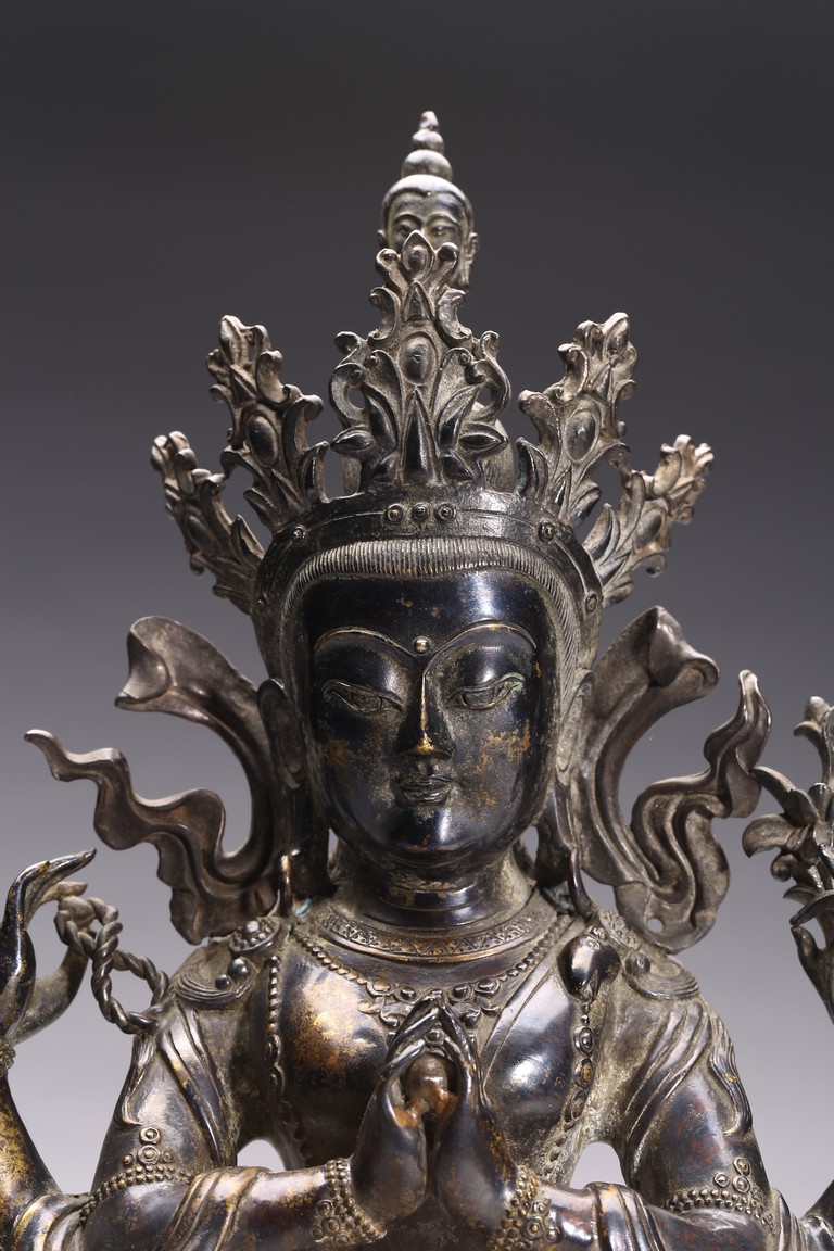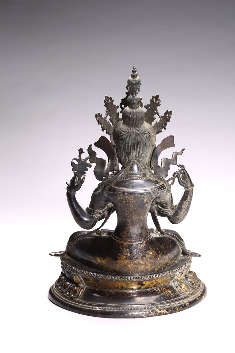 四臂觀音又稱“六字觀音”,是觀音菩薩在藏傳佛教中最為常見的形象,深受藏地僧俗崇奉,有“雪域怙主”之稱。此尊結全跏跌坐於蓮花寶座之上,主臂雙手合十,右上手應原持念珠,左上手執蓮花,是四臂觀音的典型姿態。頭戴五葉寶冠,正中冠葉為花朵狀,髮髻高聳,髻頂有一阿彌陀佛,耳際寶繒飛揚,面相方正,眉目細長,雙眉相連,著菩薩裝,上身袒露,胸前飾項圈、瓔珞,下身著長裙。坐於束腰仰覆式蓮花座上,蓮座上下緣飾有連珠紋,蓮瓣寬厚整齊,為西藏造像成熟時期常見的樣式。