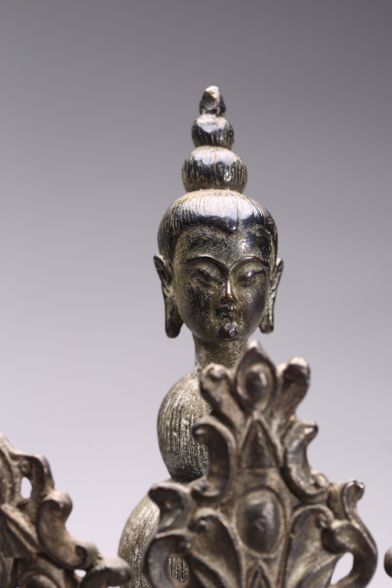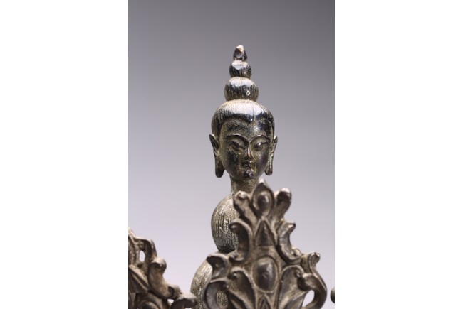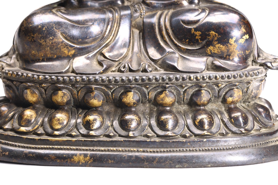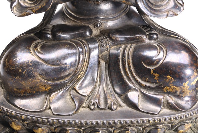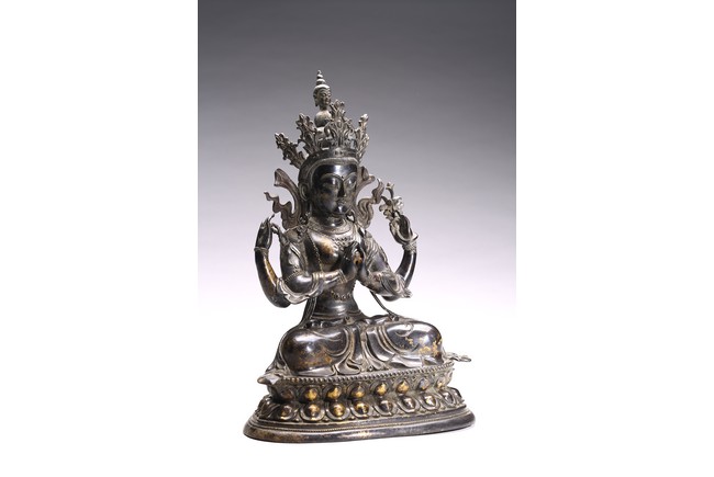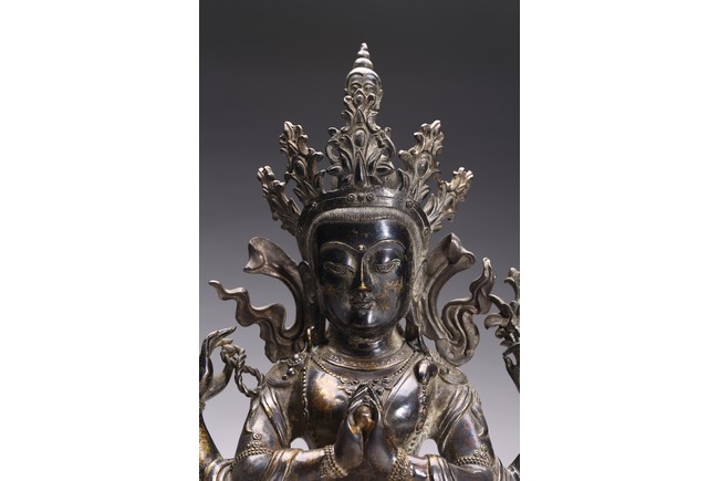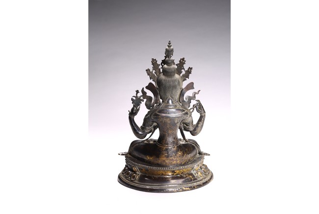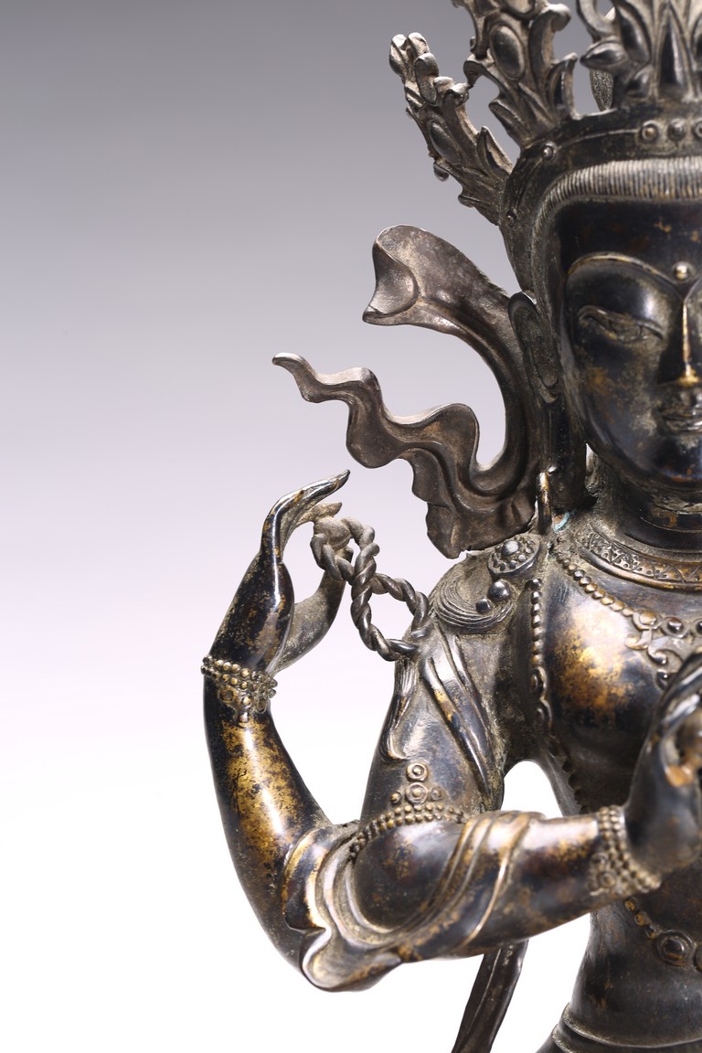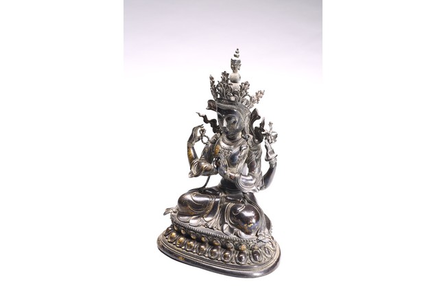 四臂觀音又稱“六字觀音”,是觀音菩薩在藏傳佛教中最為常見的形象,深受藏地僧俗崇奉,有“雪域怙主”之稱。此尊結全跏跌坐於蓮花寶座之上,主臂雙手合十,右上手應原持念珠,左上手執蓮花,是四臂觀音的典型姿態。頭戴五葉寶冠,正中冠葉為花朵狀,髮髻高聳,髻頂有一阿彌陀佛,耳際寶繒飛揚,面相方正,眉目細長,雙眉相連,著菩薩裝,上身袒露,胸前飾項圈、瓔珞,下身著長裙。坐於束腰仰覆式蓮花座上,蓮座上下緣飾有連珠紋,蓮瓣寬厚整齊,為西藏造像成熟時期常見的樣式。