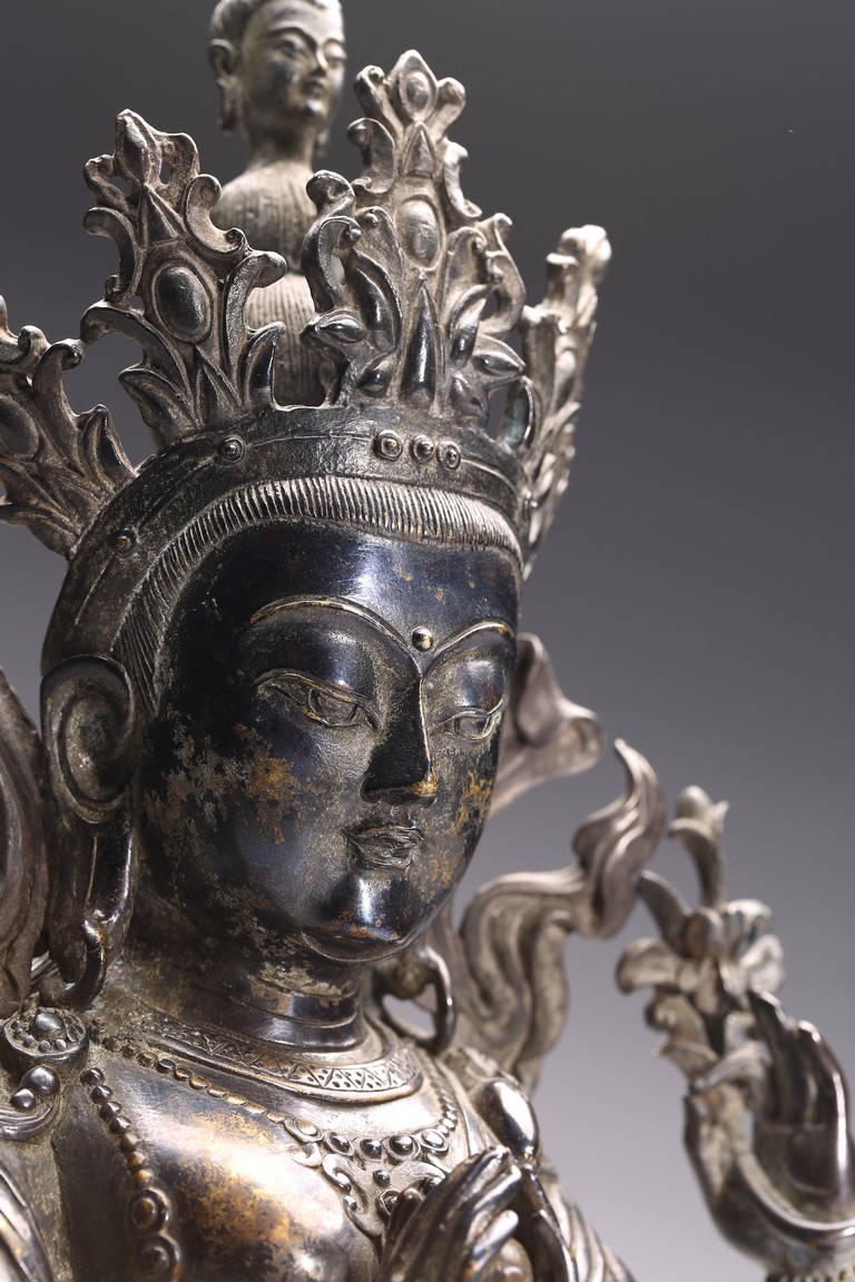 The figure seated in dhyanasana on a lotus pedestal, the principle hands in namaskar mudra, the secondary hands raised with one holding a flower, and the other holding necklace, wearing beaded jewelry, draped with a billowing celestial scarf around the arms falling to the base, the serene face with a downcast expression wearing a five-point diadem and hair in a top knot surmounted by a figure of Amitabha. Qing Dynasty period.