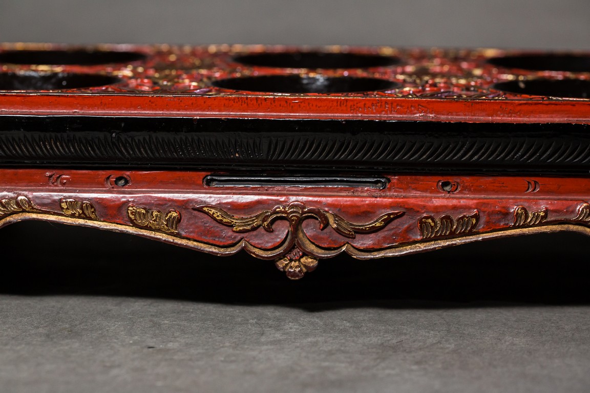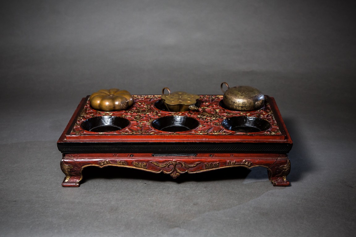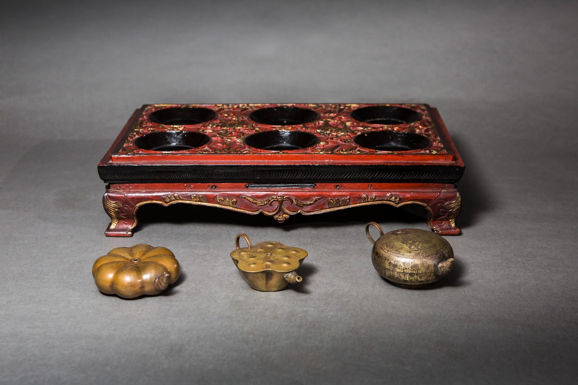 Comprising of three shallow bronze waterpots modelled in various forms, fitted on the same red lacquered stand supported on four feet. Qing Dynasty period.
