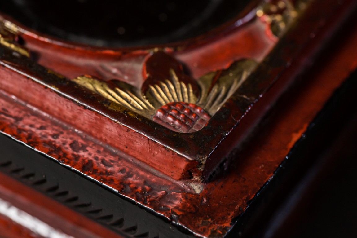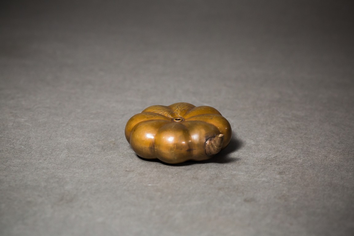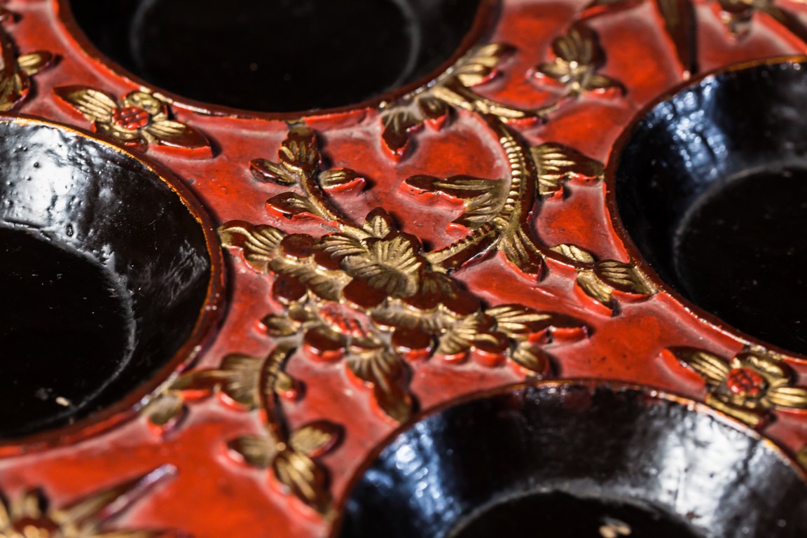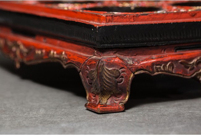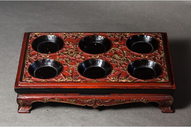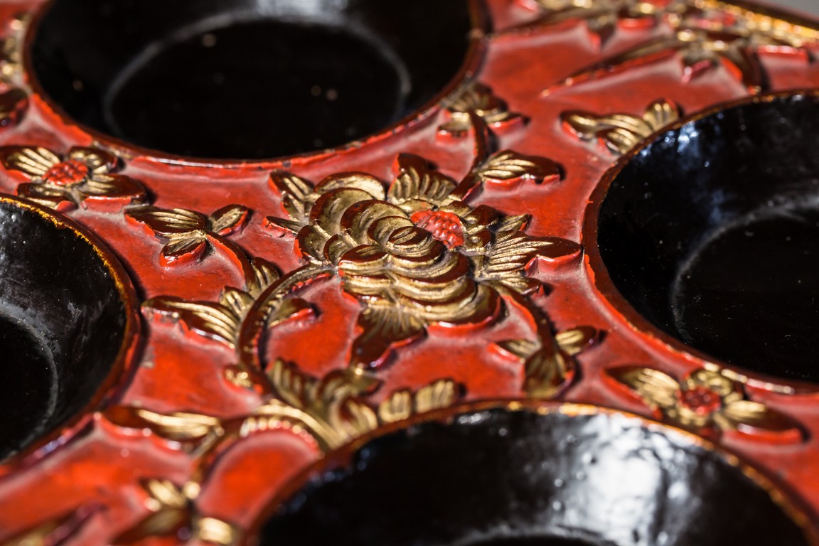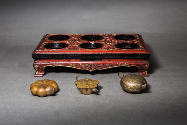 木胎上紅色大漆,漆金,飾有花卉紋,細緻精美,活靈活現。水滴分別為南瓜形、蓮蓬形、扁圓形;分別飾螳螂紋、年年有餘紋、花鳥紋;款識分別為“榮寶齋”、“古月軒”、“白石”。