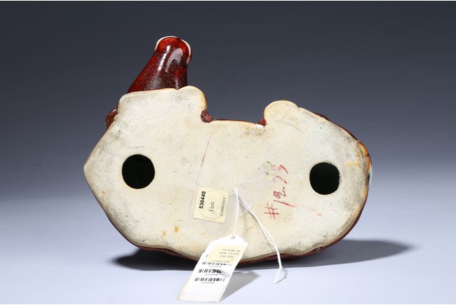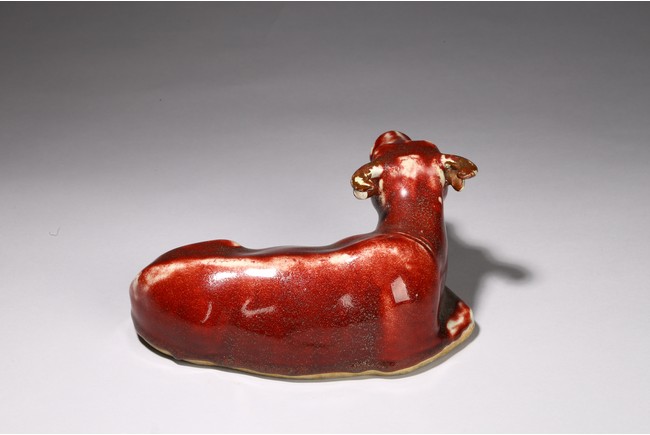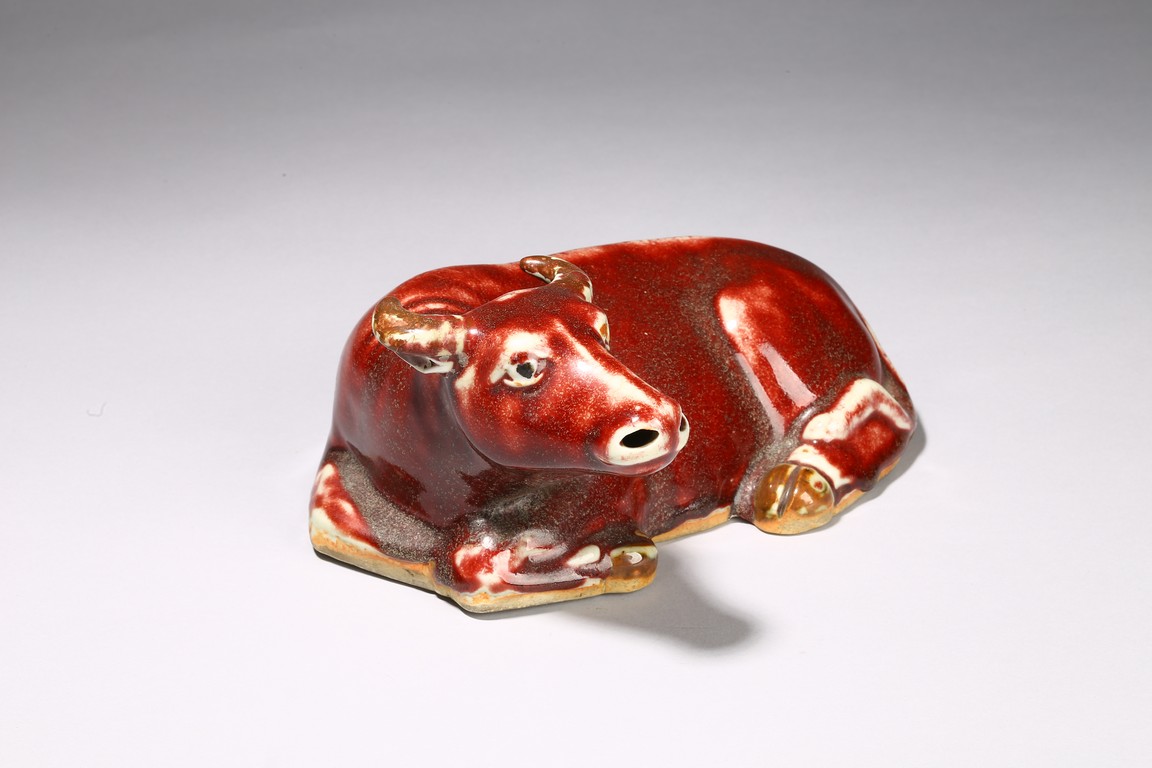 Of recumbent bull with its legs bent to one side,bulging eyes and powerful nose, its tail curled alongside its left haunch. The body applied with flambe glaze, in some creamy-white inclusions. Qing Dynasty period.