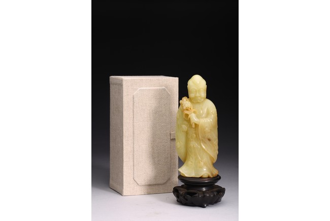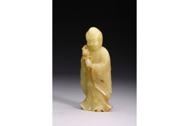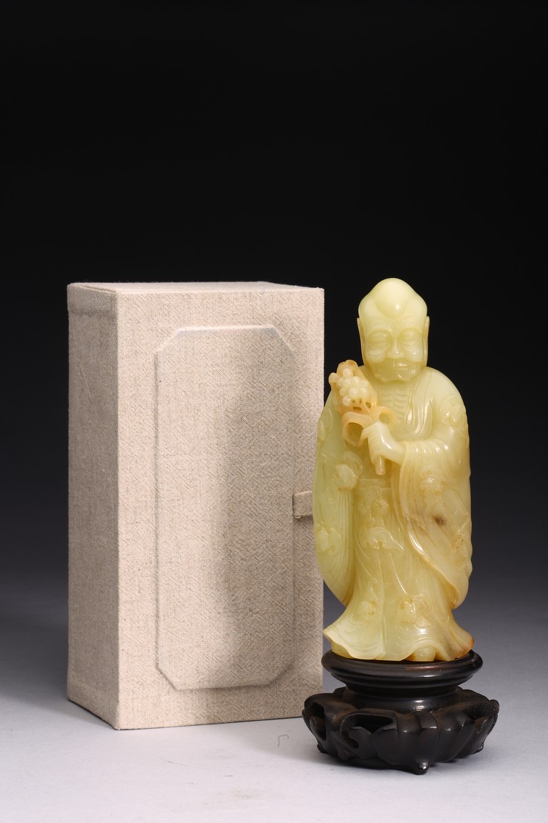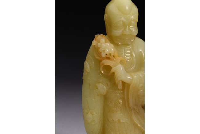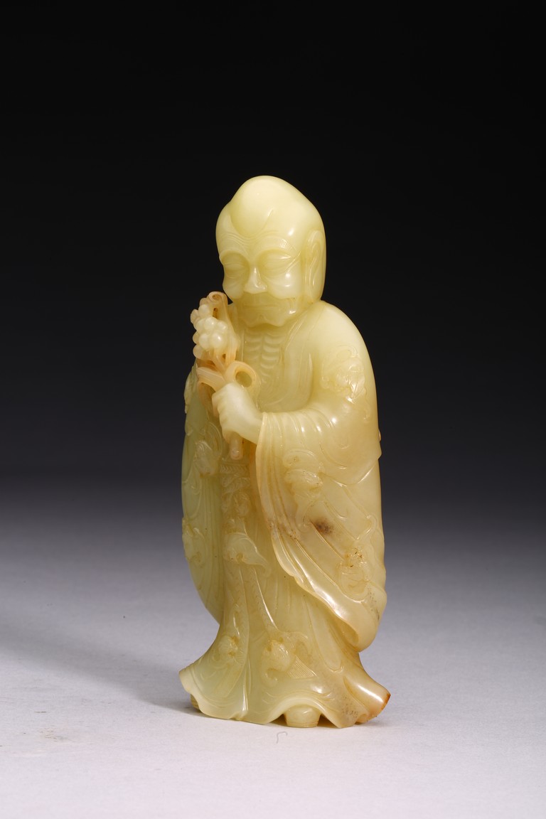 The standing figure wearing loose-fitting robes tied at the waist with long tassel belt, left arm raised and holding a spray of lily, face with wrinkled features and eyes downcast, with bald head and elongated earlobes, the hems of his robe and swarm of auspicious bats finely carved in low relief. Qing Dynasty Qianlong period.