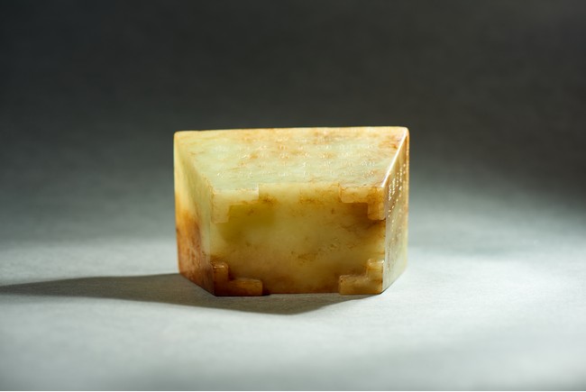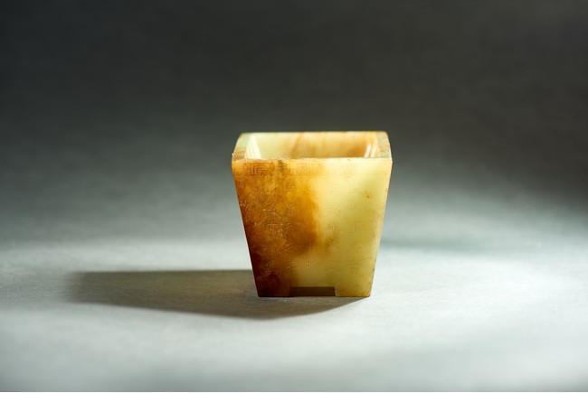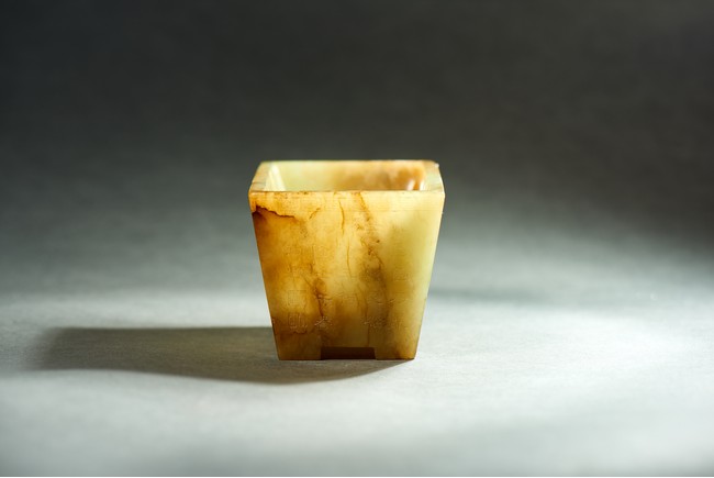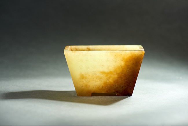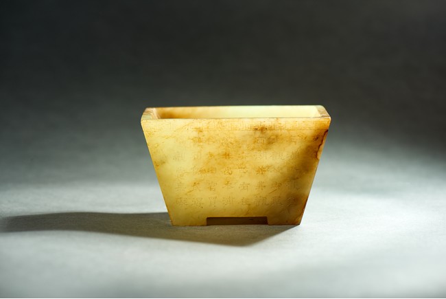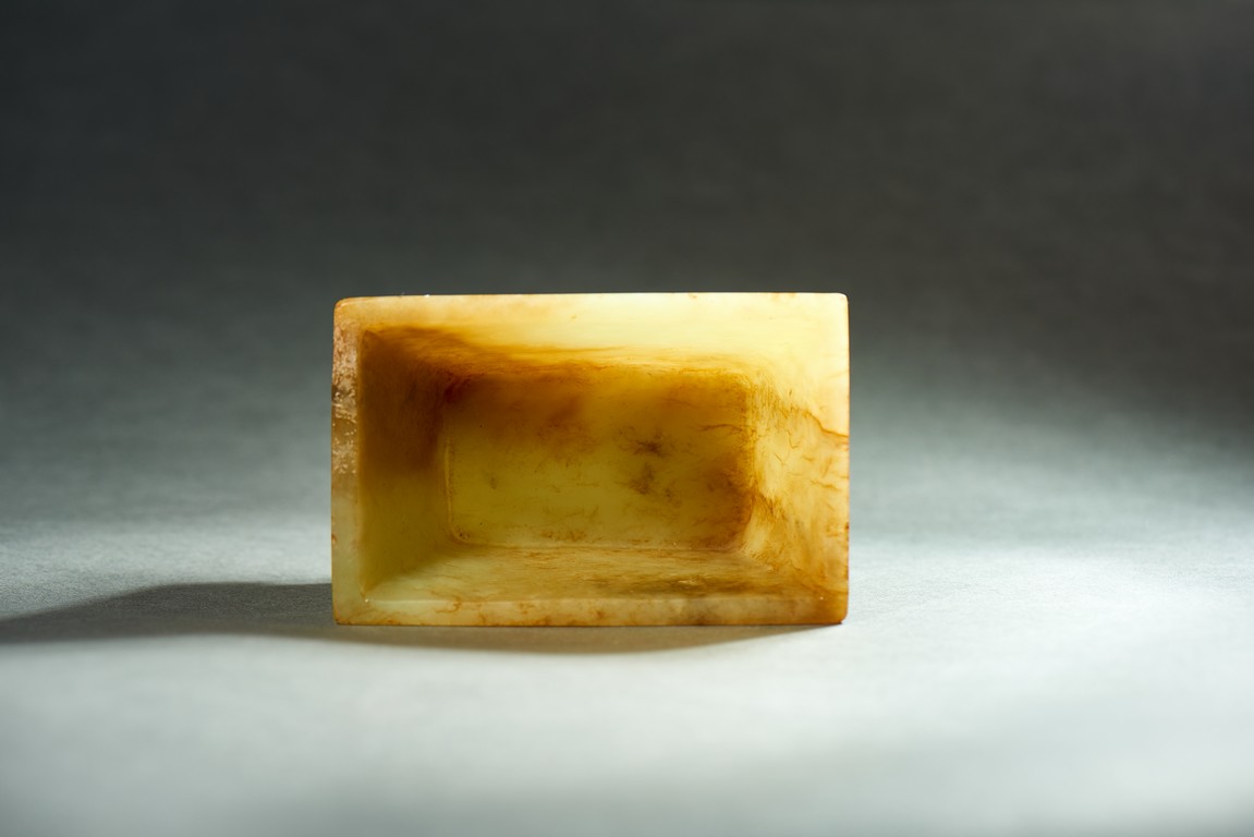 Of trapezoidal square form, carved to the exterior with poem inscription, the stone is of yellowish white tone with dark russet inclusions.